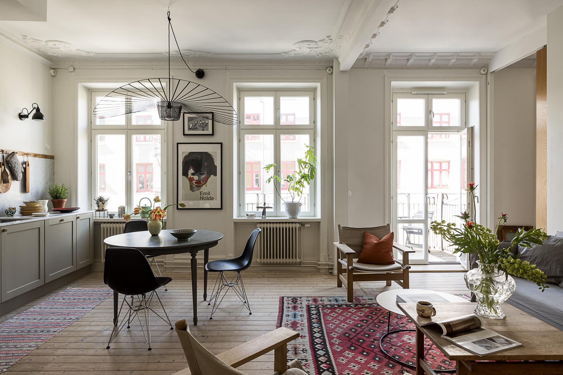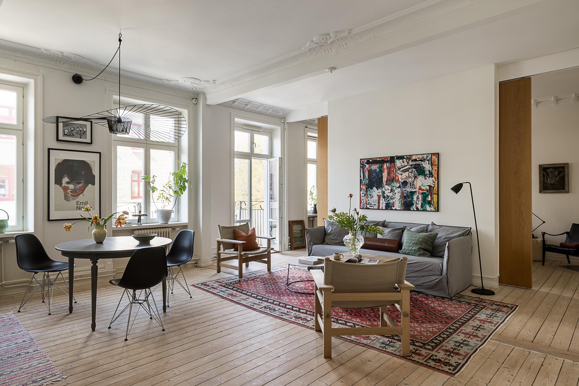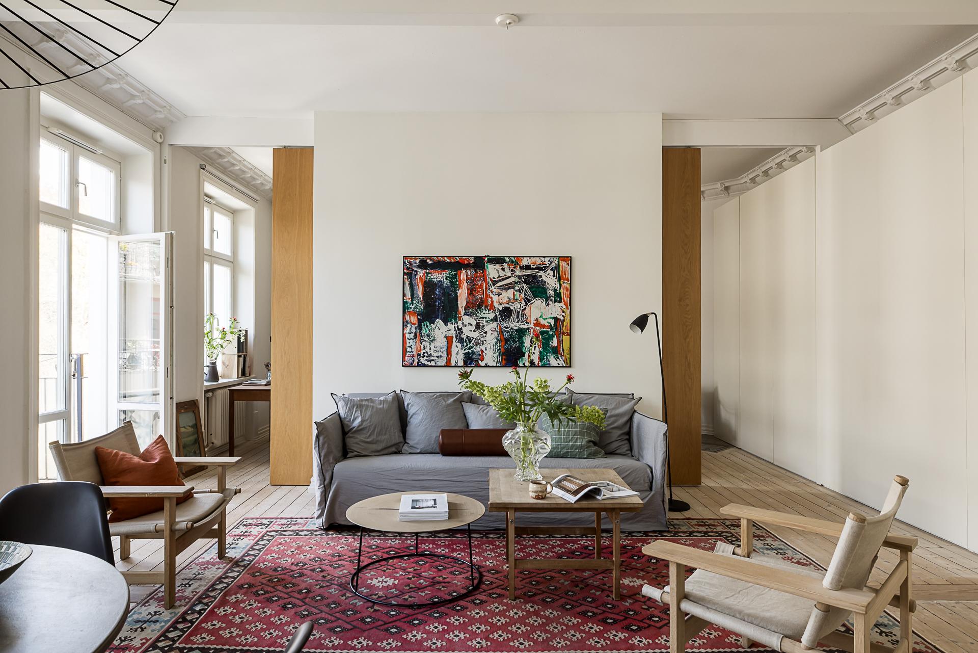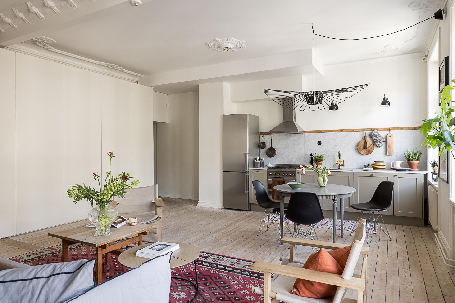 När lägenheten renoverades ville arkitekten skapa en social yta för umgänge genom att integrera köket och vardagsrummet med varandra. Den öppna ytan gör att dessa två rum blir lite av lägenhetens hjärta och det är här man samlas över goda middagar och häng. Ovanligt vacker stuckatur ramar in taket (restaurerad av en stuckatör 2014) och väggarna är målade i samma brutna nyans som i köket. Här ryms en soffgrupp med fotöljer och ett soffbord.