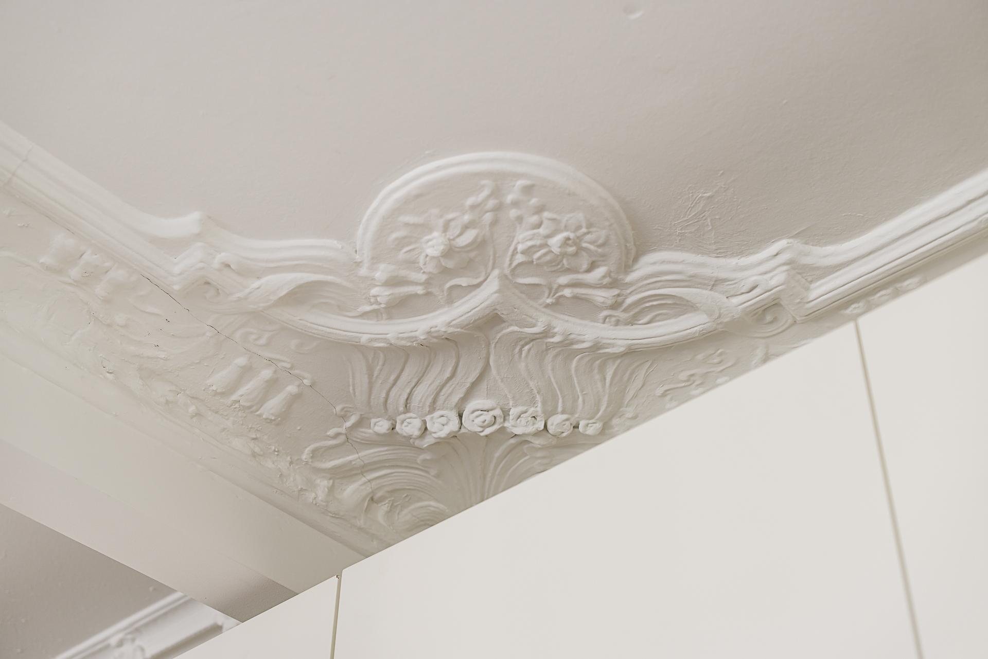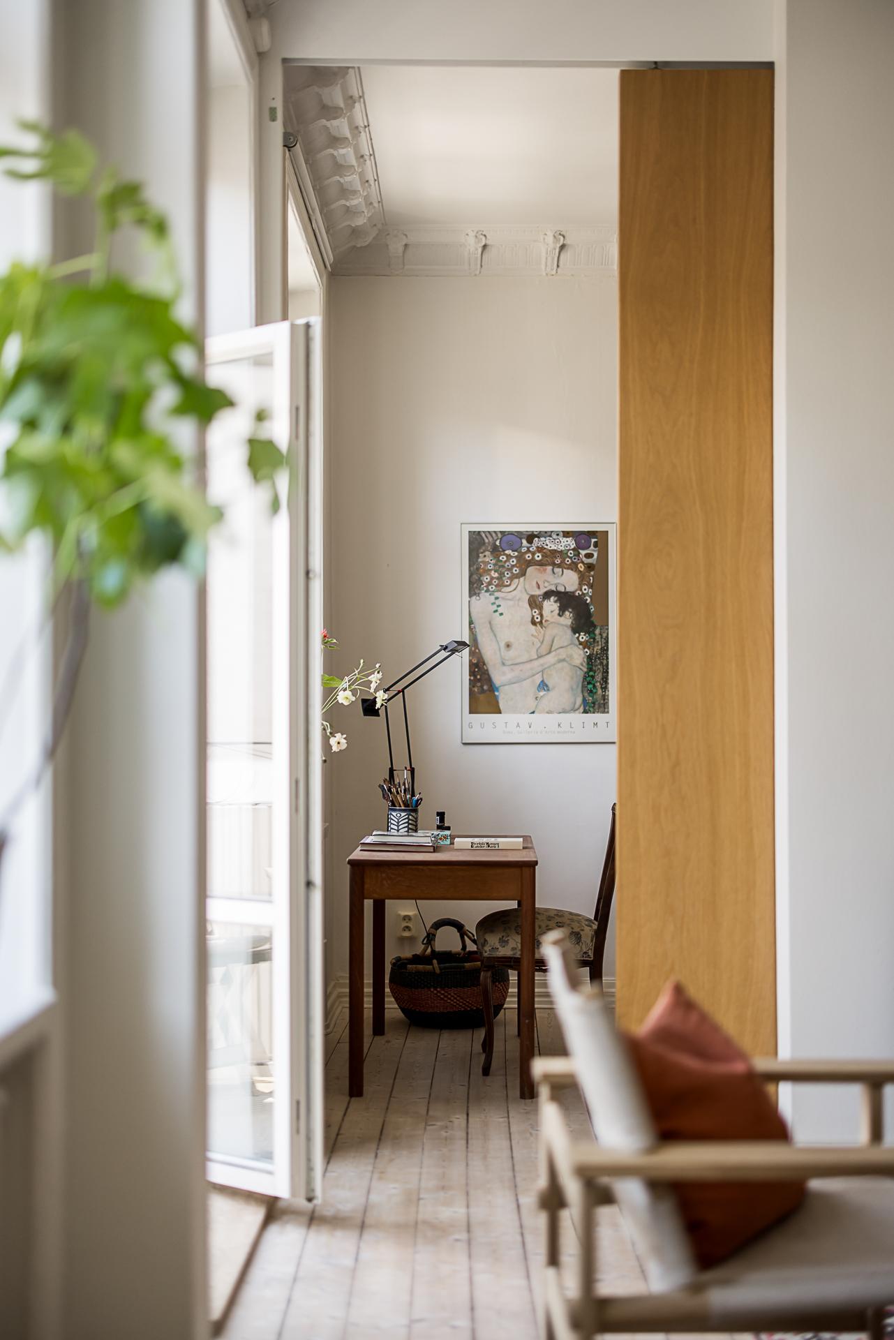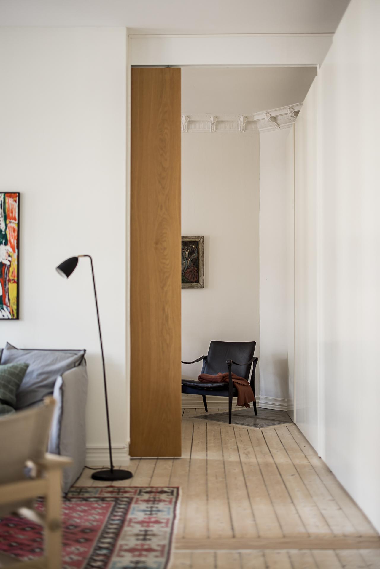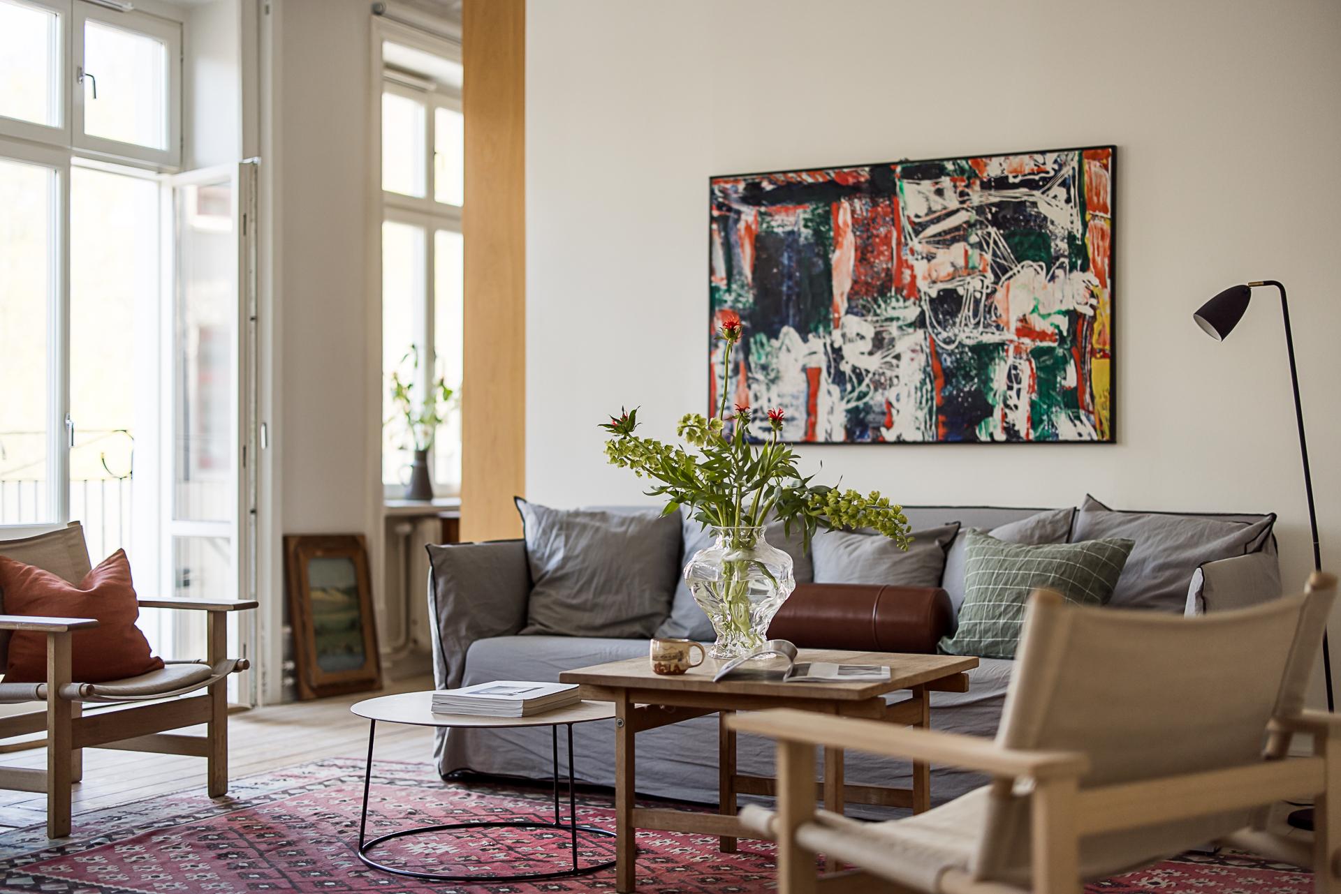 När lägenheten renoverades ville arkitekten skapa en social yta för umgänge genom att integrera köket och vardagsrummet med varandra. Den öppna ytan gör att dessa två rum blir lite av lägenhetens hjärta och det är här man samlas över goda middagar och häng. Ovanligt vacker stuckatur ramar in taket (restaurerad av en stuckatör 2014) och väggarna är målade i samma brutna nyans som i köket. Här ryms en soffgrupp med fotöljer och ett soffbord.