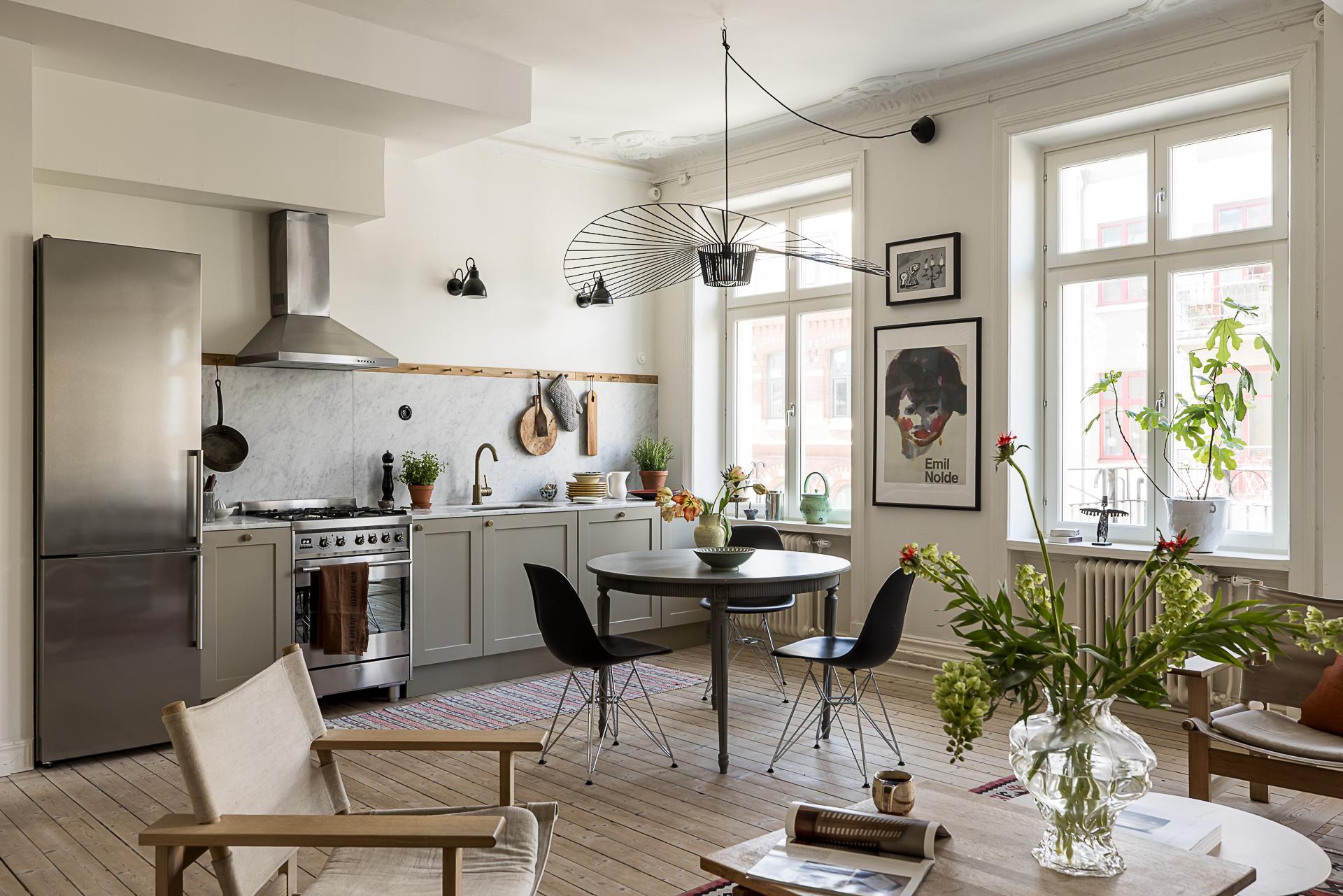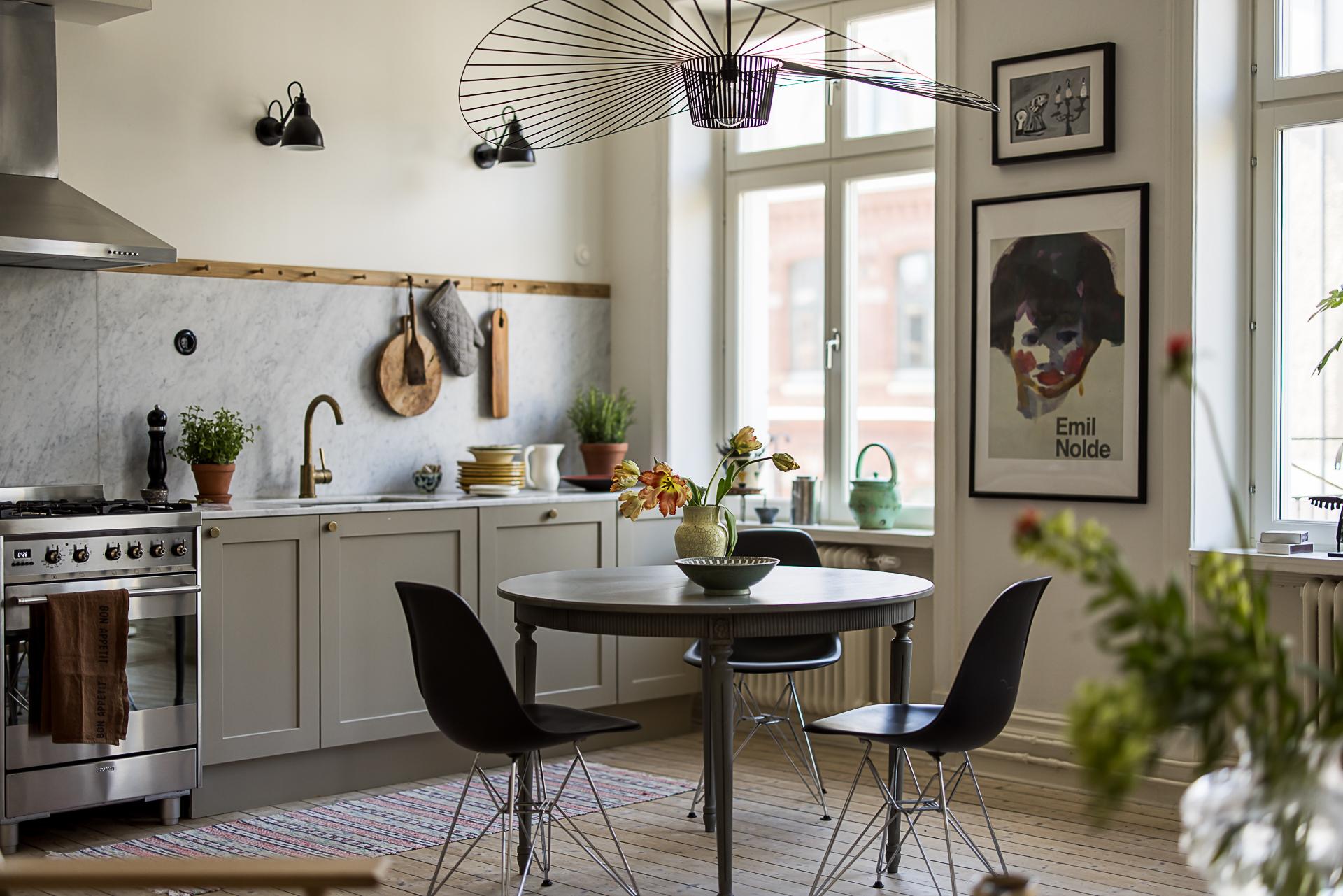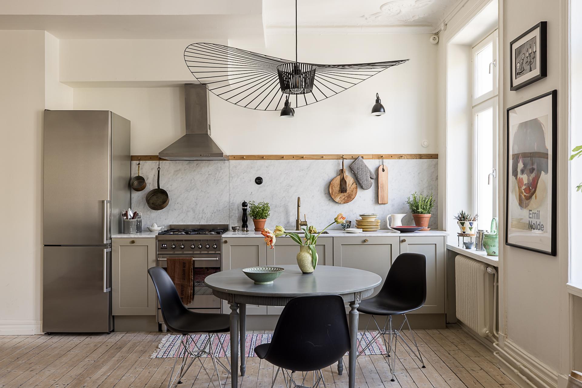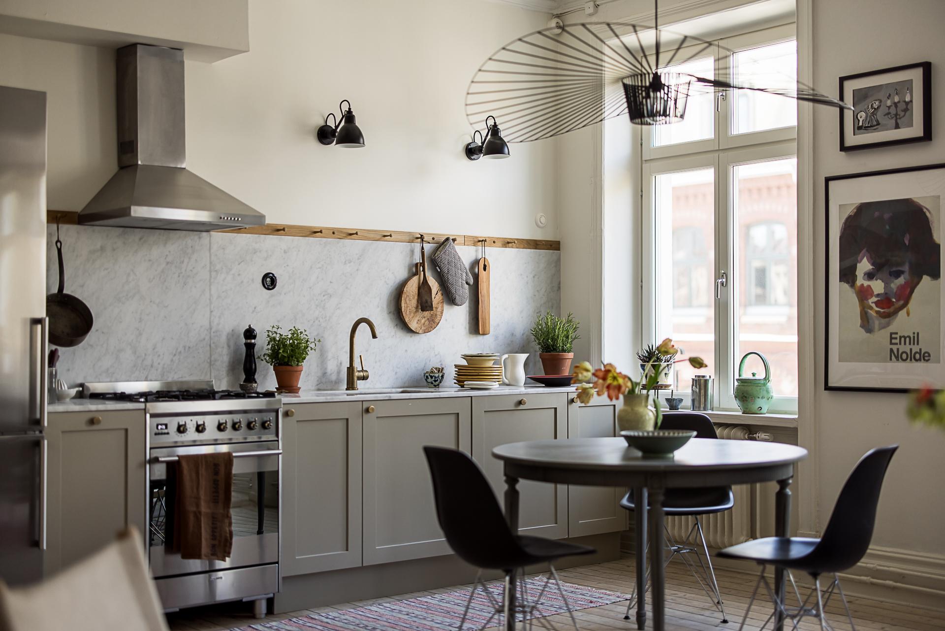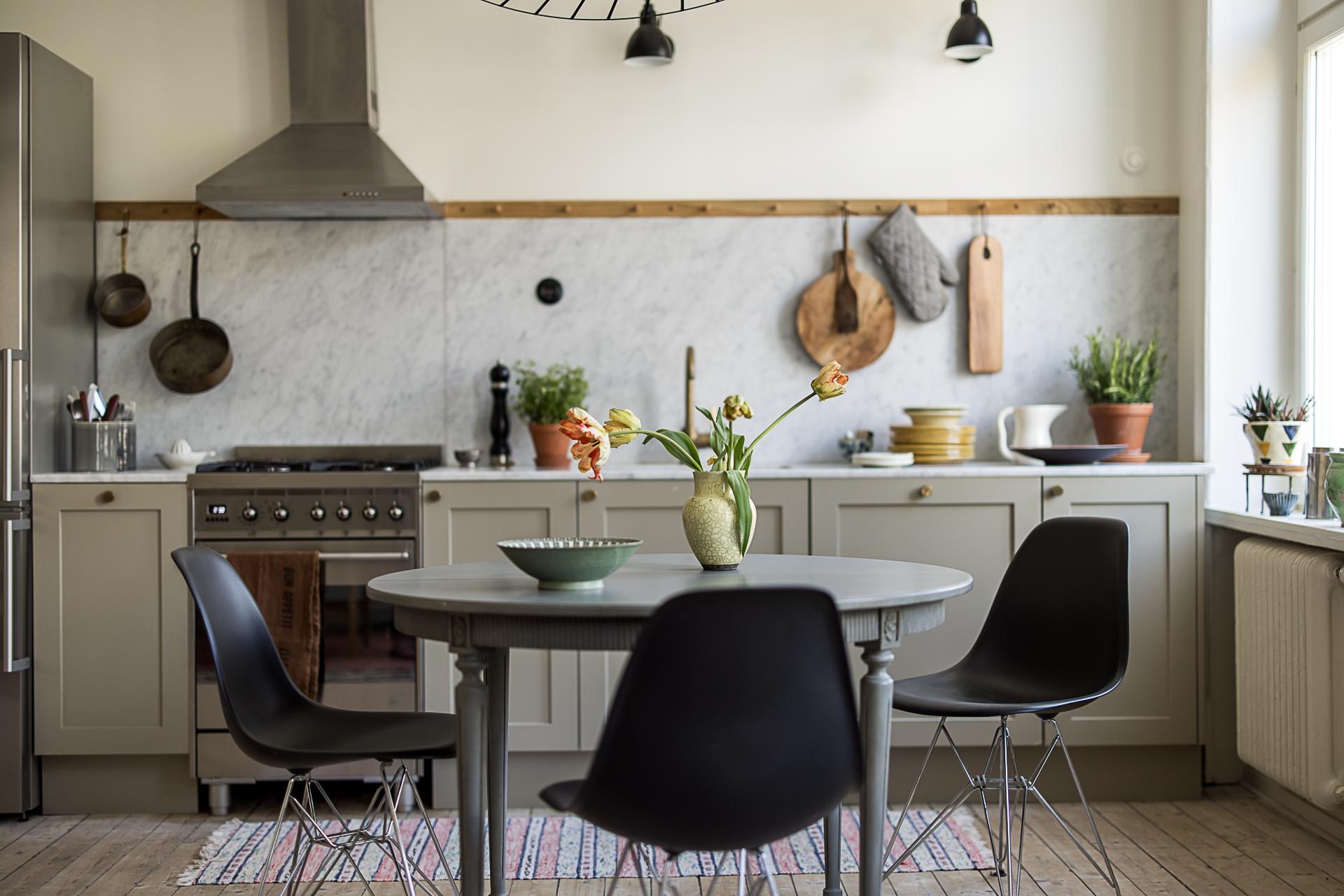Köket som tillsammans med vardagsrummet erbjuder en öppen social planlösning som bokstavligen badar i ljus tack vare den tilltagna takhöjden om dryga tre meter och tre stora fönsterpartier med överljus i västerläge samt utgången till balkongen. Det platsbyggda köket löper längs en av väggarna och blir med sin smakfulla design en möbel i sig. Handmålade profilerade skåpsluckor med färg från Farrow & Ball. Exklusiv Carraramarmor är uppförd som bänkskiva och följer generöst med väggen upp till hälften istället för traditionellt kakel. Avsaknaden av överskåp ger en luftig känsla och de väggfasta lamporna över arbetsbänken från Lampe Gras visar att inget är lämnat år slumpen. Blandare och handtag matchar i matt mässing. Den maskinella utrustningen består av en kyl/frys i rostfritt från Siemens samt en integrerad diskmaskin, även den från Siemens. Du som gillar att laga mat kommer inte bli besviken - här finns också en gasspis med elektrisk ugn från italienska Smeg. Ovanför spisen finns en fläktkåpa i rostfritt. Här finns gott om plats för ett stort matbord. Är man många kan man duka långbord ut i vardagsrummet. Kökets väggar är målade i en bruten vit nyans och golvet pryds av slipat och vitlutat brädgolv av gran där tiden vackert satt sina spår.