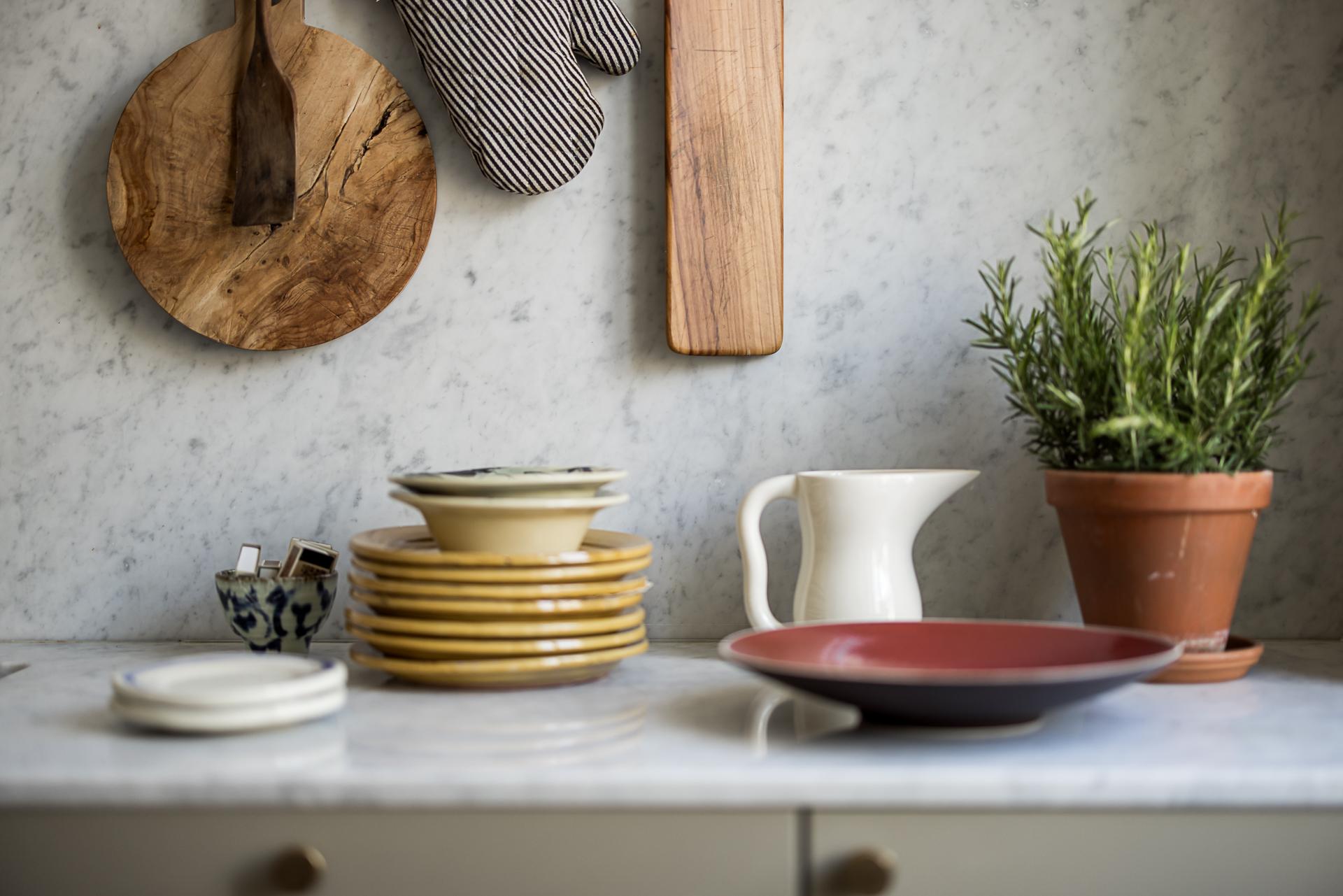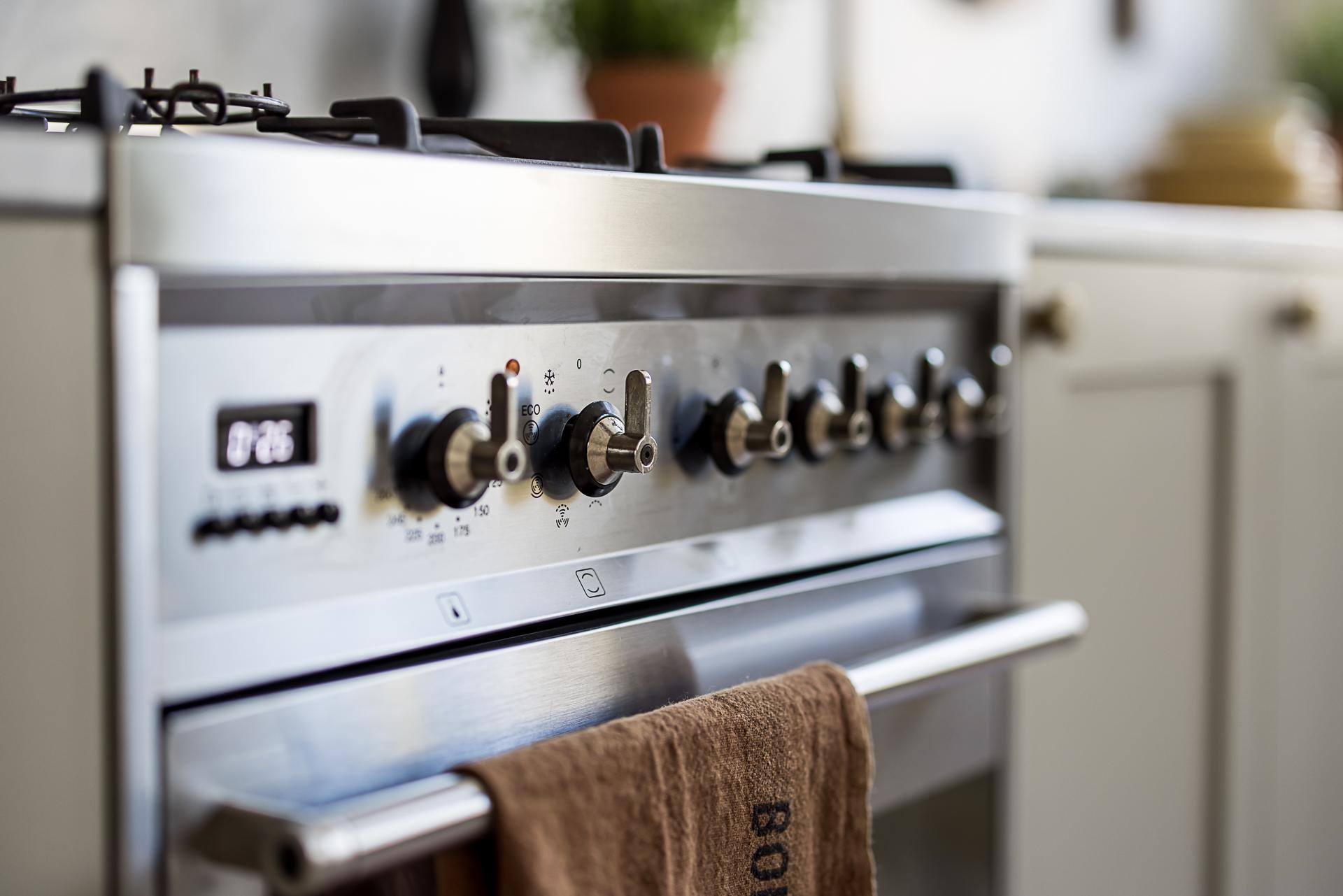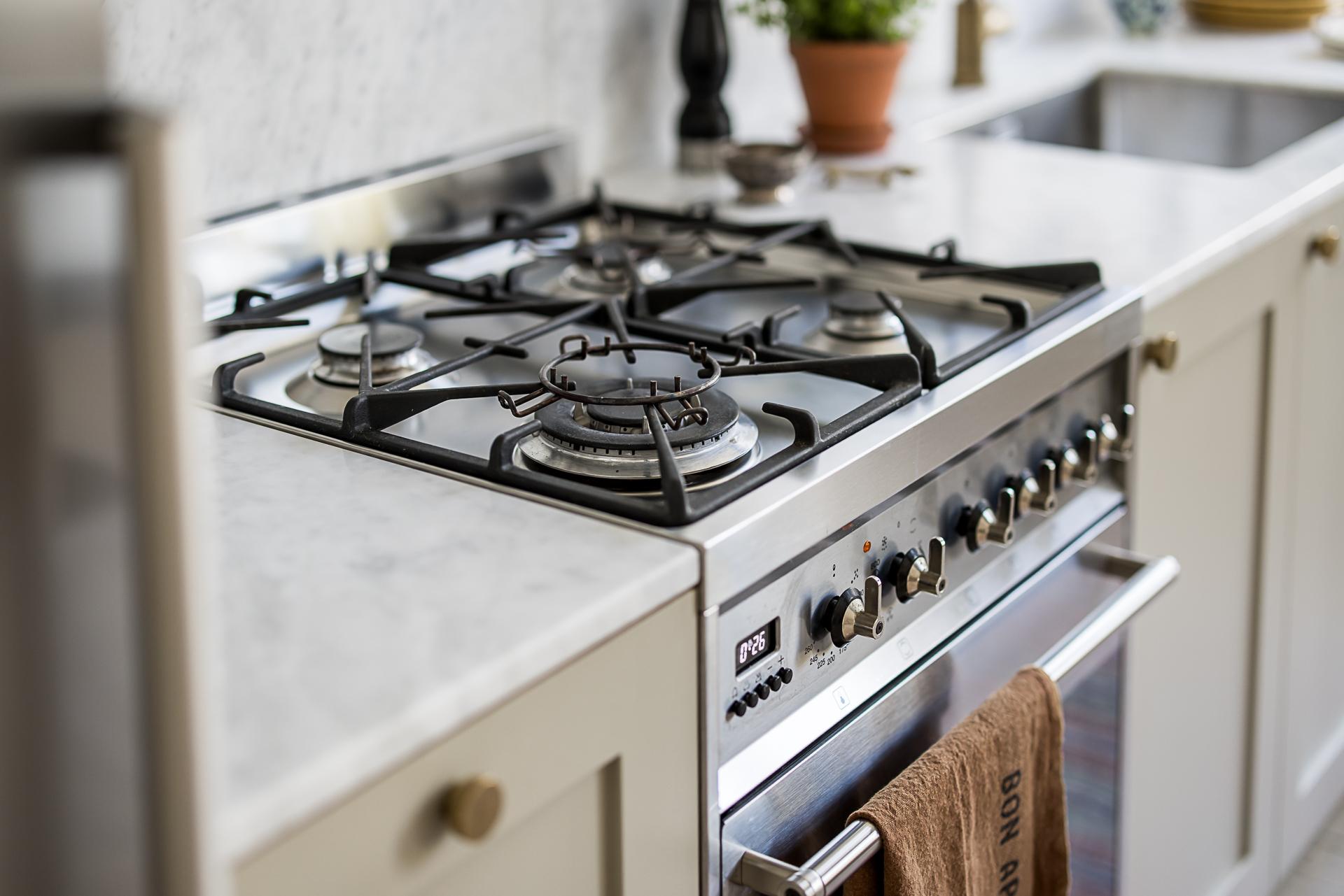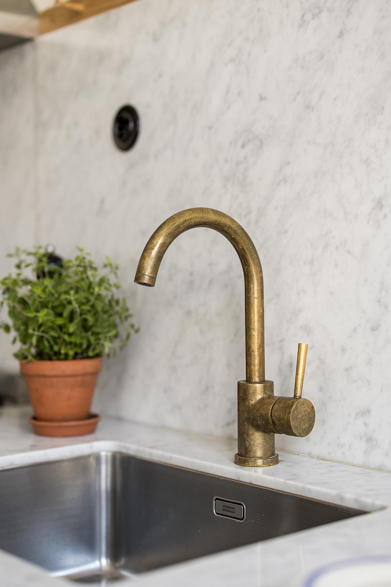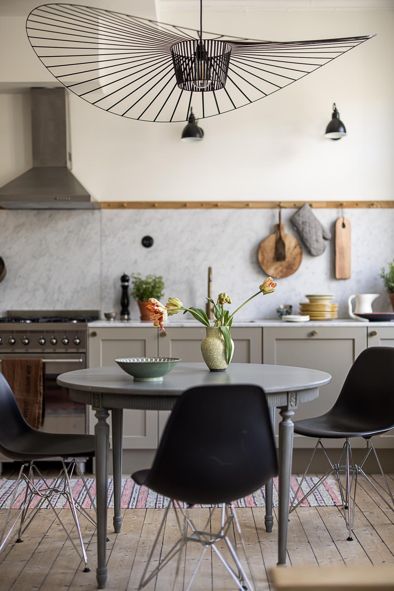 Köket som tillsammans med vardagsrummet erbjuder en öppen social planlösning som bokstavligen badar i ljus tack vare den tilltagna takhöjden om dryga tre meter och tre stora fönsterpartier med överljus i västerläge samt utgången till balkongen. Det platsbyggda köket löper längs en av väggarna och blir med sin smakfulla design en möbel i sig. Handmålade profilerade skåpsluckor med färg från Farrow & Ball. Exklusiv Carraramarmor är uppförd som bänkskiva och följer generöst med väggen upp till hälften istället för traditionellt kakel. Avsaknaden av överskåp ger en luftig känsla och de väggfasta lamporna över arbetsbänken från Lampe Gras visar att inget är lämnat år slumpen. Blandare och handtag matchar i matt mässing. Den maskinella utrustningen består av en kyl/frys i rostfritt från Siemens samt en integrerad diskmaskin, även den från Siemens. Du som gillar att laga mat kommer inte bli besviken - här finns också en gasspis med elektrisk ugn från italienska Smeg. Ovanför spisen finns en fläktkåpa i rostfritt. Här finns gott om plats för ett stort matbord. Är man många kan man duka långbord ut i vardagsrummet. Kökets väggar är målade i en bruten vit nyans och golvet pryds av slipat och vitlutat brädgolv av gran där tiden vackert satt sina spår.