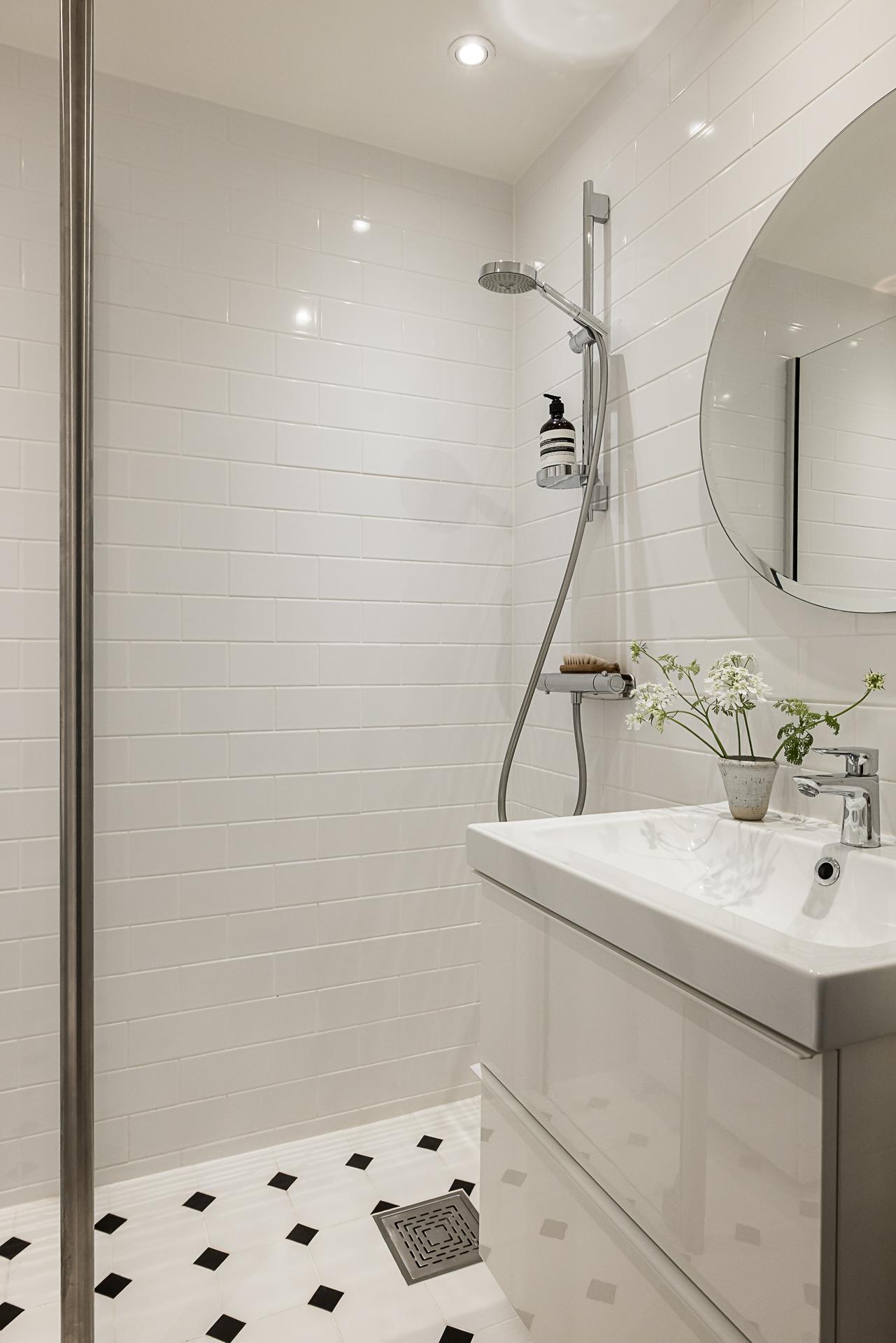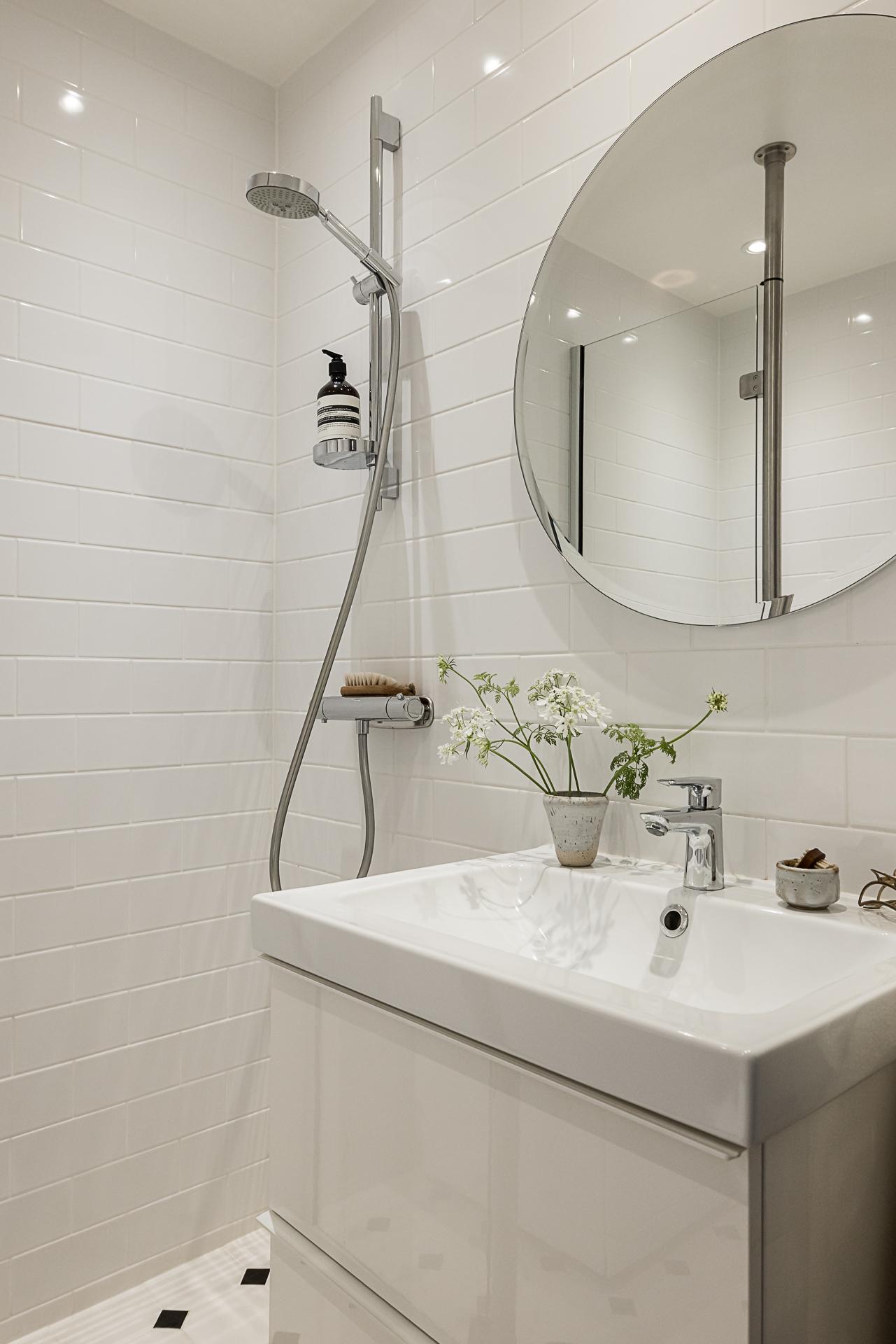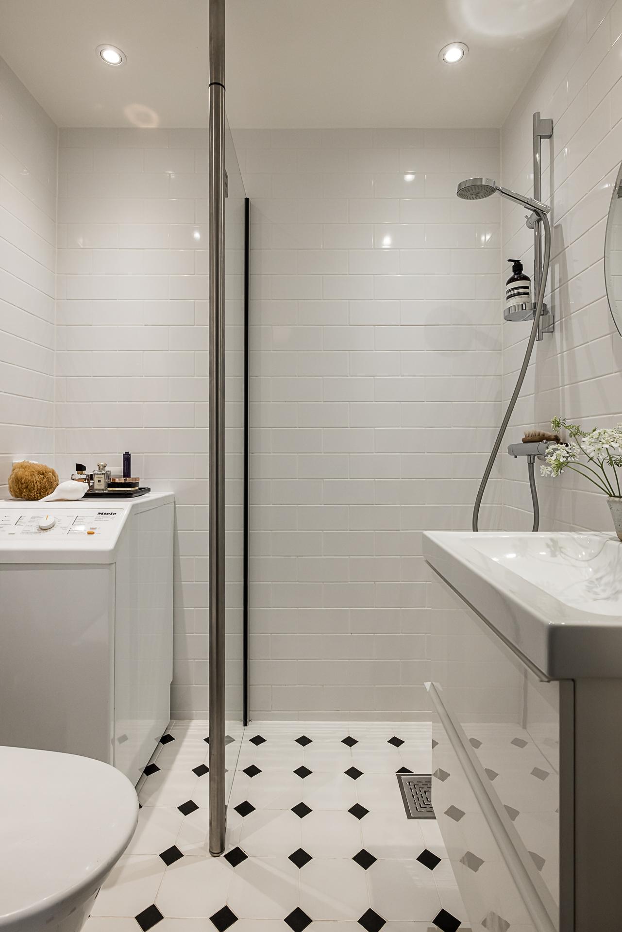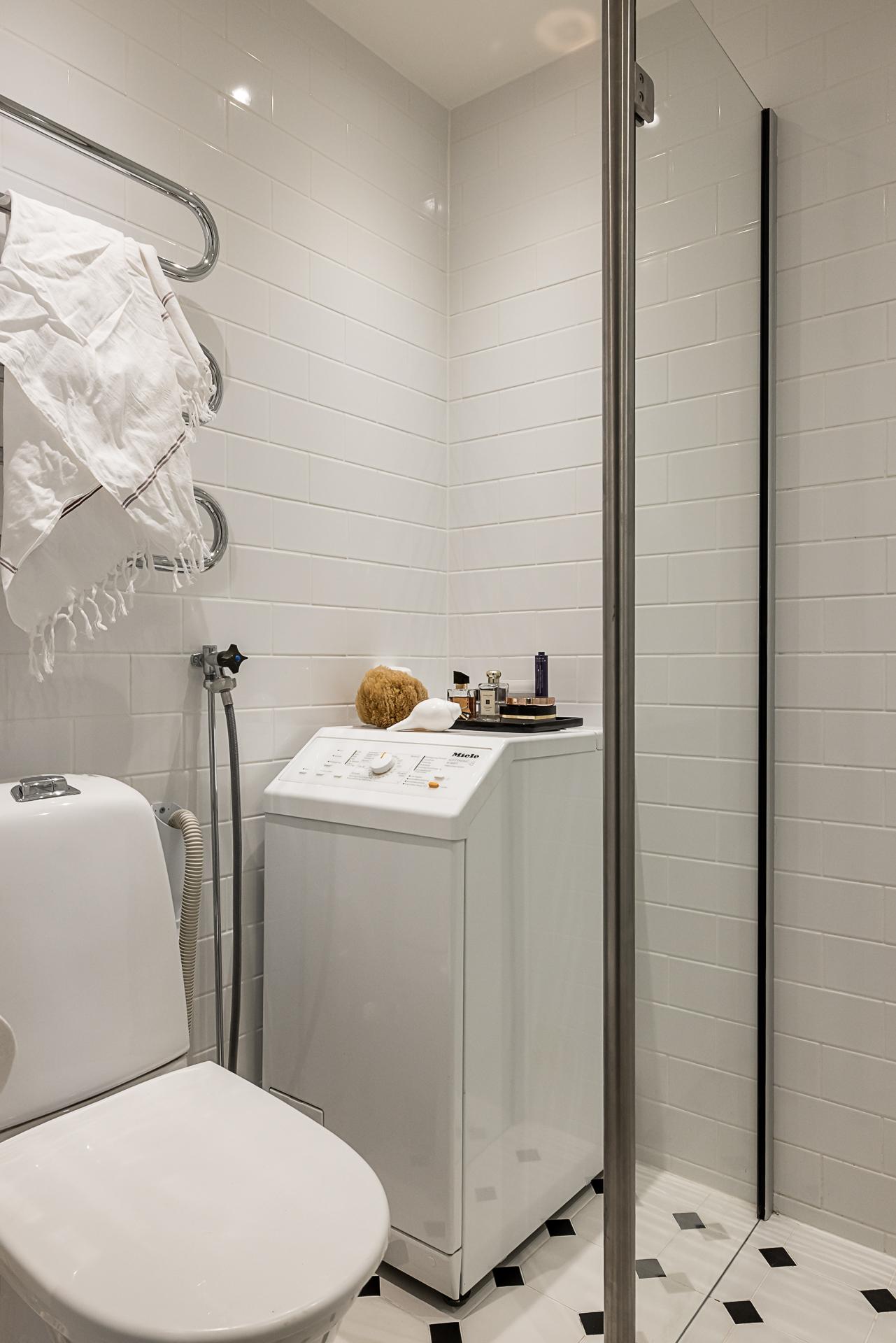 I anslutning till hallen ligger badrummet som är nyrenoverat av fackmän så sent som i september 2019. Väggarna är helkaklade i vitt med vita fogar och på golvet ligger ett fint klinkergolv i sann "Victorian floor tile” stil med underliggande värmeslingor. Till höger finns ett rektangulärt handfat med en vit kommod under samt en översittande spegel. Intill kommoden finns en dusch som avskärmar tvättmaskinen genom en fast glasvägg. På motsatt sida finns en wc-stol med översittande handdukshängare. Infällda dimbara spotlights ger en härlig belysning.