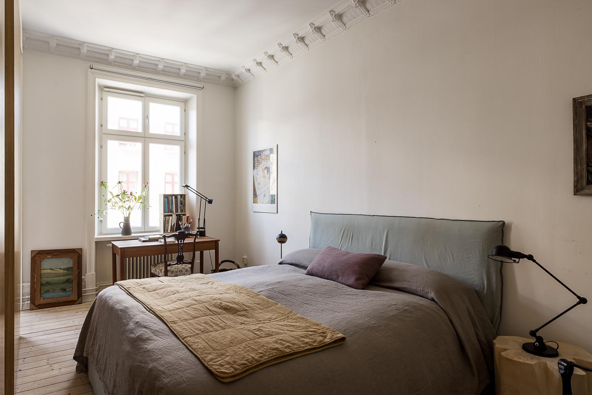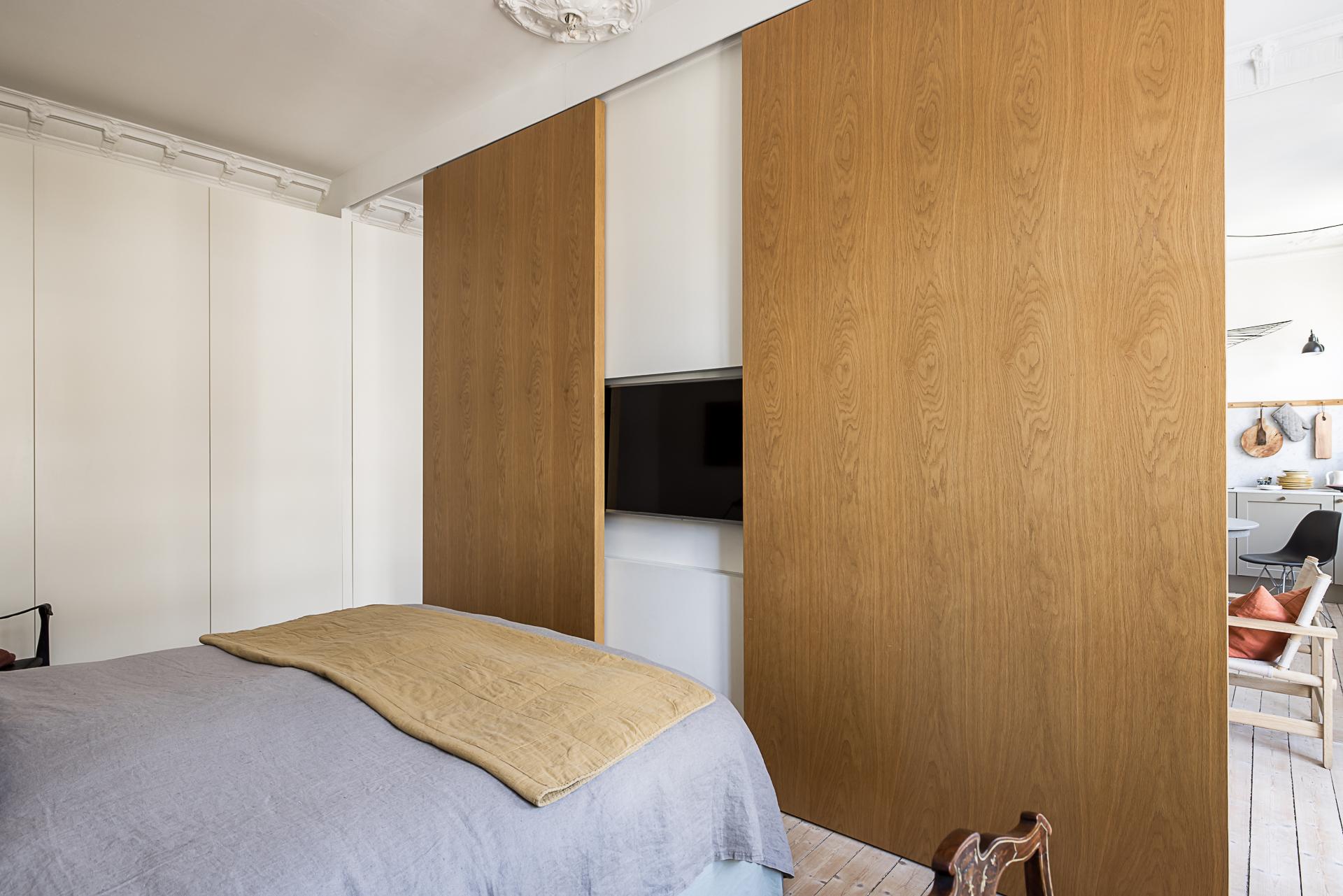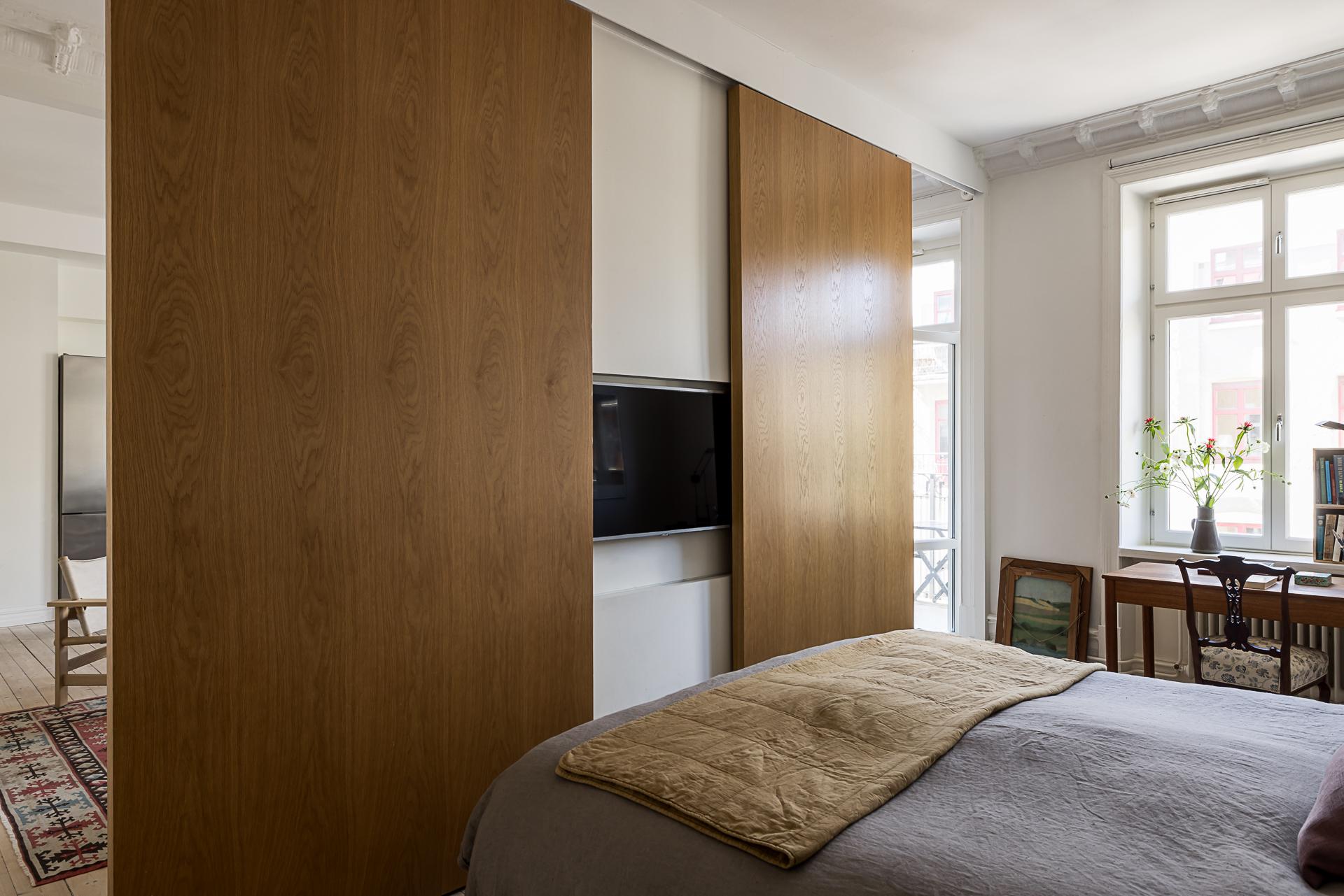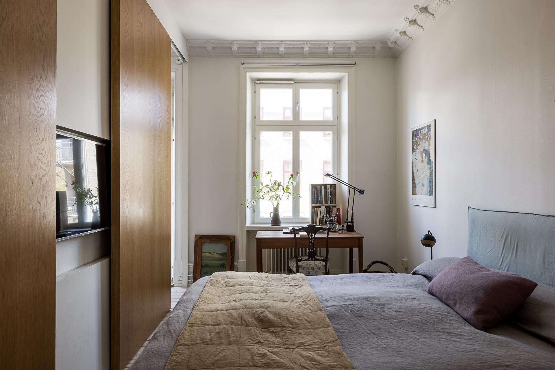 Rymligt sovrum med gott om plats för dubbelsäng och tillhörande nattduksbord. Även en arbetsplats intill fönstret ryms utan problem. I samband med renoveringen valde man att dela av mot vardagsrummet genom en fast vägg i mitten och en skjutdörr på var sida i massiv ek som ger möjligheten att stänga om sig helt. I väggen finns inbyggd elektricitet som gör det enkelt att sätta upp en tv och övrig mediautrustning helt utan synliga sladdar. Underbart ljusinsläpp och vy över lugna Kastellgatan. Rökkanalen finns kvar efter den borttagna kakelugnen i sovrummet vilket ger möjligheten att sätta in en ny om så önskas (grannen under har sin kakelugn kvar). Förvaringen ombesörjs genom tio platsbyggda garderober i vitt från golv till tak som löper längs hela väggen från köket in till sovrummet.