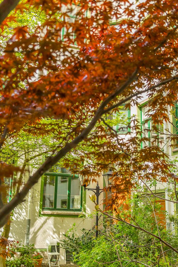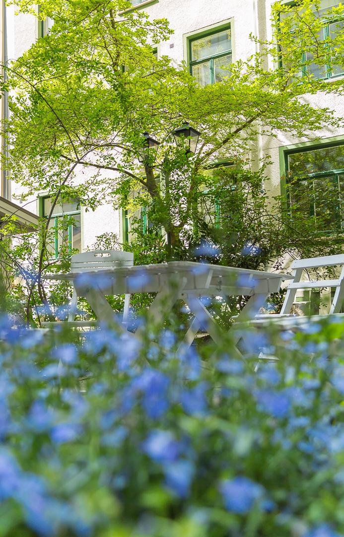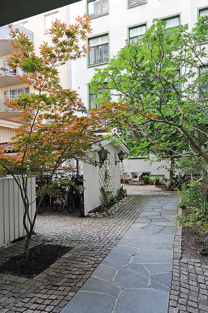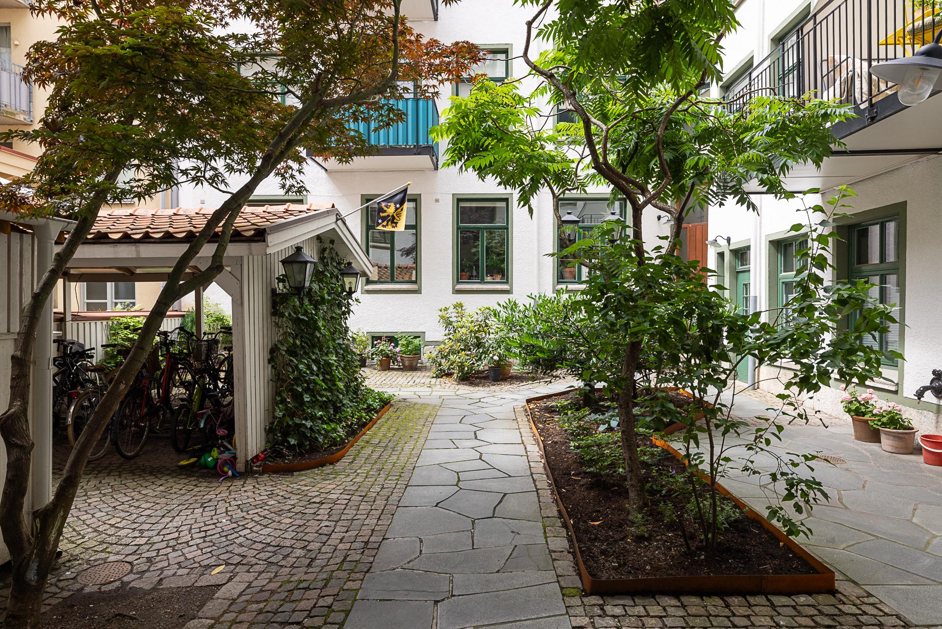Innergården förtjänar nästan ett eget kapitel. Lummig är bara början. Under sommaren förvandlas den till en grönskande oas där grannar samlas för grillkvällar och lata eftermiddagar. Trots läget bara ett kvarter från Övre Husargatans puls råder här ett påtagligt lugn. Med sina träd, planteringar, kullersten, utemöbler och den putsade fasaden med gröna fönsterbågar känns det nästan mer som en innergård i Sydeuropa än mitt i vårt älskade Göteborg.