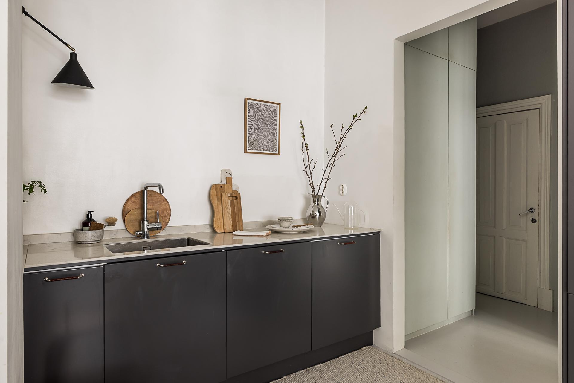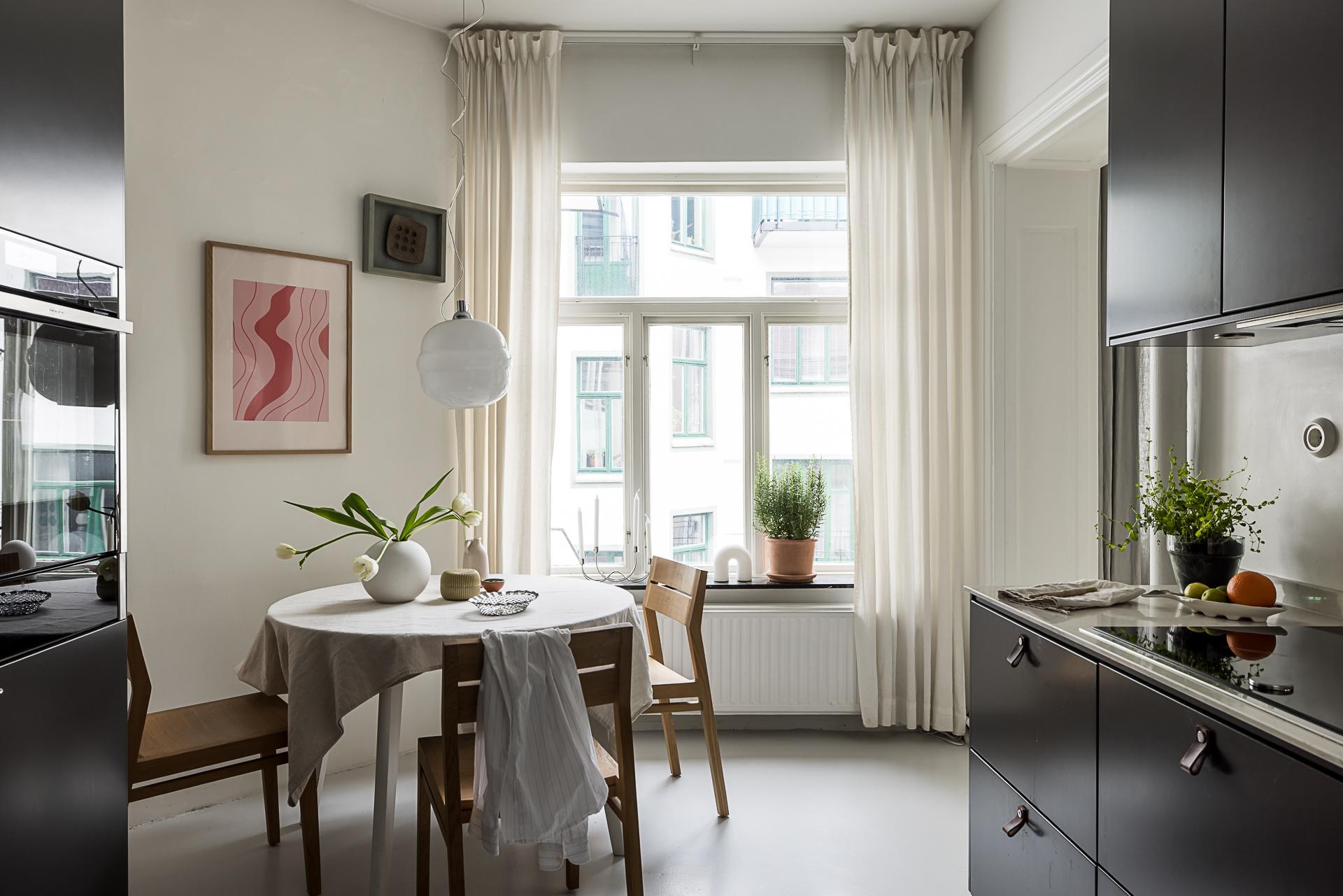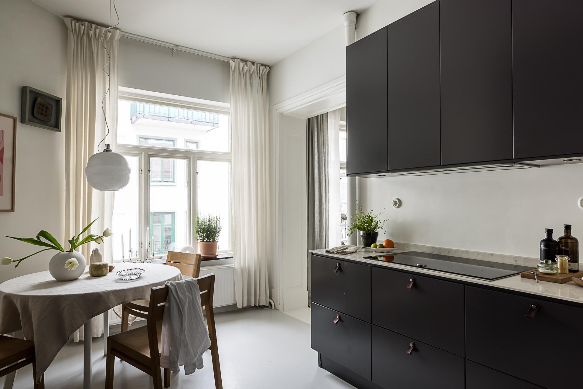 I Linnéstaden kan man införskaffa de bästa råvarorna då kvarteret präglas av småskalighet och nischade butiker. Då är det en stor fördel att köket är renoverat och erbjuder goda förvaringsmöjligheter i form av mörkgrå över- och underskåp samt goda arbetsytor. Köksinredning från Ballingslöv och den maskinella utrustningen består av induktionshäll, värmelåda och ångugn från Neff, kyl, frys och diskmaskin från Siemens. Arbetsbänk i snygg komposit och materialen i köket känns tidlösa. Ljusinsläppet kommer från det breda fönstret med utsikt mot den lugna innergården. Golvet är målad betong.