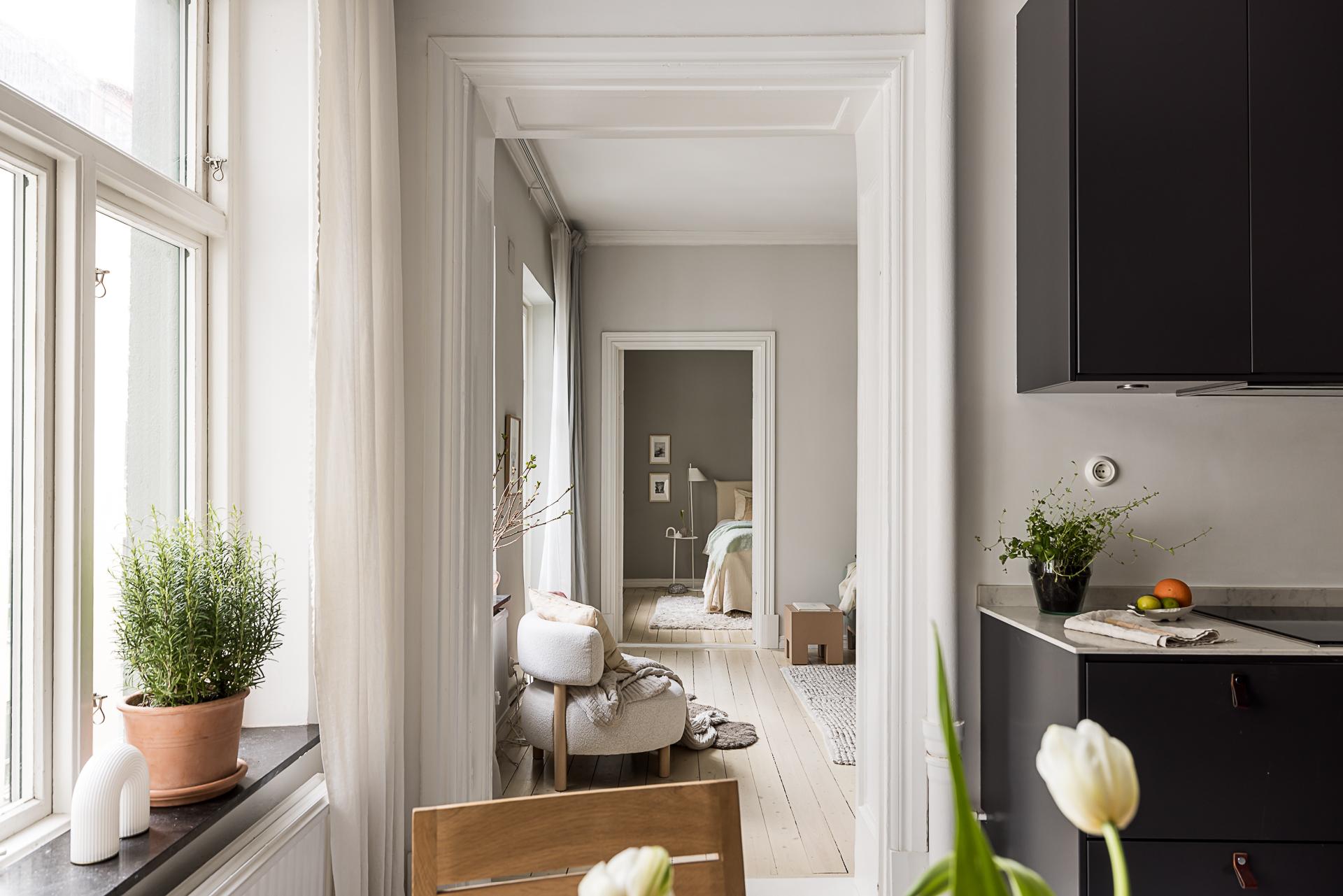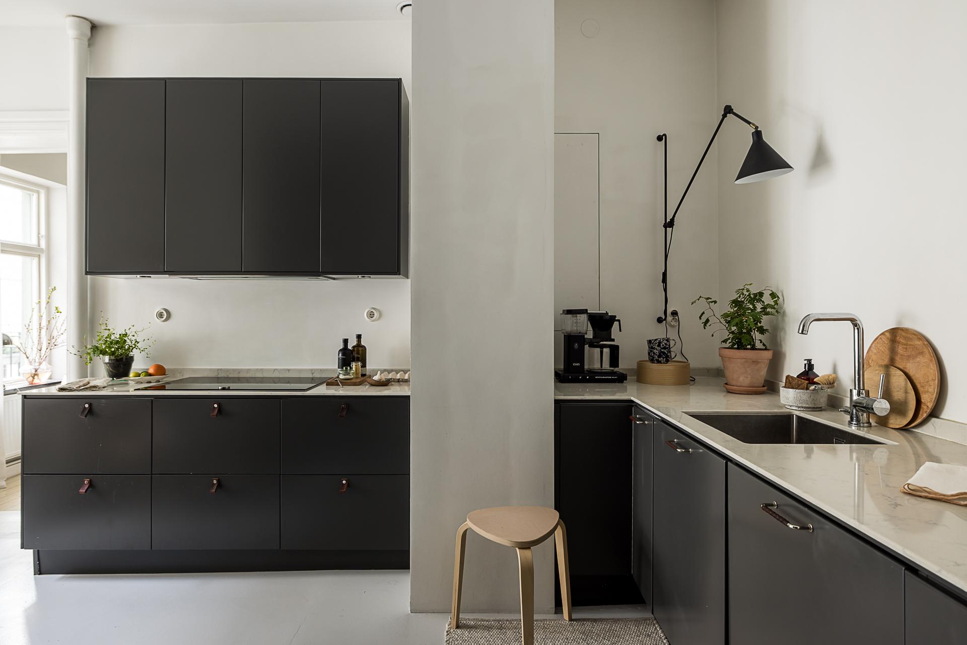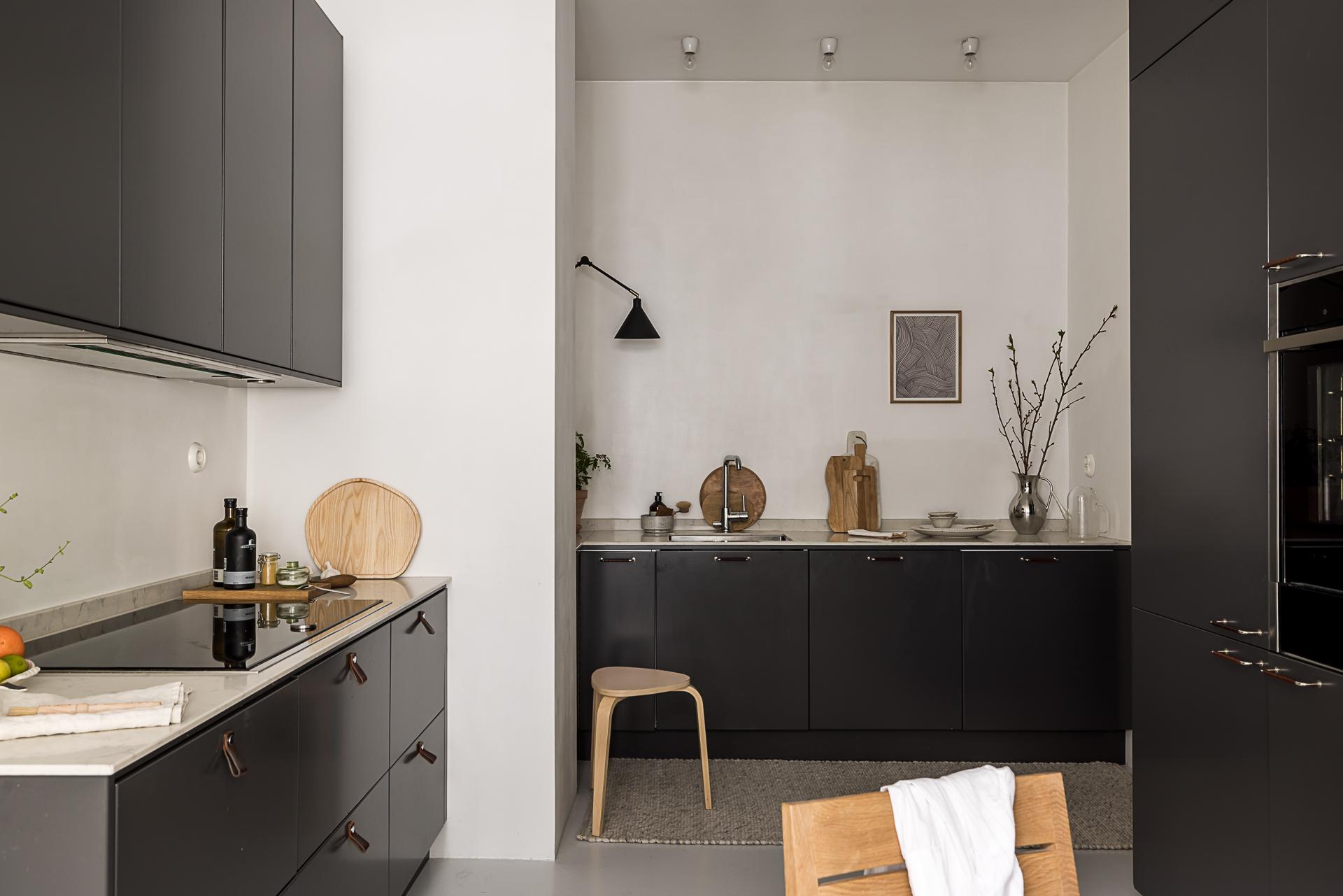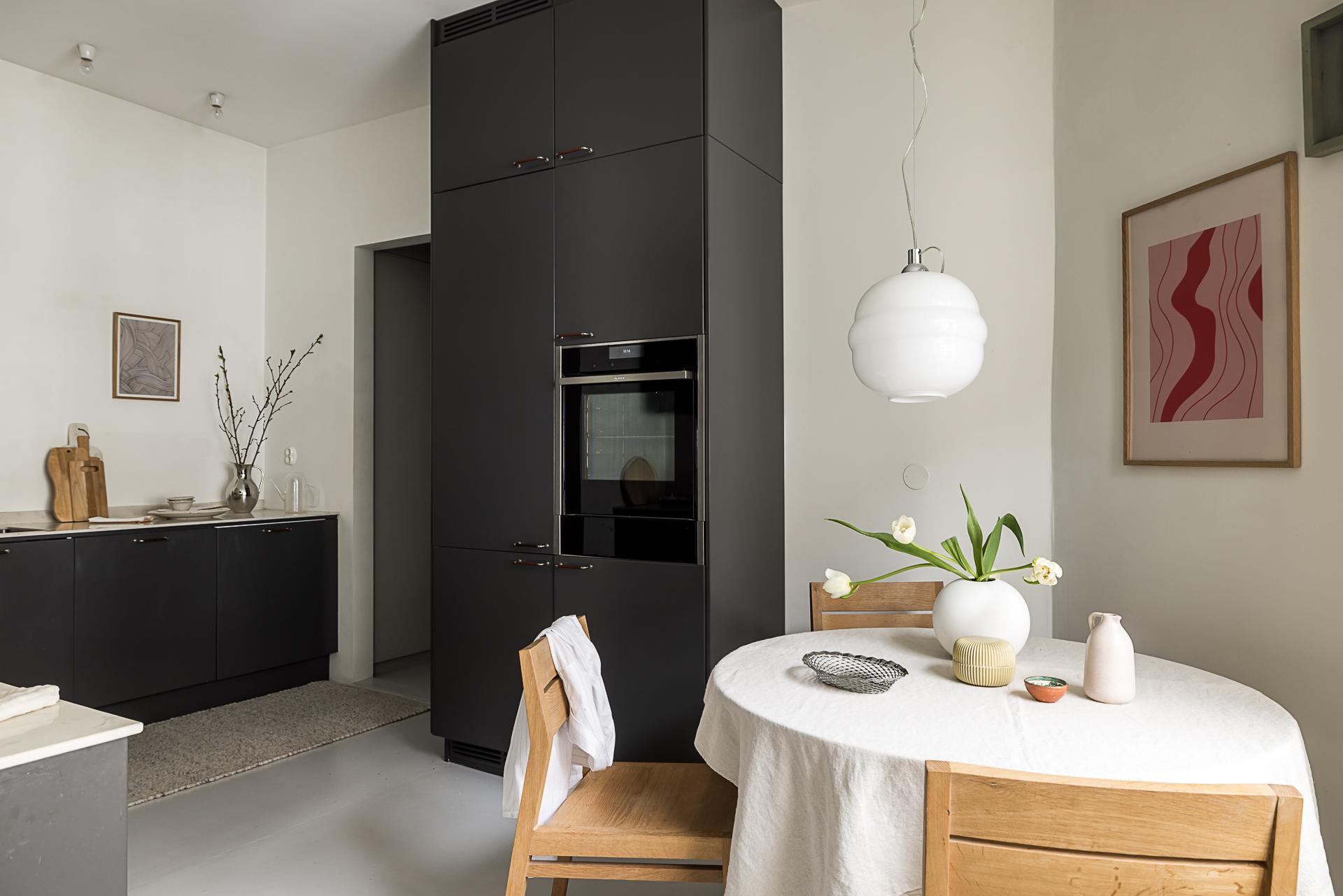 I Linnéstaden kan man införskaffa de bästa råvarorna då kvarteret präglas av småskalighet och nischade butiker. Då är det en stor fördel att köket är renoverat och erbjuder goda förvaringsmöjligheter i form av mörkgrå över- och underskåp samt goda arbetsytor. Köksinredning från Ballingslöv och den maskinella utrustningen består av induktionshäll, värmelåda och ångugn från Neff, kyl, frys och diskmaskin från Siemens. Arbetsbänk i snygg komposit och materialen i köket känns tidlösa. Ljusinsläppet kommer från det breda fönstret med utsikt mot den lugna innergården. Golvet är målad betong.