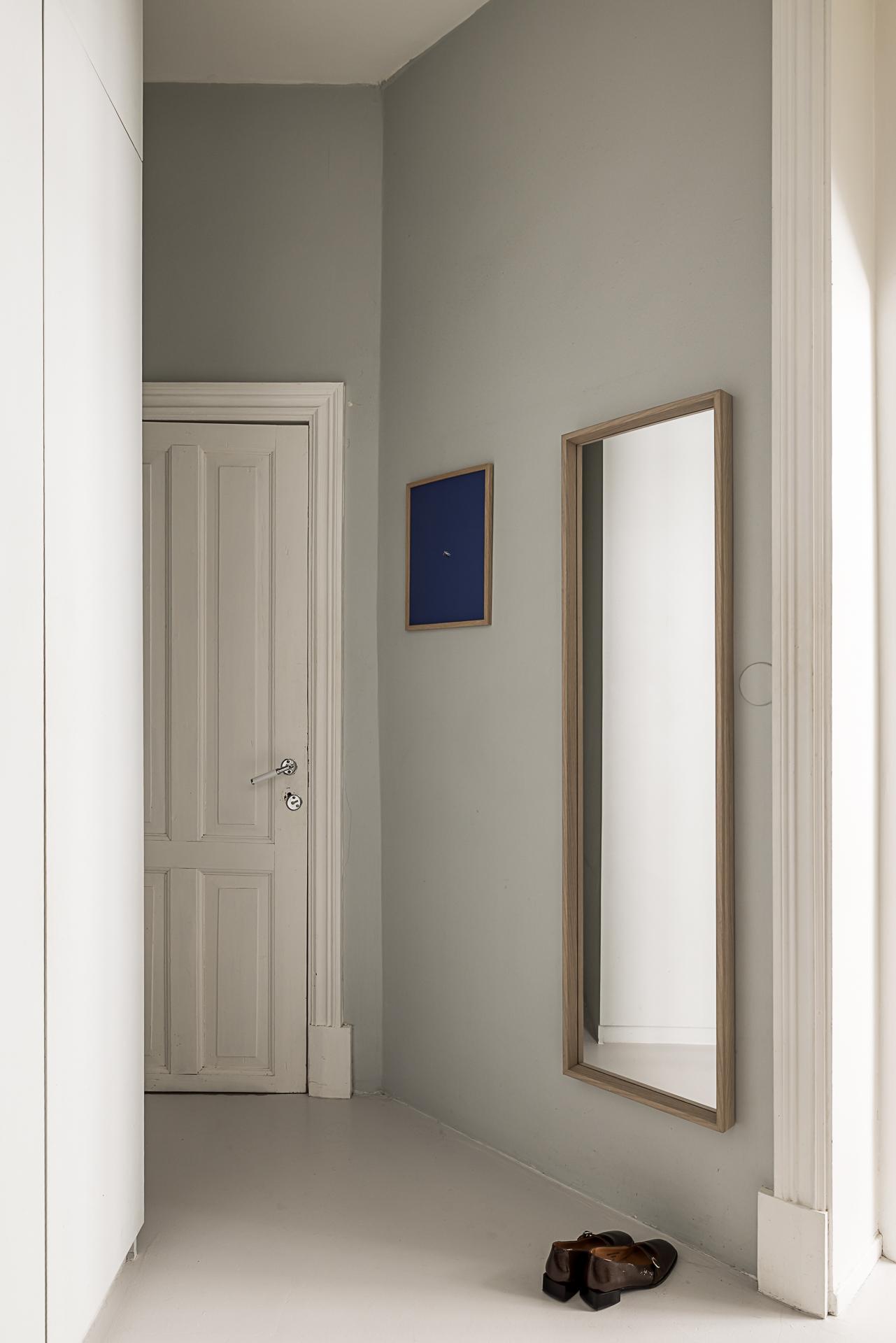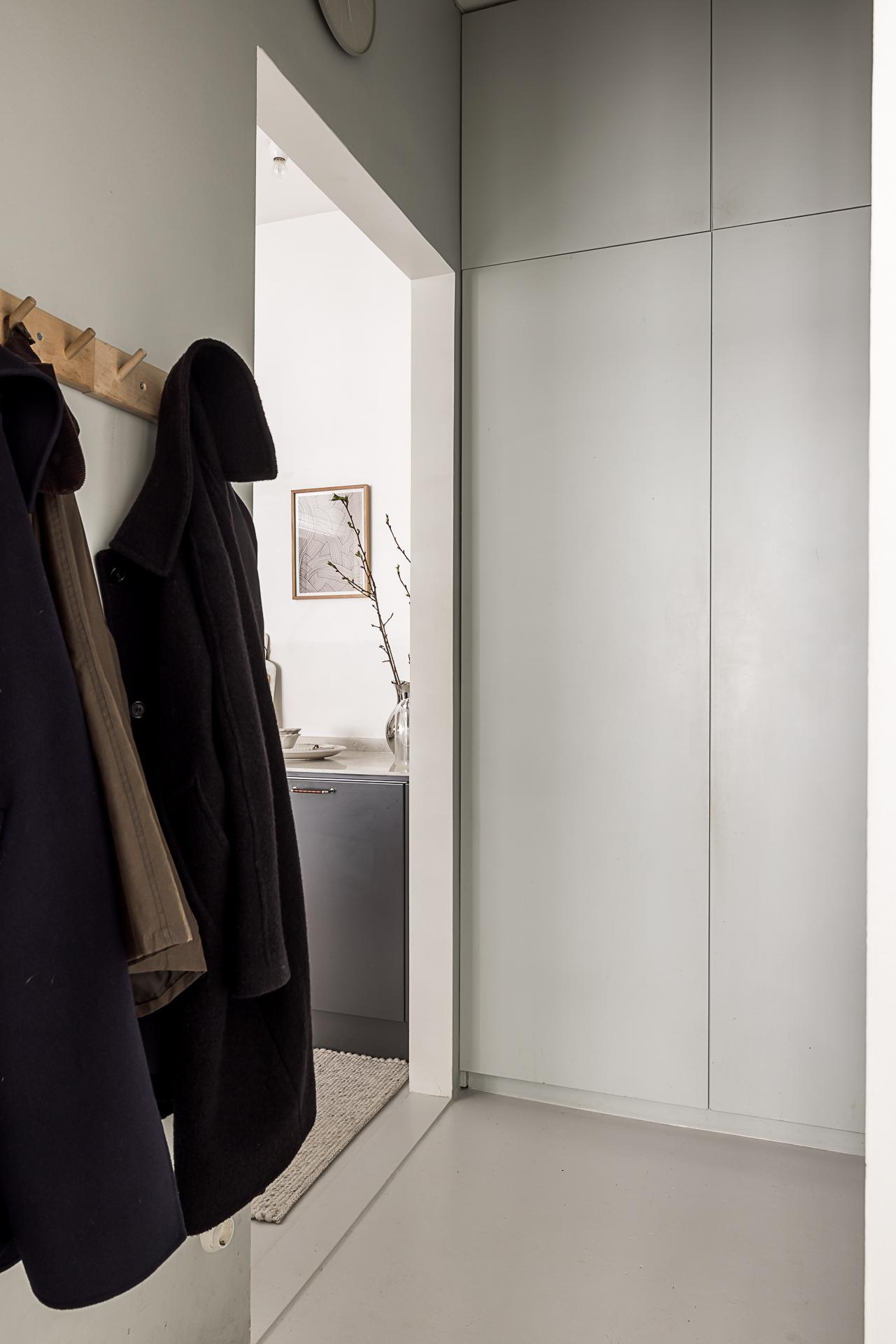På väg upp för trappan kan man beskåda väggmålningarna av Tony Roos som visar hur kvarteret såg ut för mer än 100 år sedan och man passerar också den gemensamma balkongen som badar i förmiddagssol. Väl inne i lägenheten välkomnar en hall med bra avhängningsmöjligheter och generös takhöjd. Golvet består av betong. som är skönt att gå på, speciellt eftersom det ligger värmeslingor under. Väggarna är släta och målade i en ljusgrå nyans. Garderoben rakt fram döljer både tvättmaskin och torktumlare.
