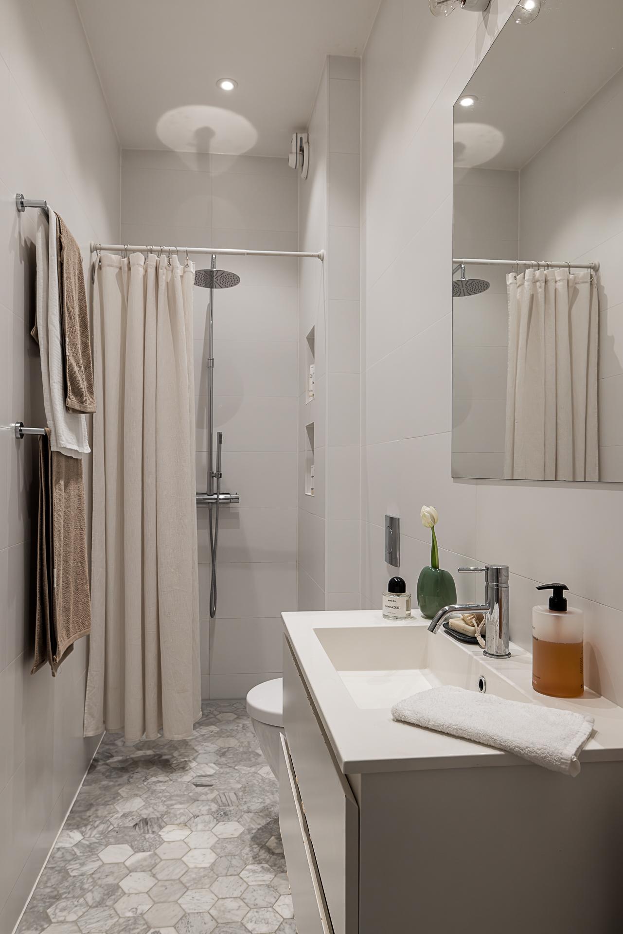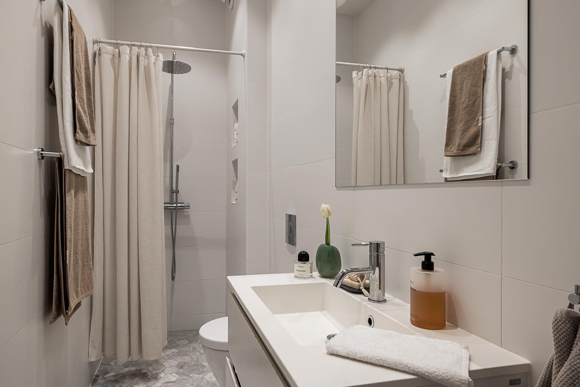 Till höger om entrén ligger badrummet som är totalrenoverat enligt konstens alla regler med genomtänkta lösningar och smakfulla materialval. En stor takdusch ger långa och härliga duschar och golvvärmen under det ljusgråa marmorgolvet i hexagonmönster ger torra golv. Väggarna är kaklade med vita kakelplattor och i taket sitter infällda dimbara spotlights. Kommoden är vit och över handfatet sitter en spegel. Vägghängd toa gör badrummet lättstädat.