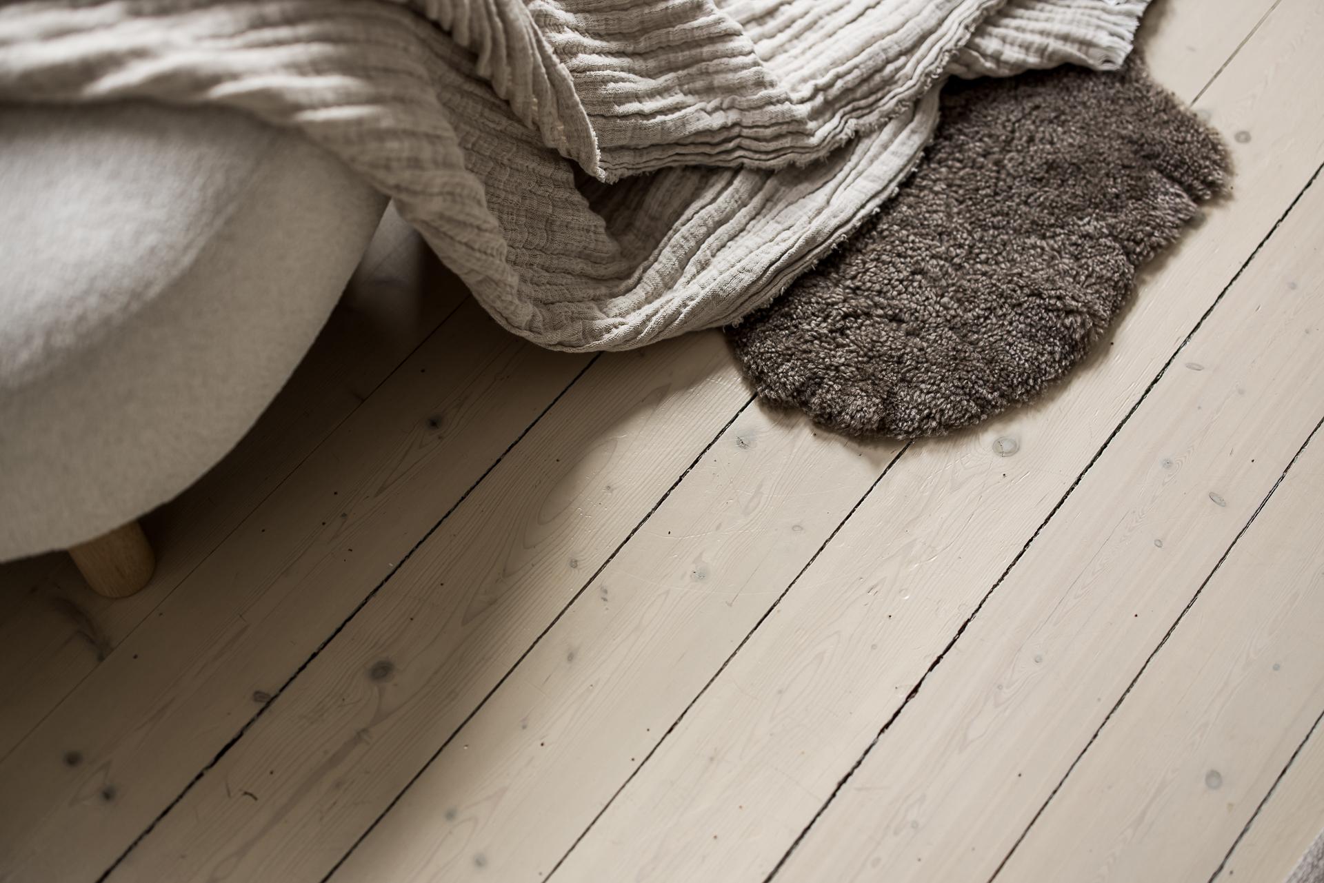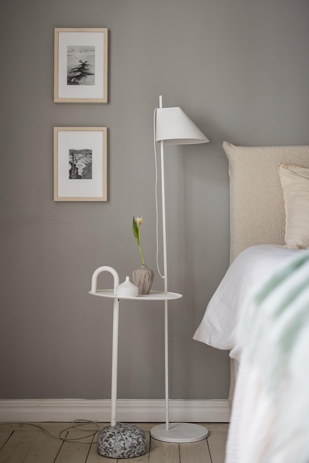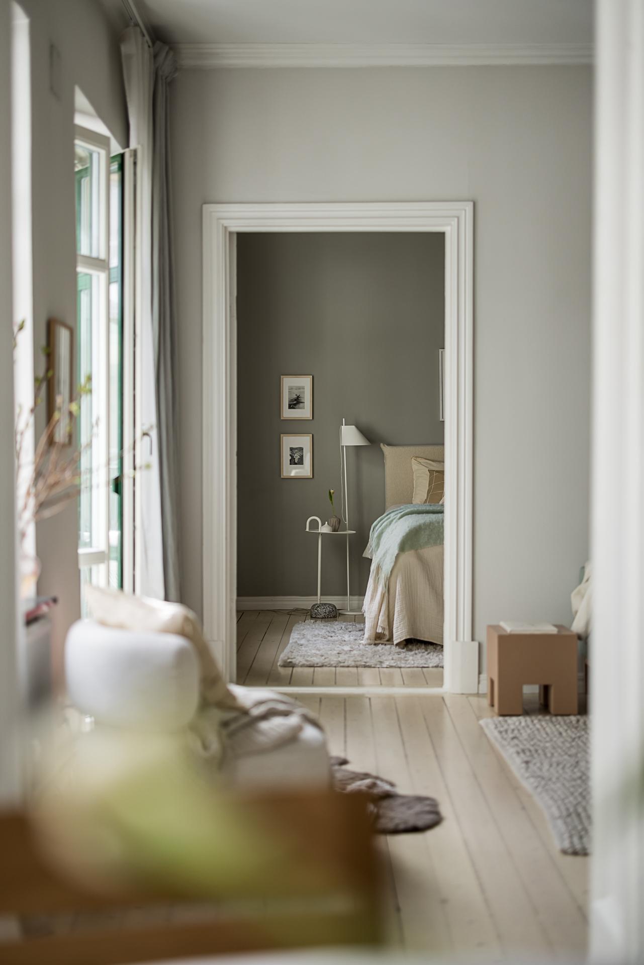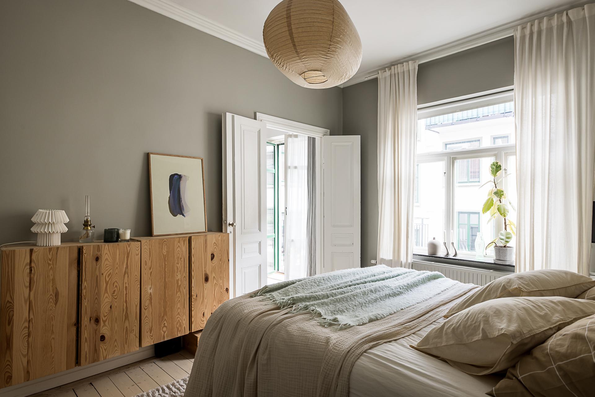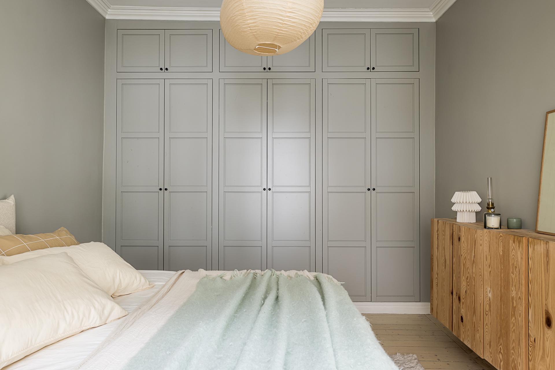 Sovrummet är ovanligt rymligt med gott om plats för en dubbelsäng och generöst ljusinsläpp från det breda treluftsfönstret med marmorbräden som vetter åt den lugna gården. Sommartid står det ständigt öppet och man kan nästan ta på löven som täcker trädet utanför. Längs ena väggen erbjuds goda förvaringsmöjligheter i form av grå ovanligt vackra platsbyggda garderober. Väggarna är målade i en aningen mörkare grå ton än vardagsrummet. Vackert massivt brädgolv även här.