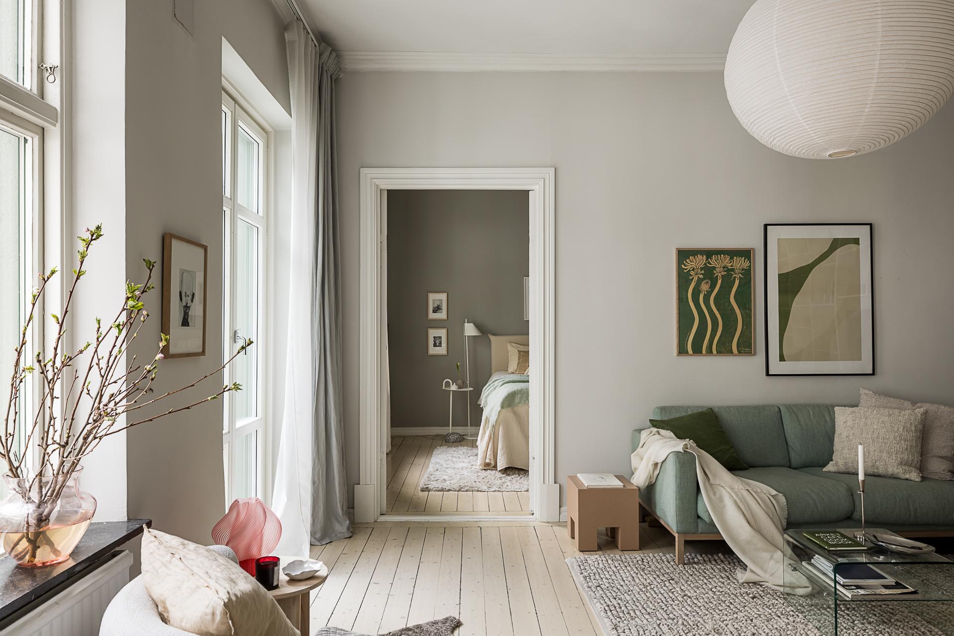 Ljus och rymd kännetecknar detta trivsamma vardagsrum som badar i ljus tack vare de höga fönstren med överljus i original. Utanför skymtar man de lummiga träden som sträcker sig upp från innergården. Den öppna spisen funkar utmärkt dessutom! Rummet är som gjort för umgänge då det ligger intill köket och det erbjuder plats för en rejäl soffa, soffbord, tv-möbel, platsbyggdbokhylla och fåtölj. Planlösningen med närheten till köket och dörröppningar från två håll får anses unikt i en sekelskiftestvåa. Detta ger en härlig rymd och luftighet. Väggarna är målade i en ljusgrå nyans som fint framhäver snickerierna och fönsternischerna. På golvet ligger brädor från byggåret 1906.