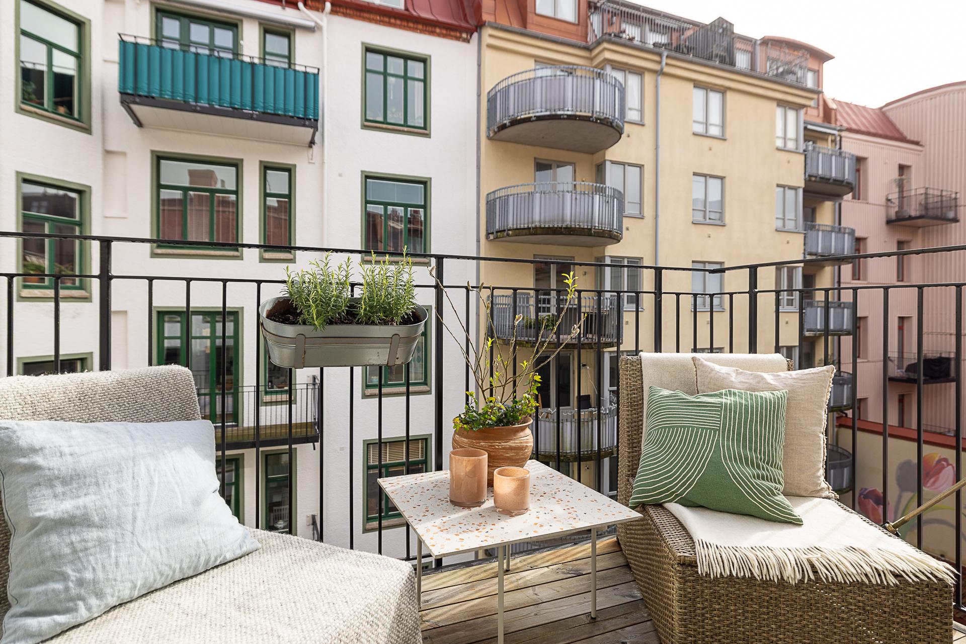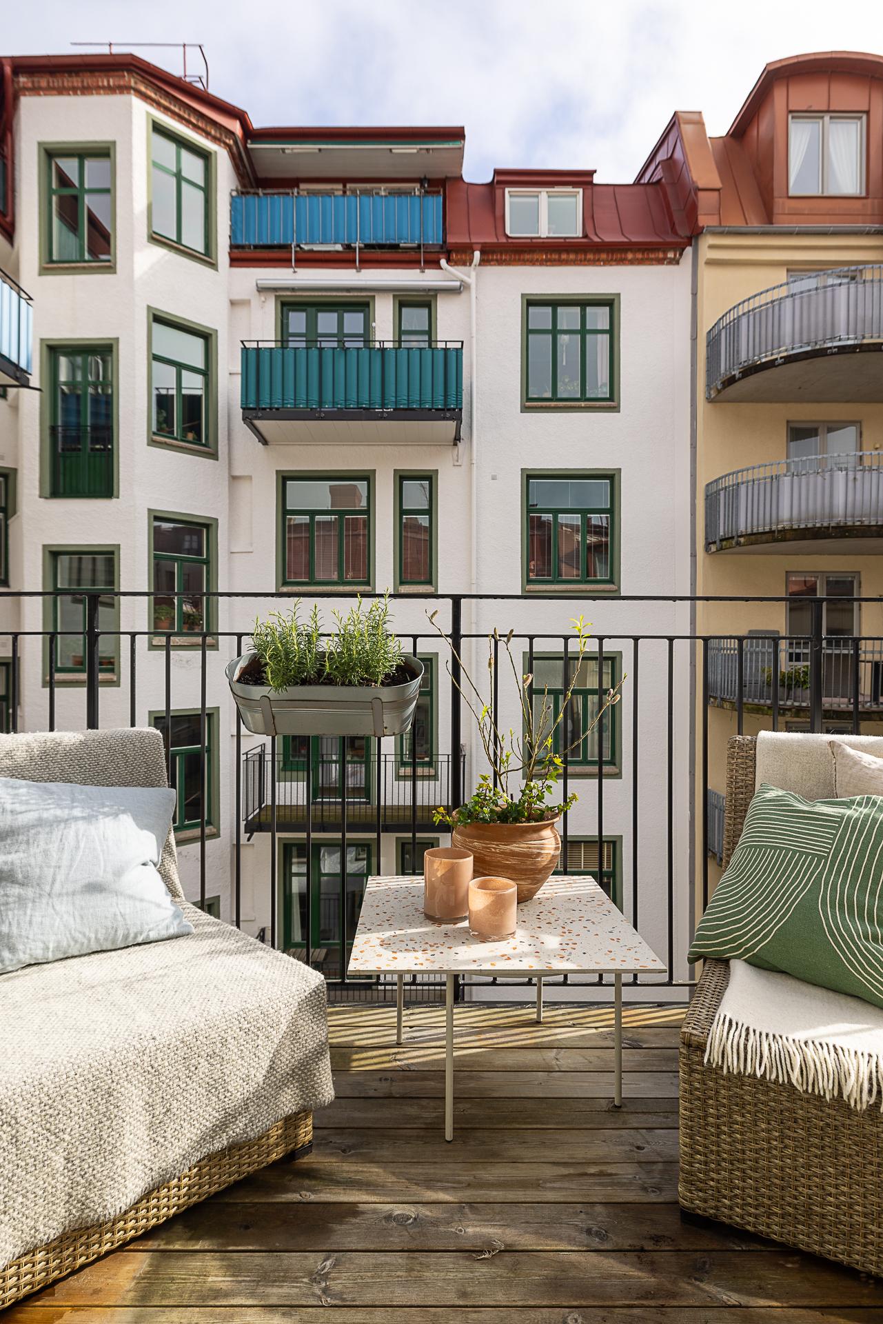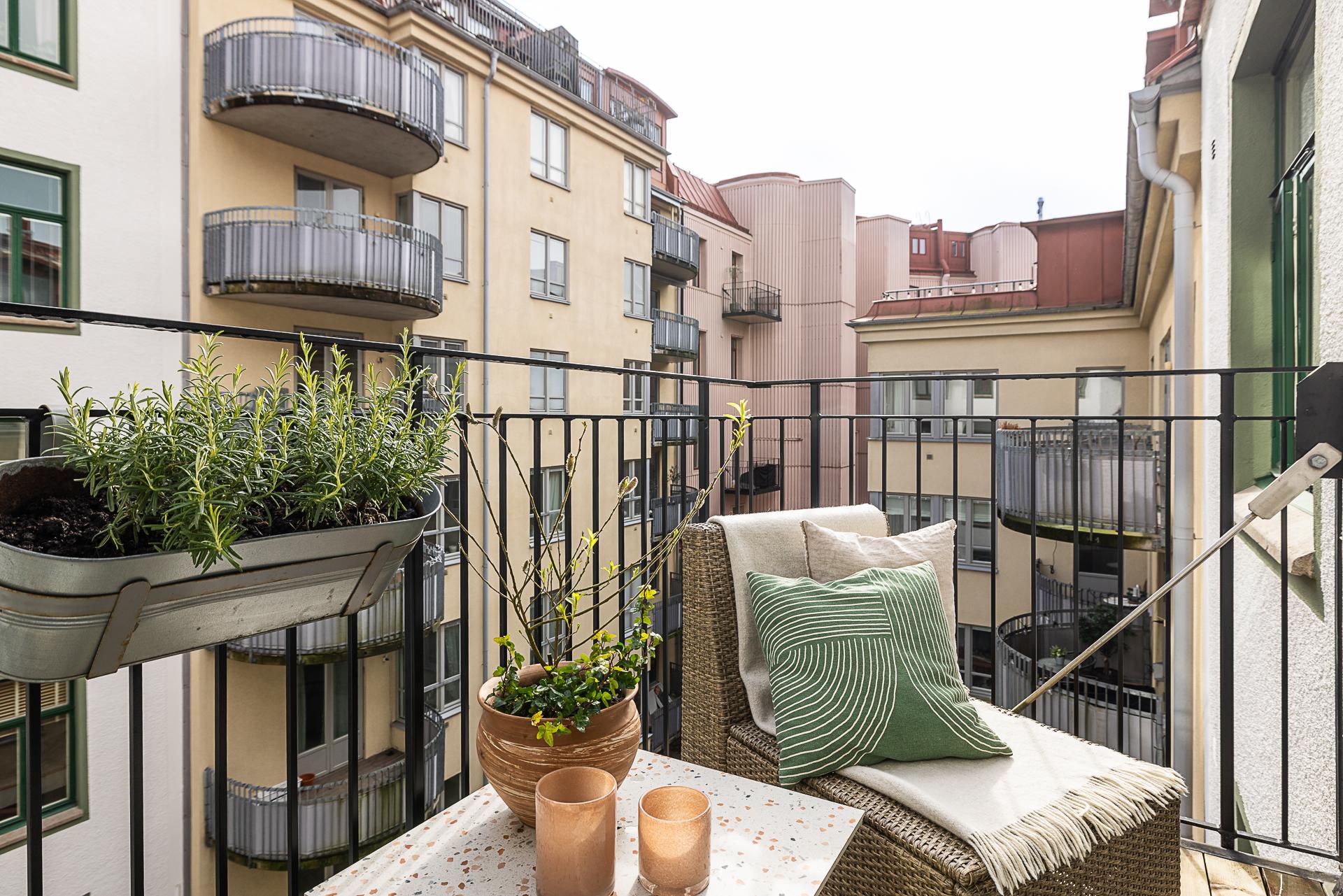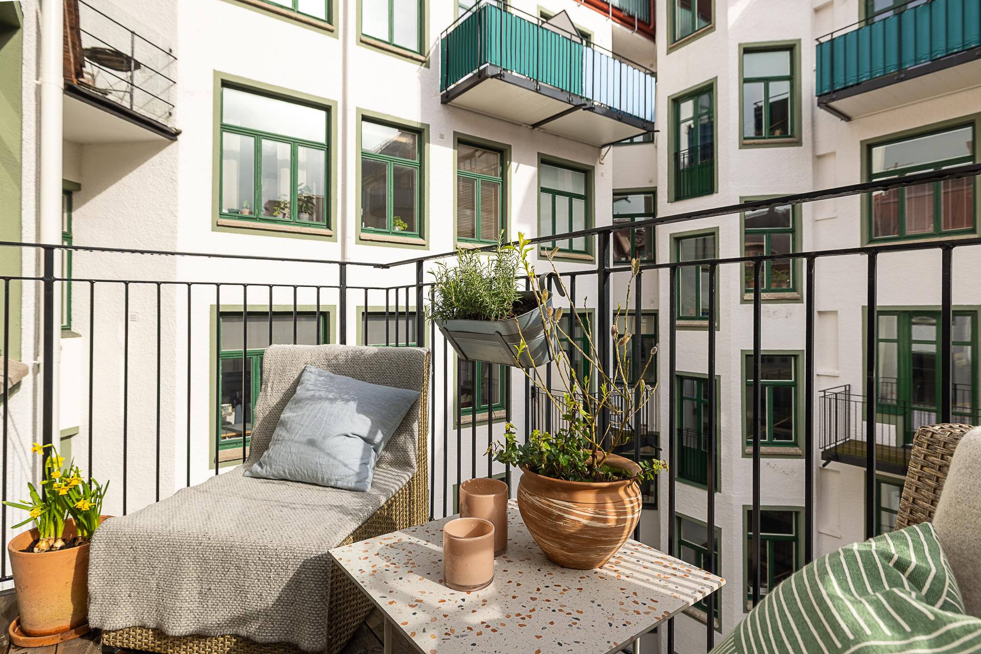 En fin förlängning av vardagsrummet ut mot den ljuvliga innergården. Sommartid grönskar träden på bara en armlängds avstånd. Skönt med trätrall för barfotafötter och balkongen ramas in av ett svart smidesräcke.
