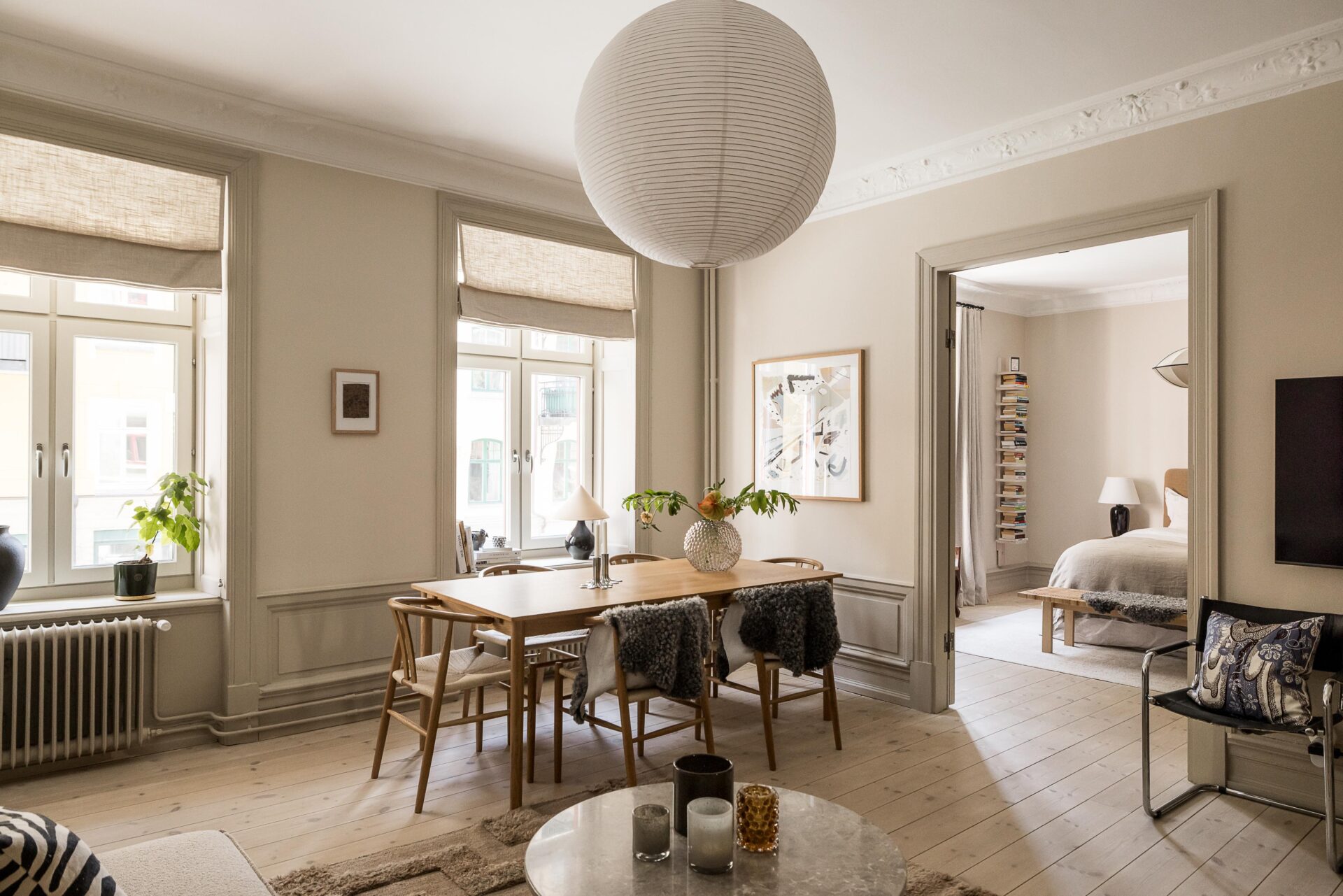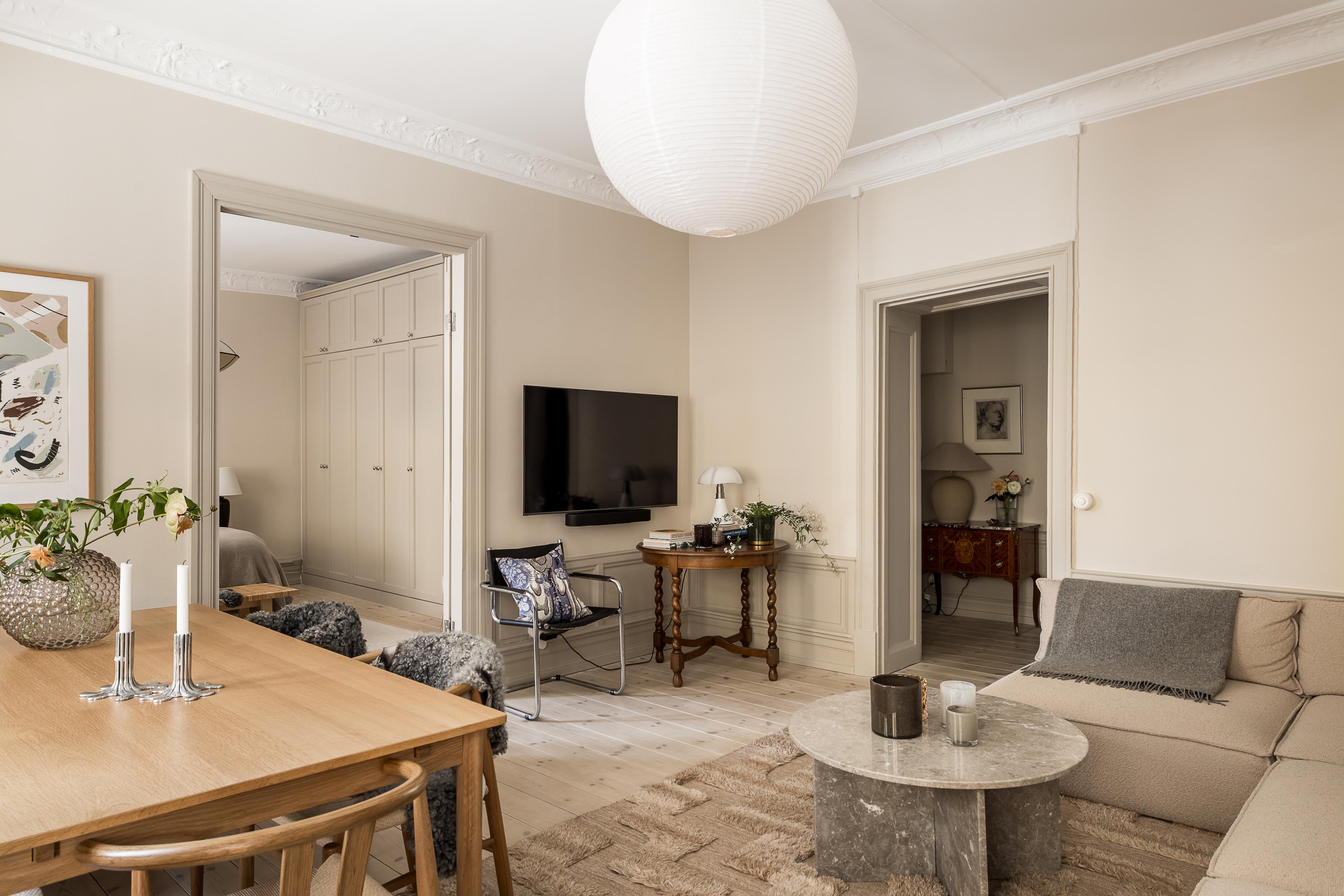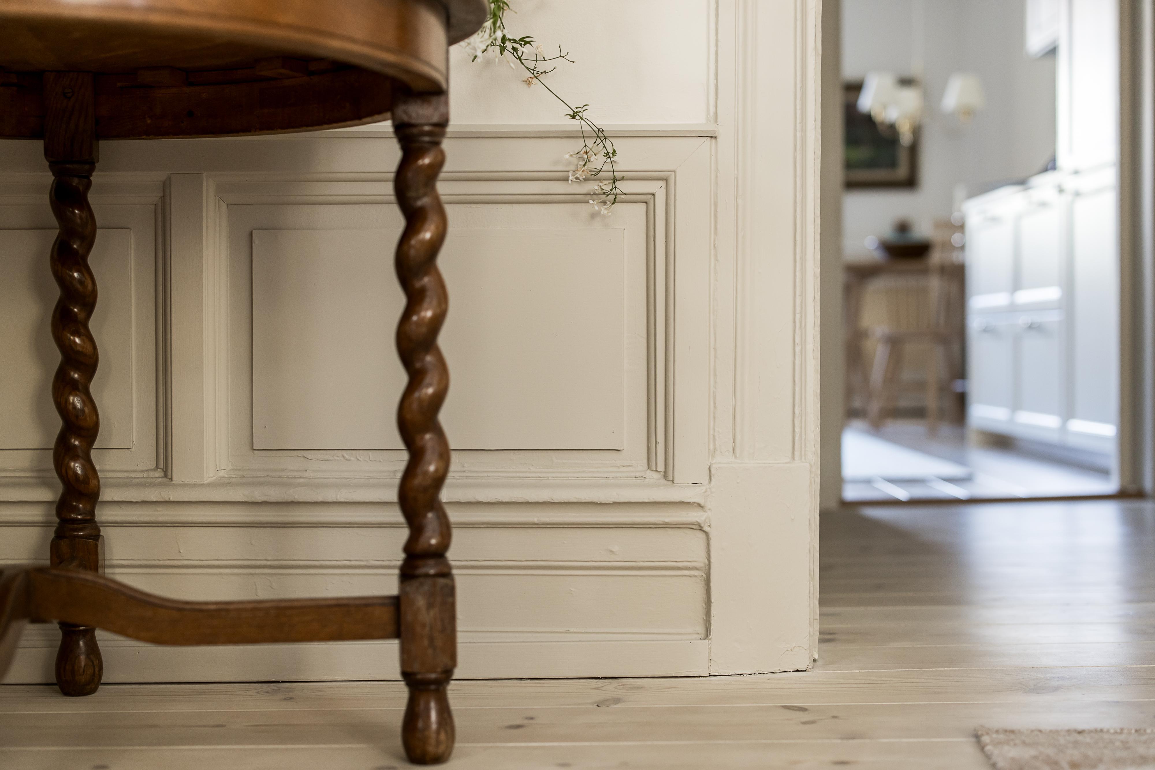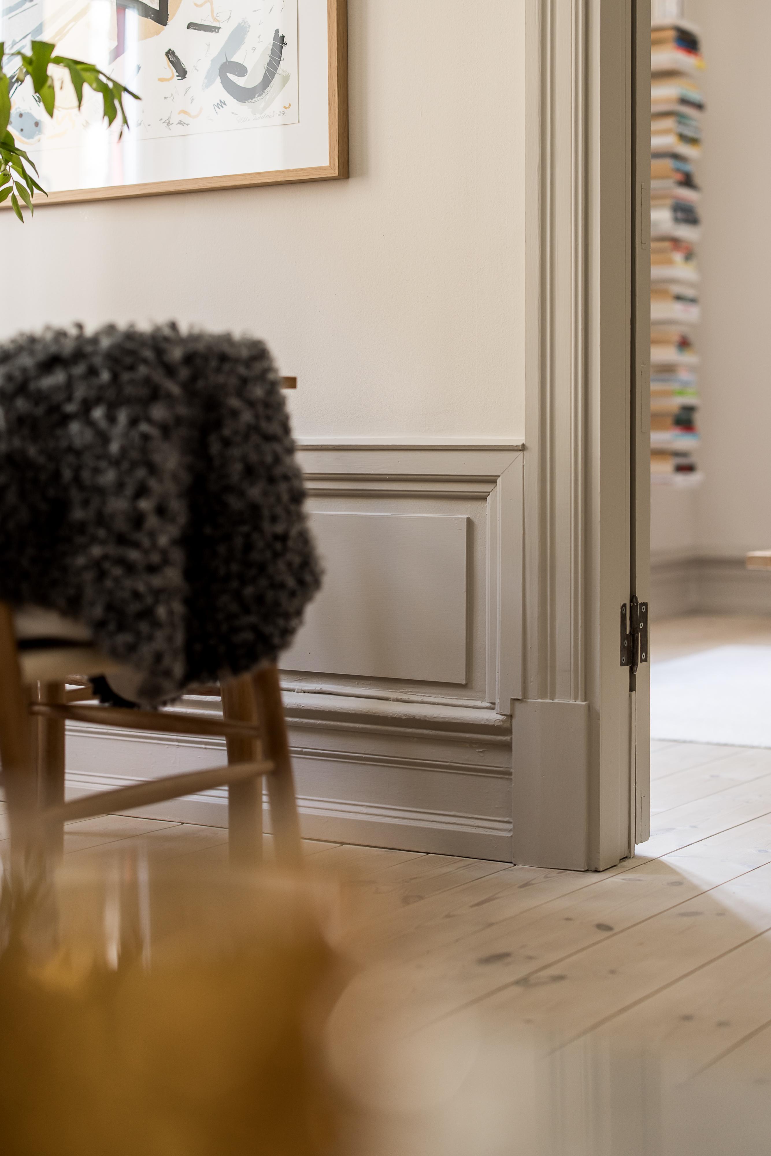 Bostaden bär spår av tidens vackra ideal med höga tak, bevarad stuckatur och genomgående vitsåpade brädgolv. Samtidigt har hemmet varsamt förädlats genom åren. Köket, badrummet och samtliga ytskikt har renoverats löpande med en tydlig känsla för material, färg och helhet. Resultatet är ett hem där varje detalj samspelar i en dämpad och harmonisk palett.