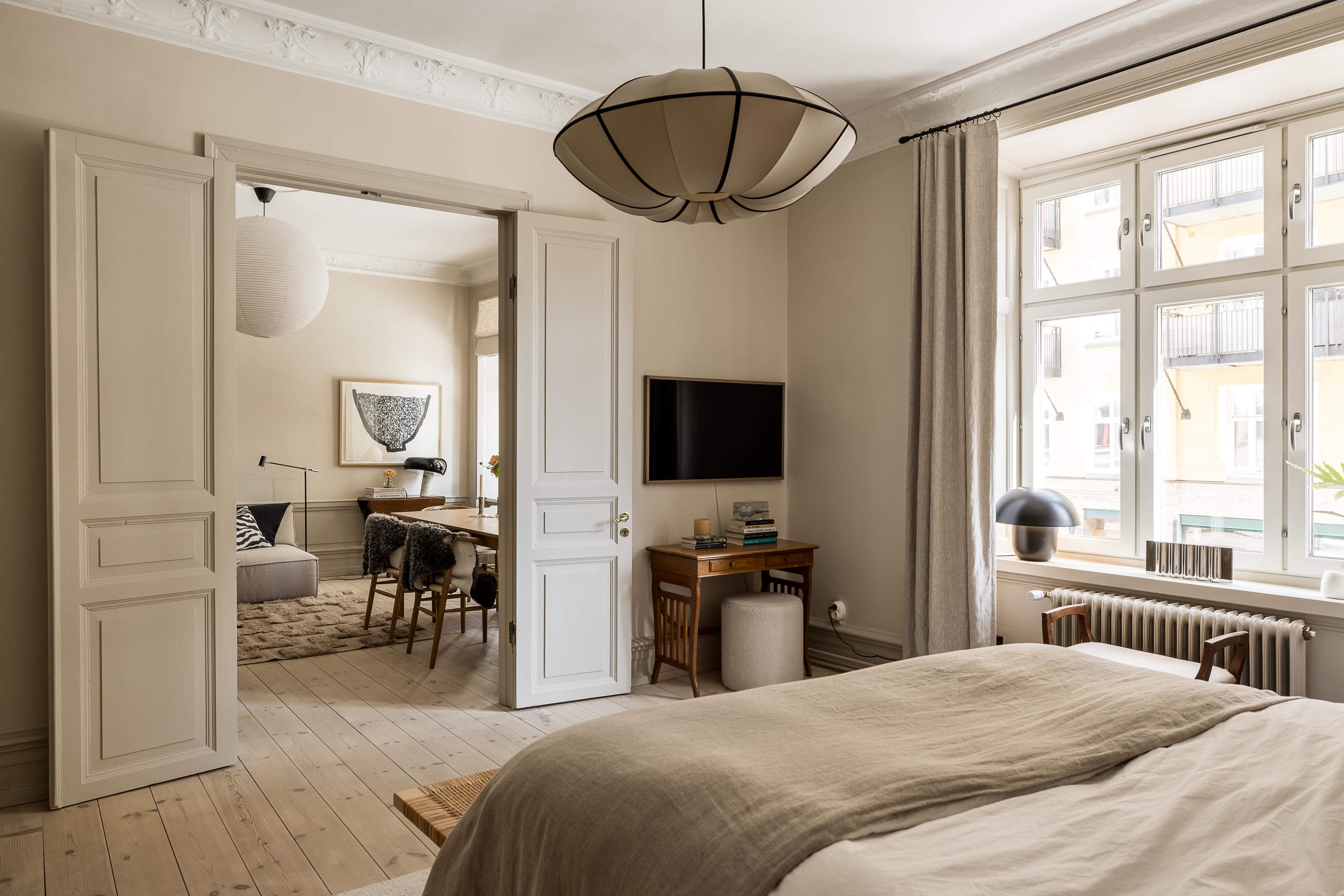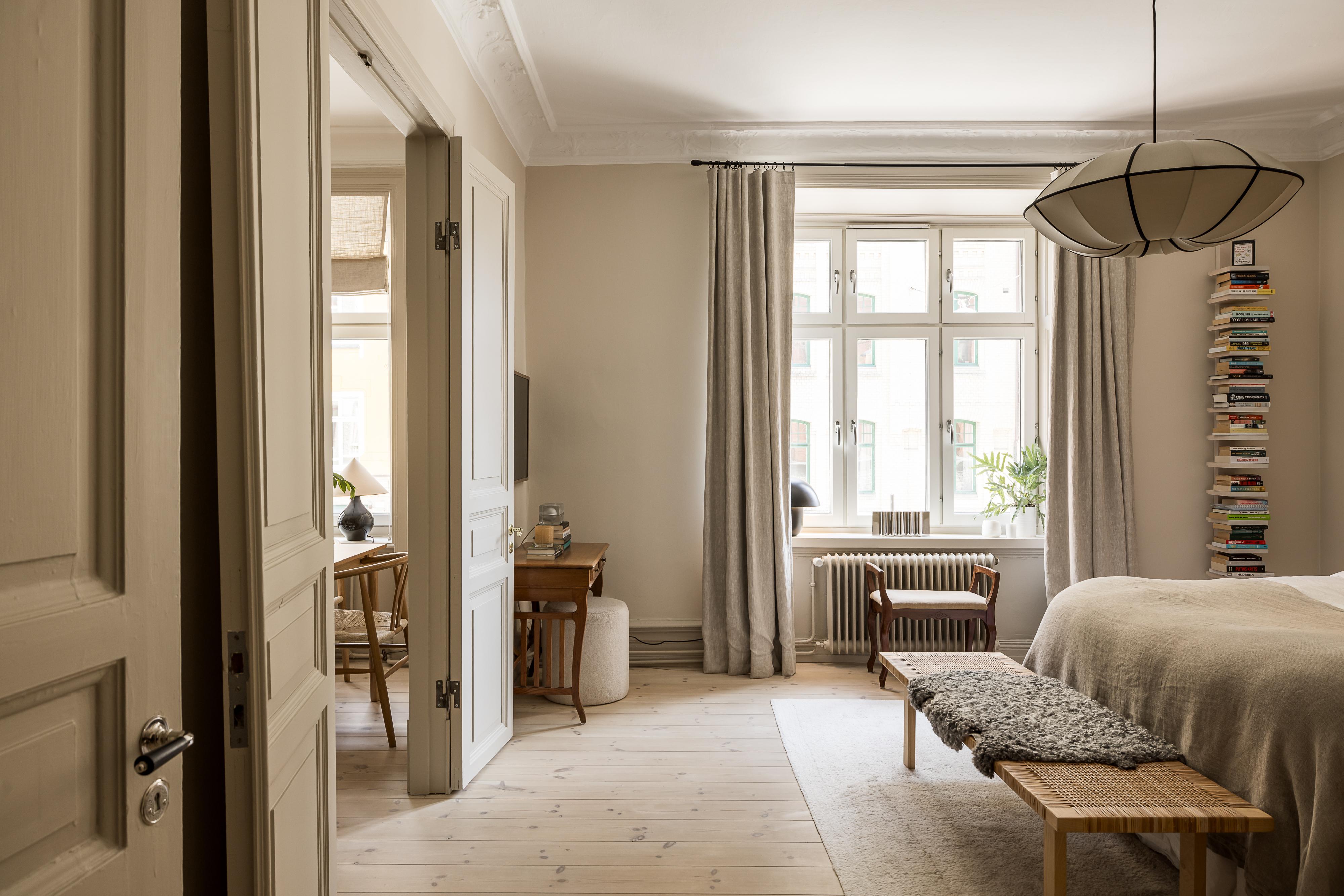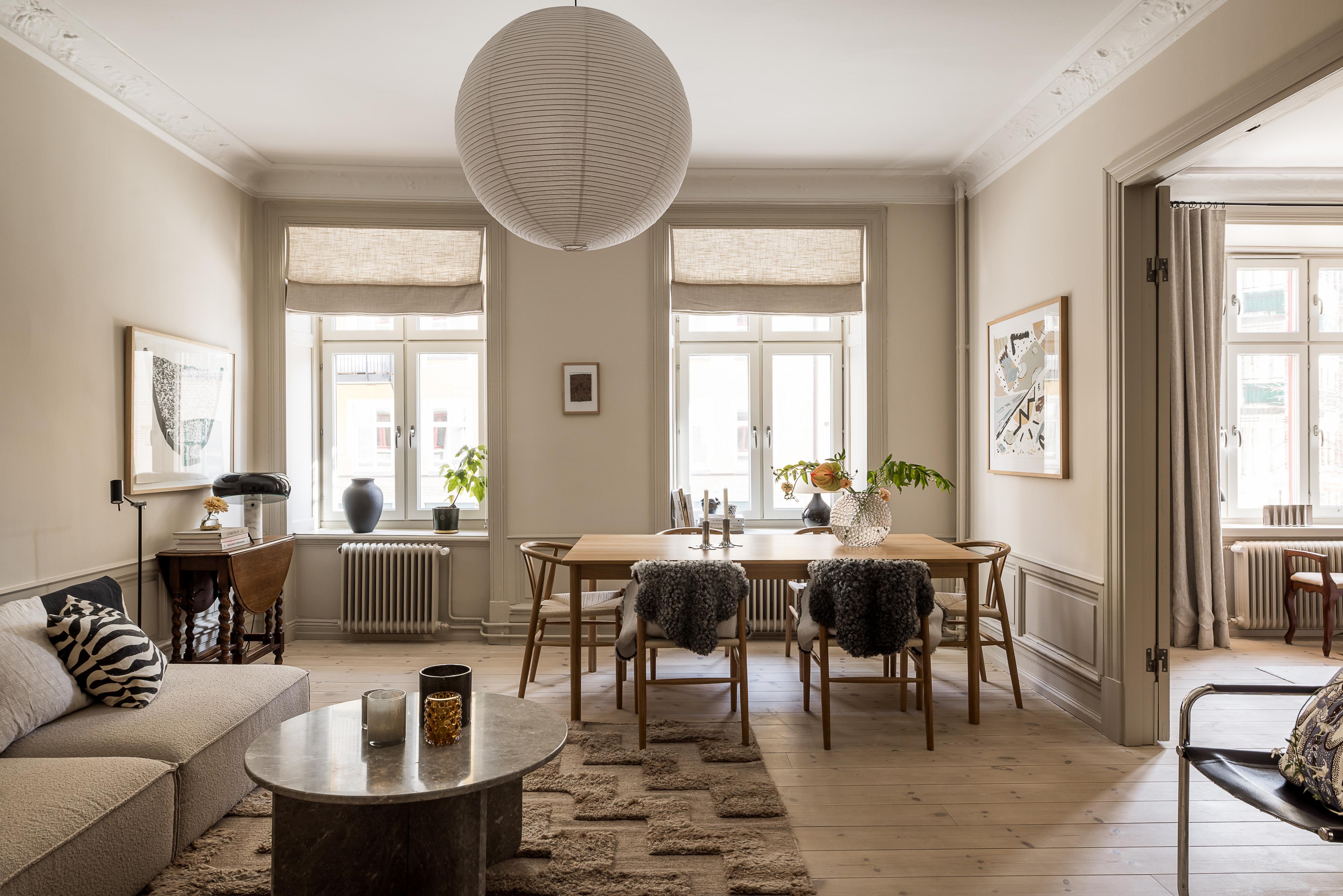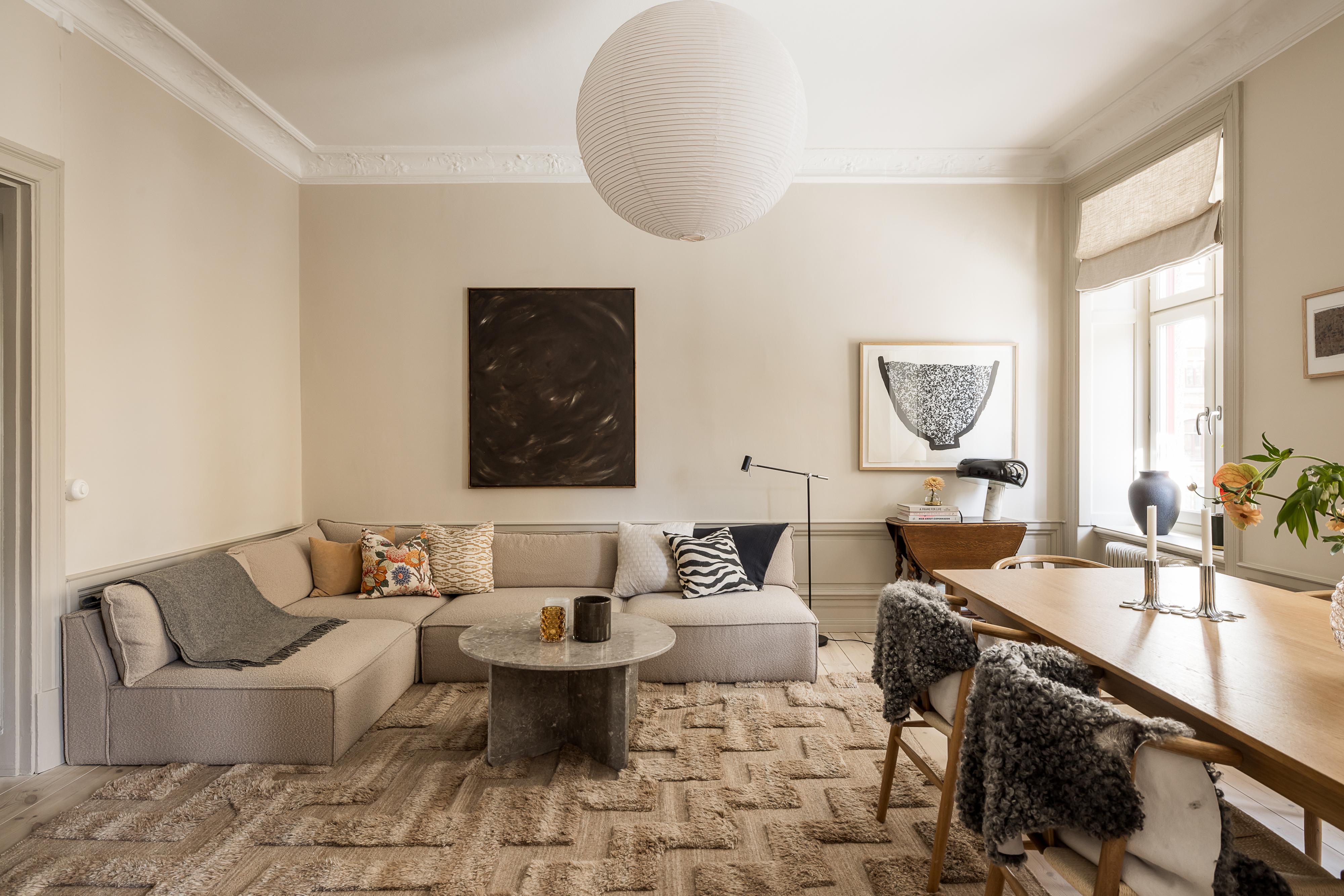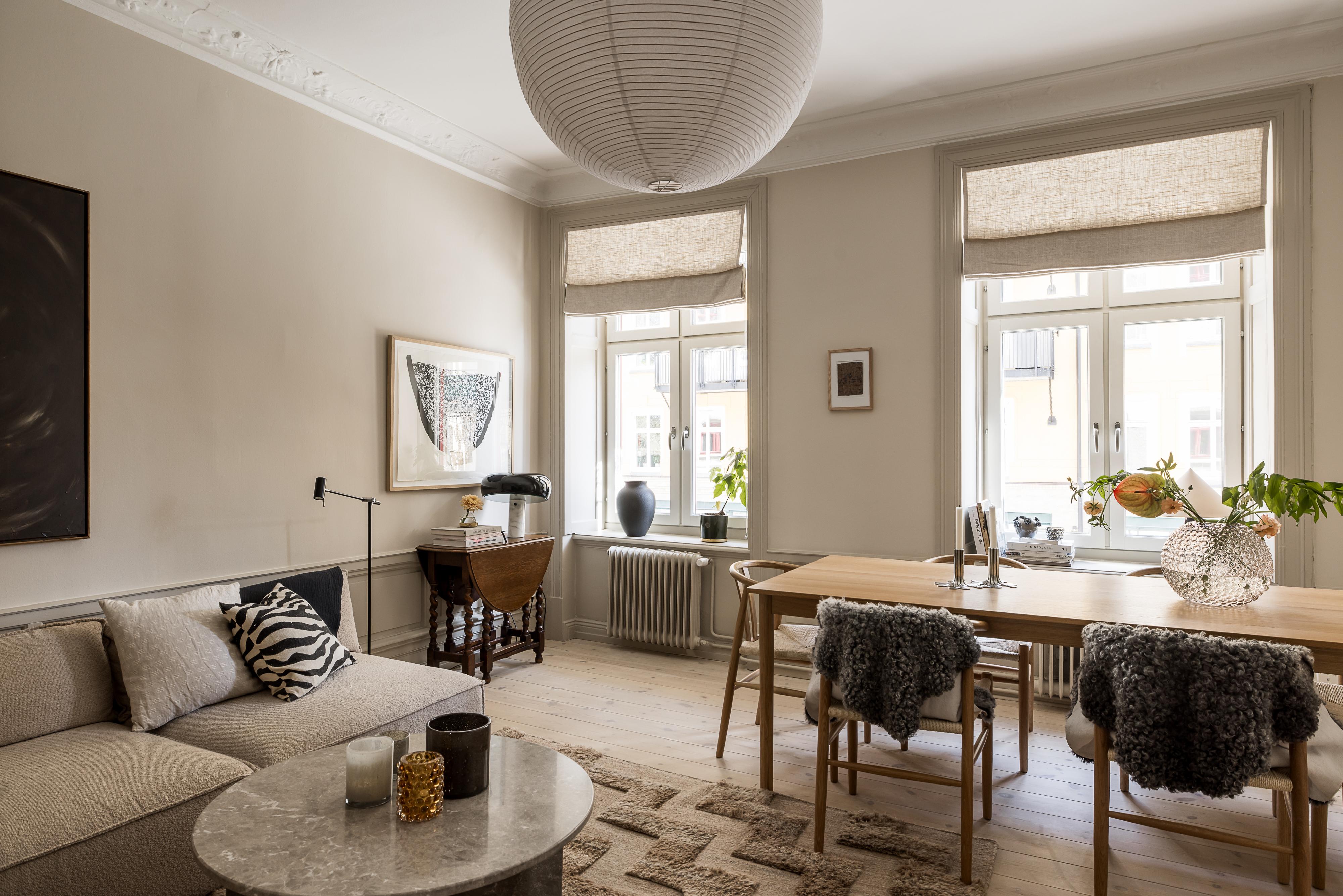 Bostaden bär spår av tidens vackra ideal med höga tak, bevarad stuckatur och genomgående vitsåpade brädgolv. Samtidigt har hemmet varsamt förädlats genom åren. Köket, badrummet och samtliga ytskikt har renoverats löpande med en tydlig känsla för material, färg och helhet. Resultatet är ett hem där varje detalj samspelar i en dämpad och harmonisk palett.