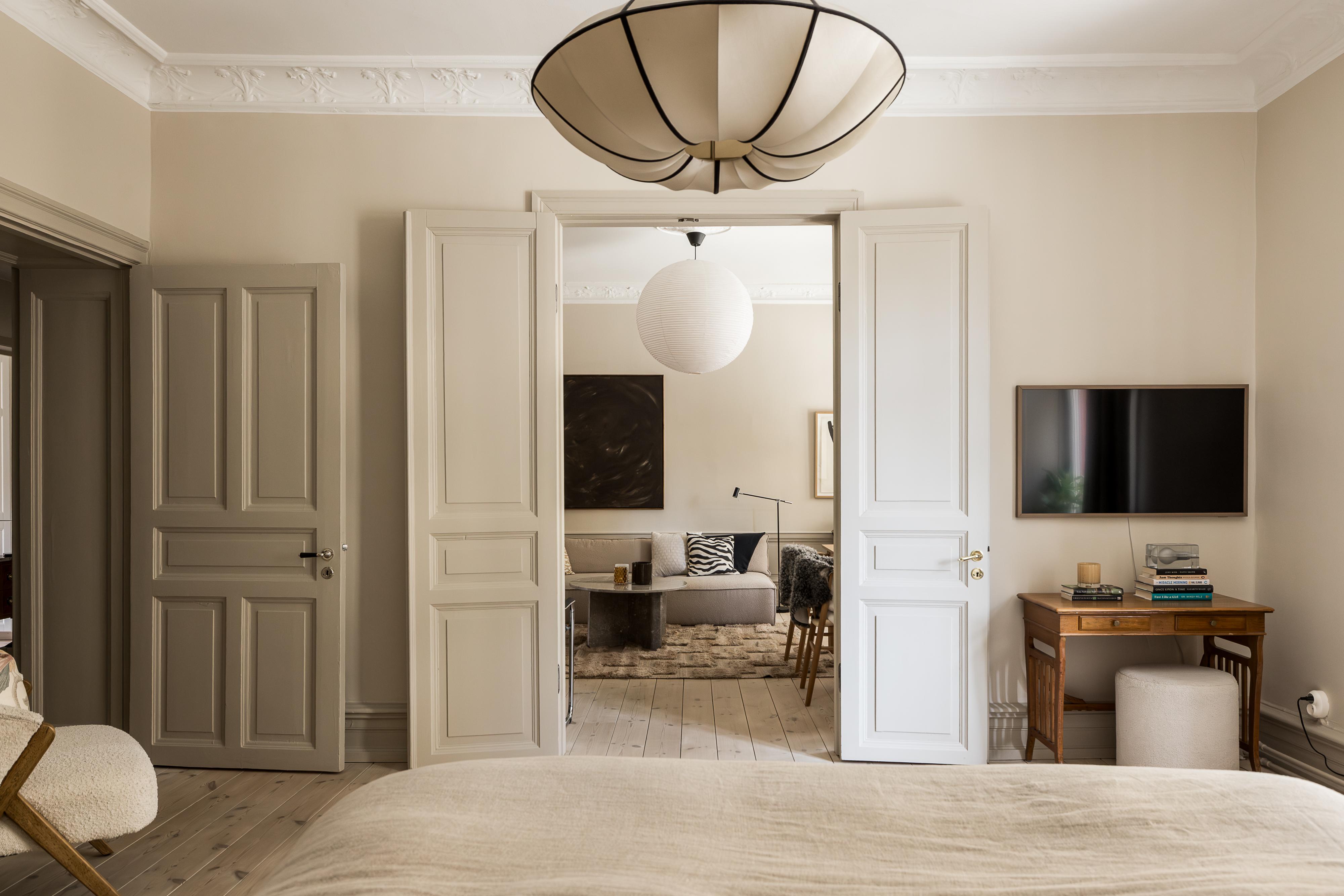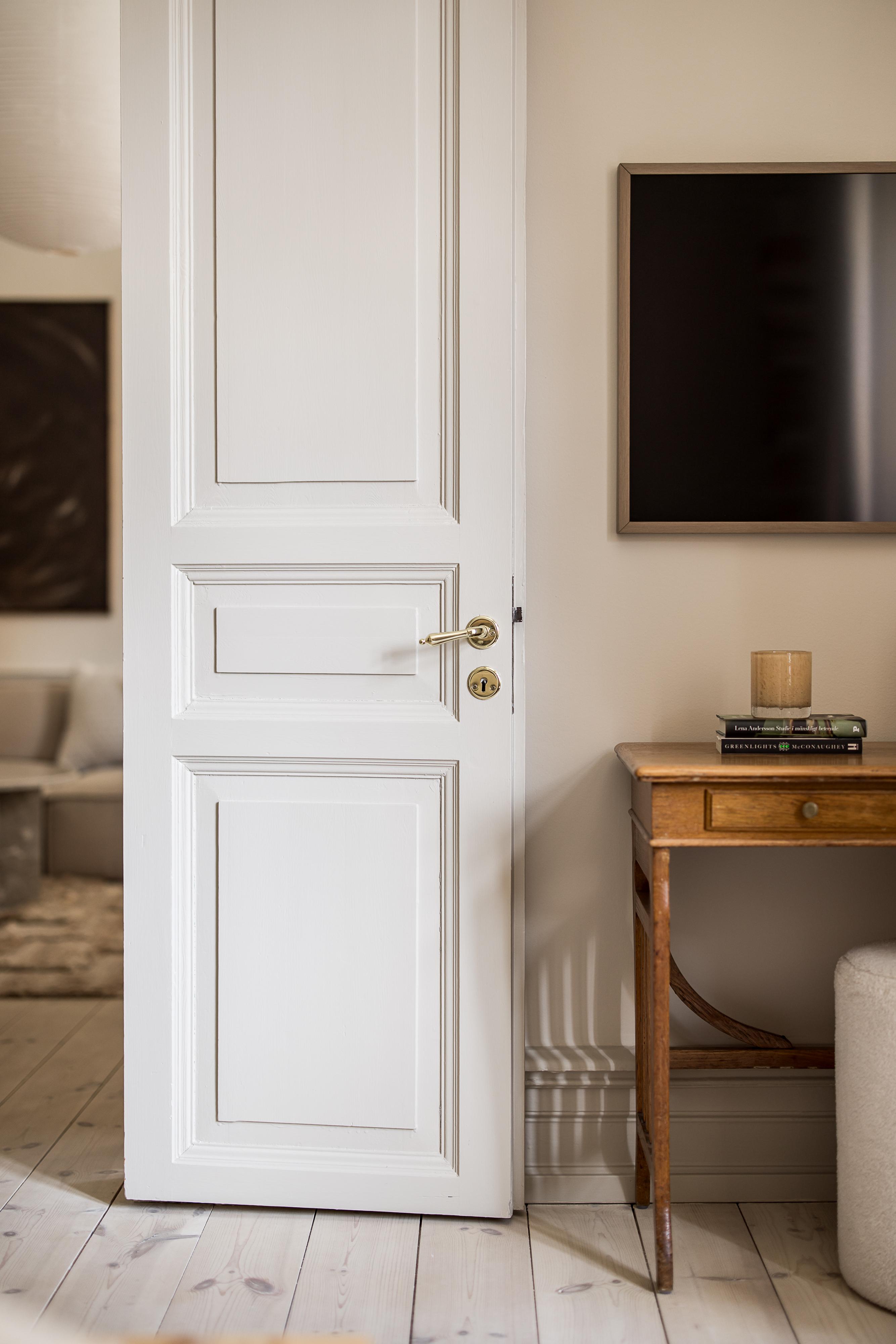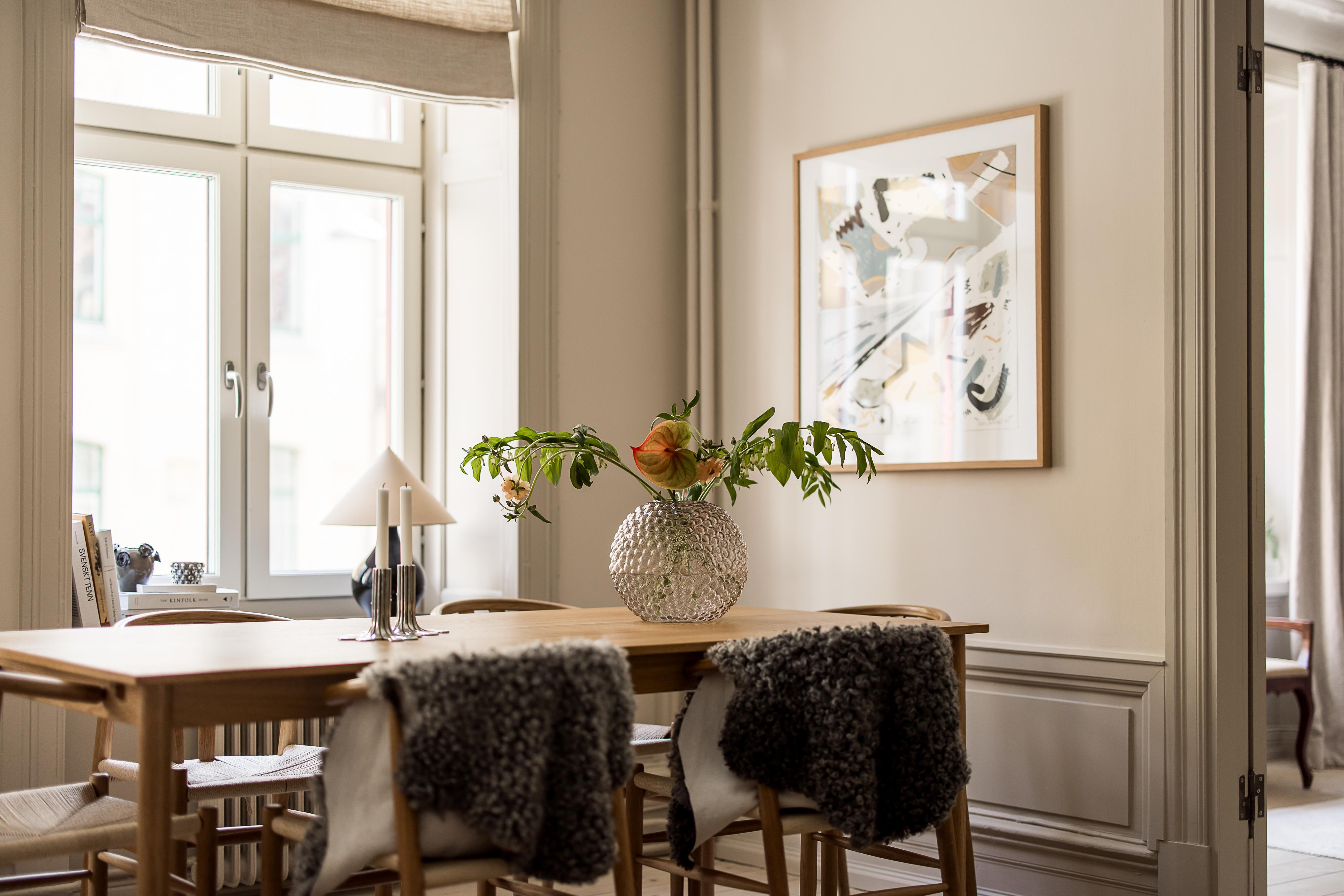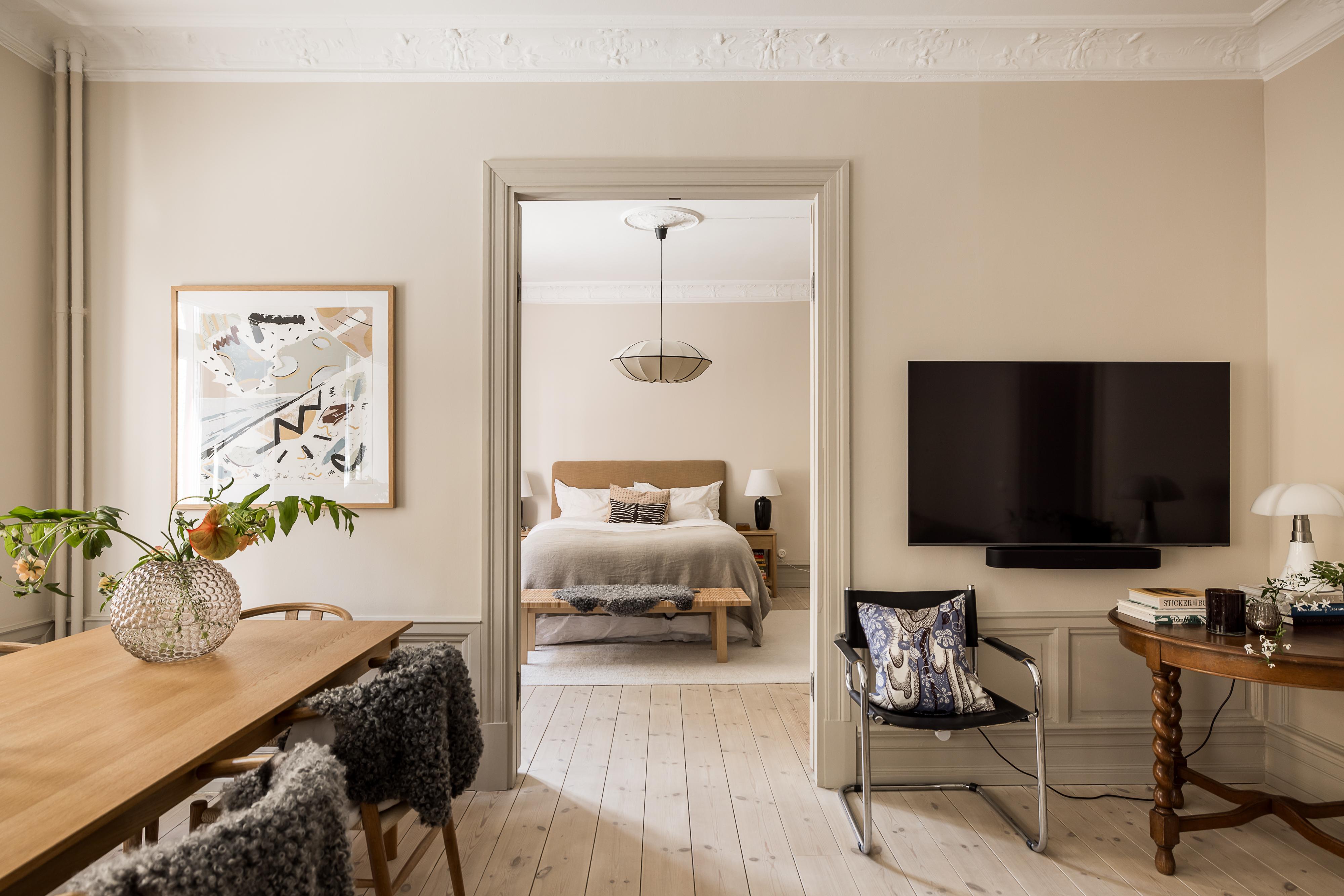 Bostaden bär spår av tidens vackra ideal med höga tak, bevarad stuckatur och genomgående vitsåpade brädgolv. Samtidigt har hemmet varsamt förädlats genom åren. Köket, badrummet och samtliga ytskikt har renoverats löpande med en tydlig känsla för material, färg och helhet. Resultatet är ett hem där varje detalj samspelar i en dämpad och harmonisk palett.