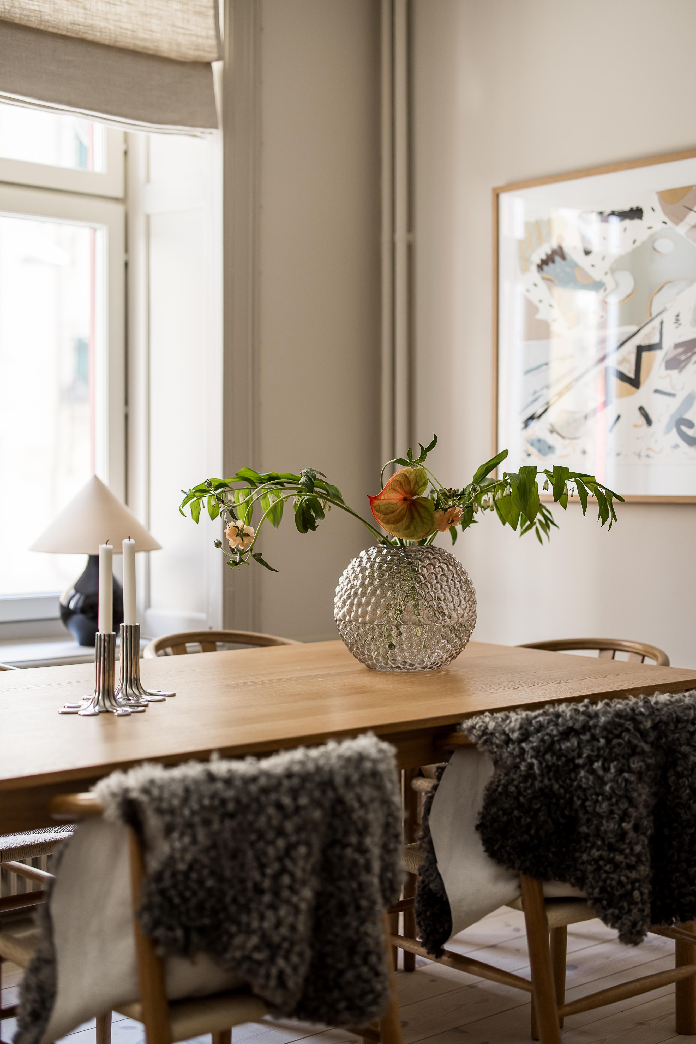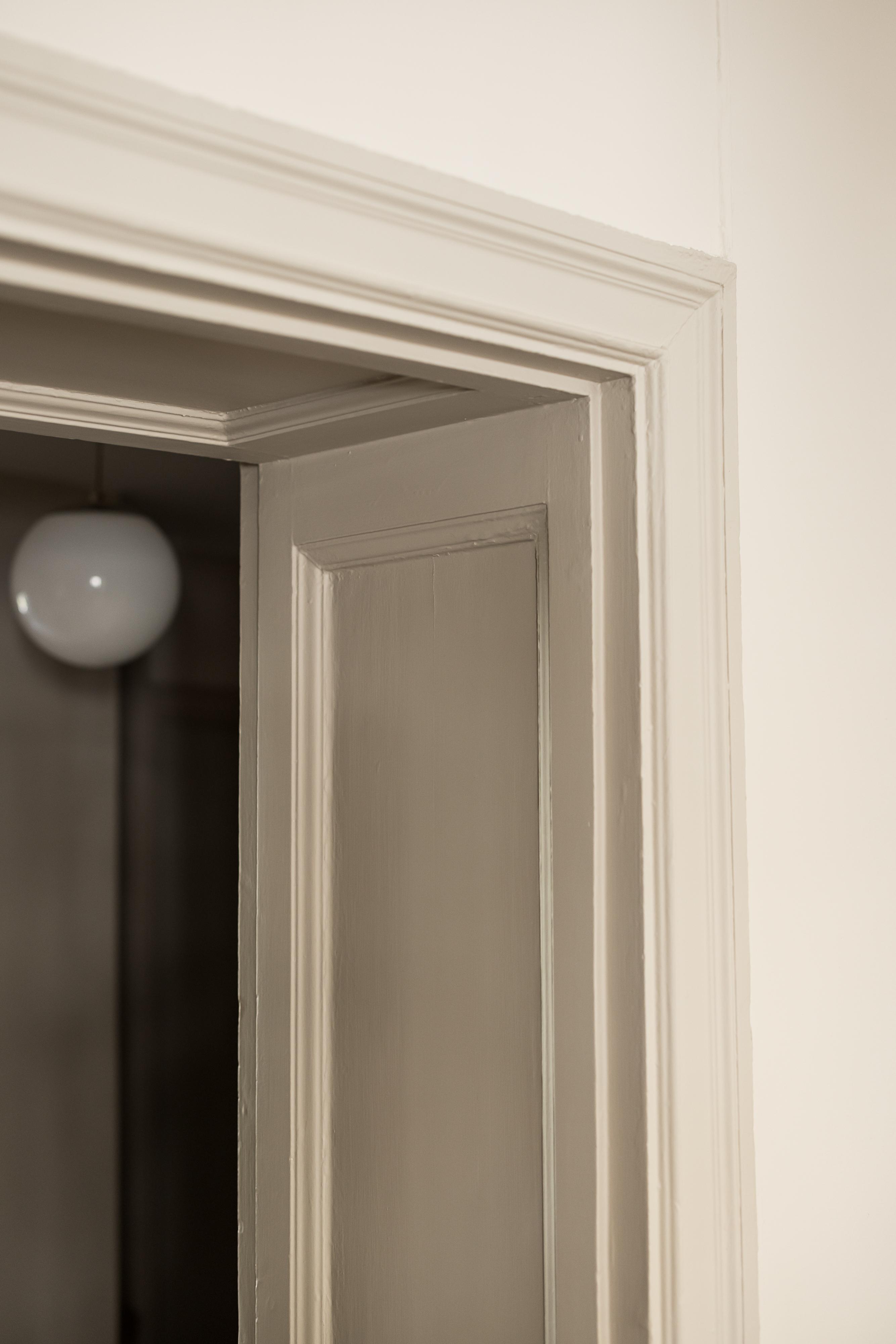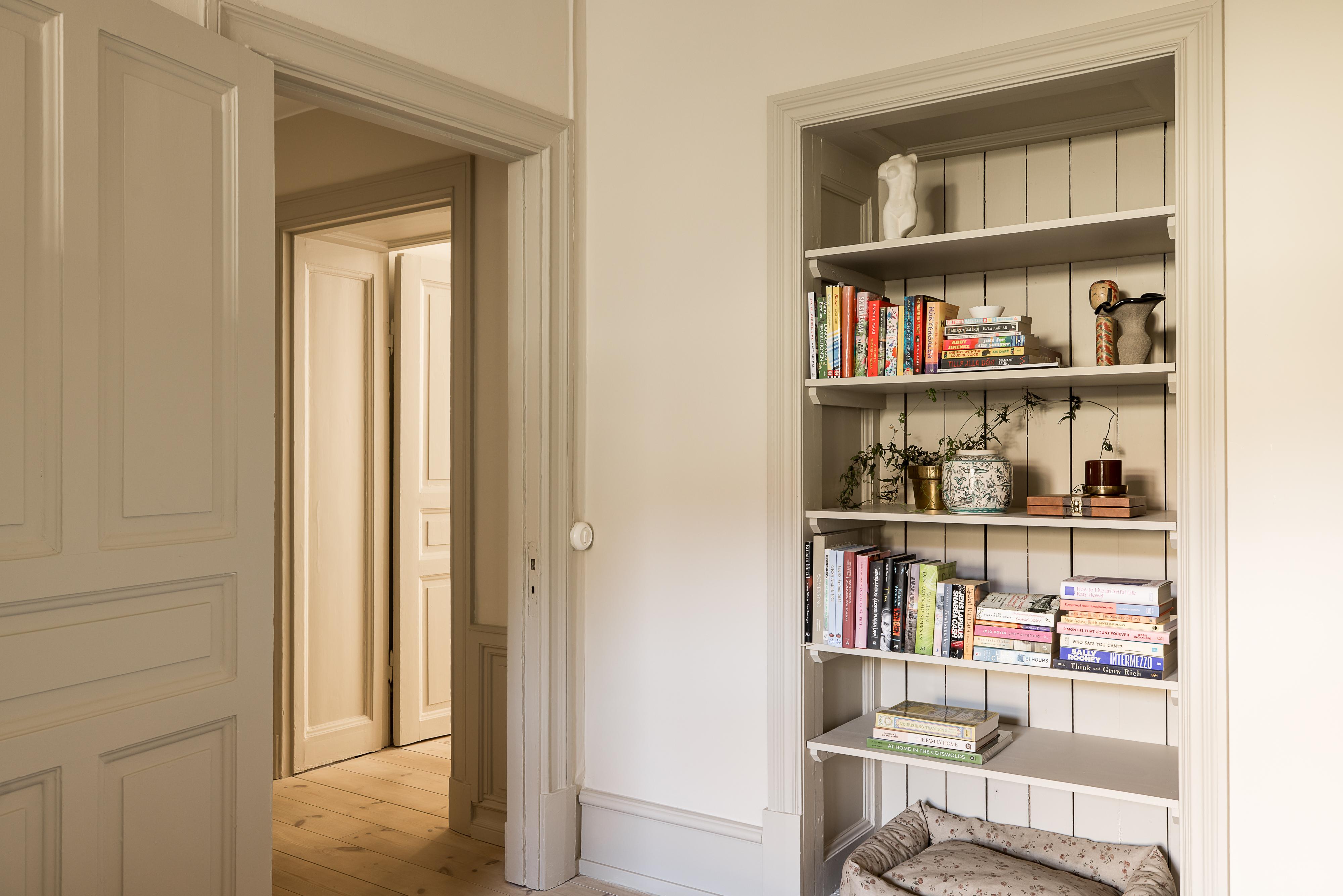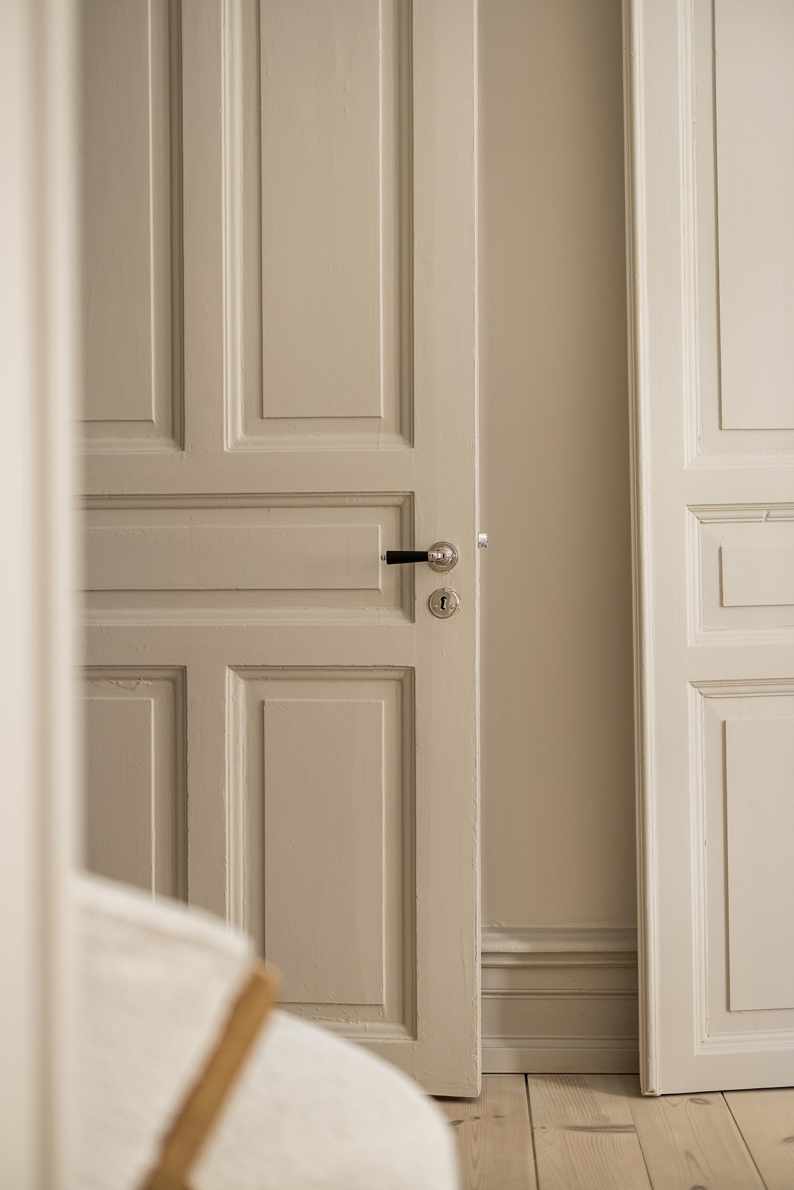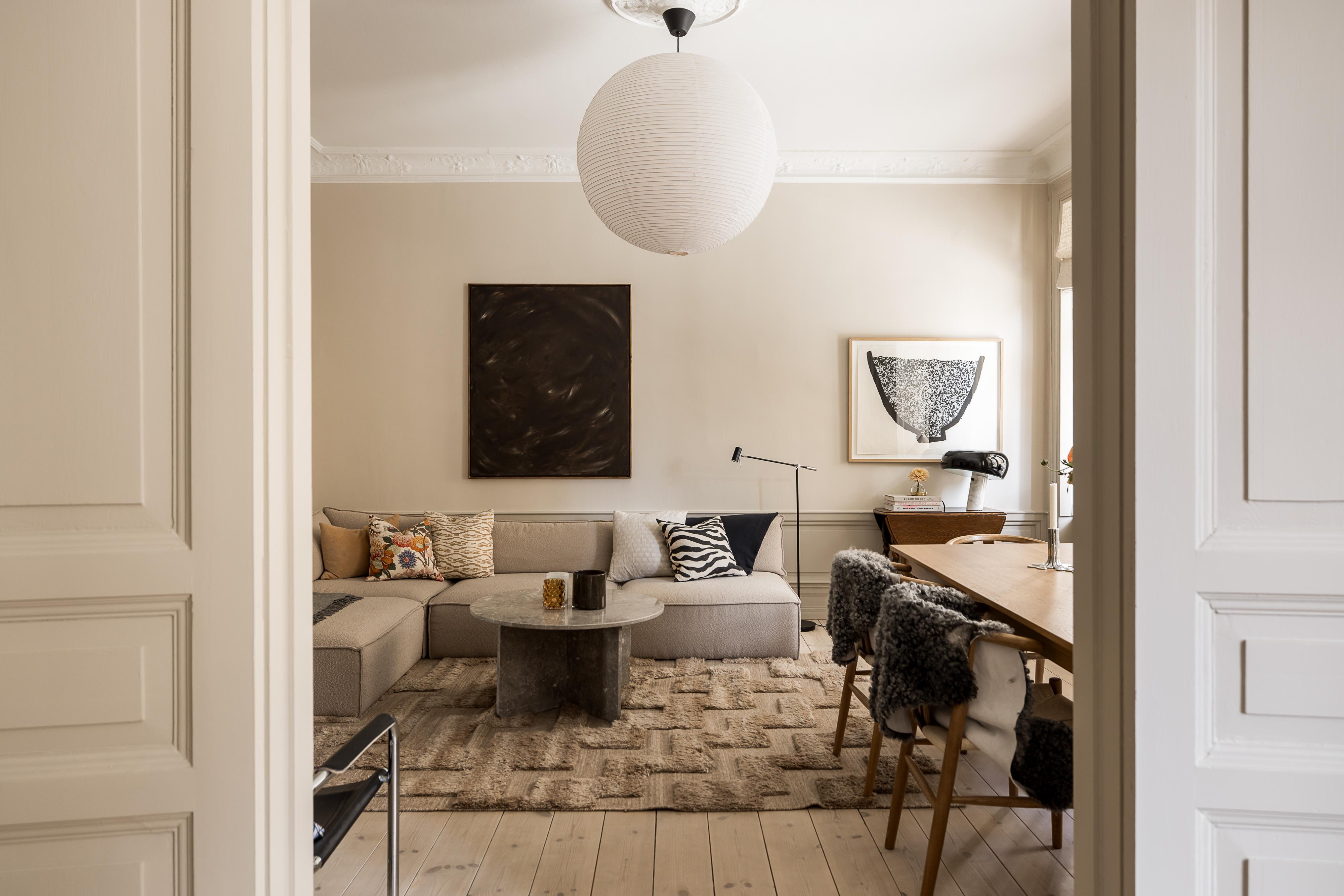 Bostaden bär spår av tidens vackra ideal med höga tak, bevarad stuckatur och genomgående vitsåpade brädgolv. Samtidigt har hemmet varsamt förädlats genom åren. Köket, badrummet och samtliga ytskikt har renoverats löpande med en tydlig känsla för material, färg och helhet. Resultatet är ett hem där varje detalj samspelar i en dämpad och harmonisk palett.