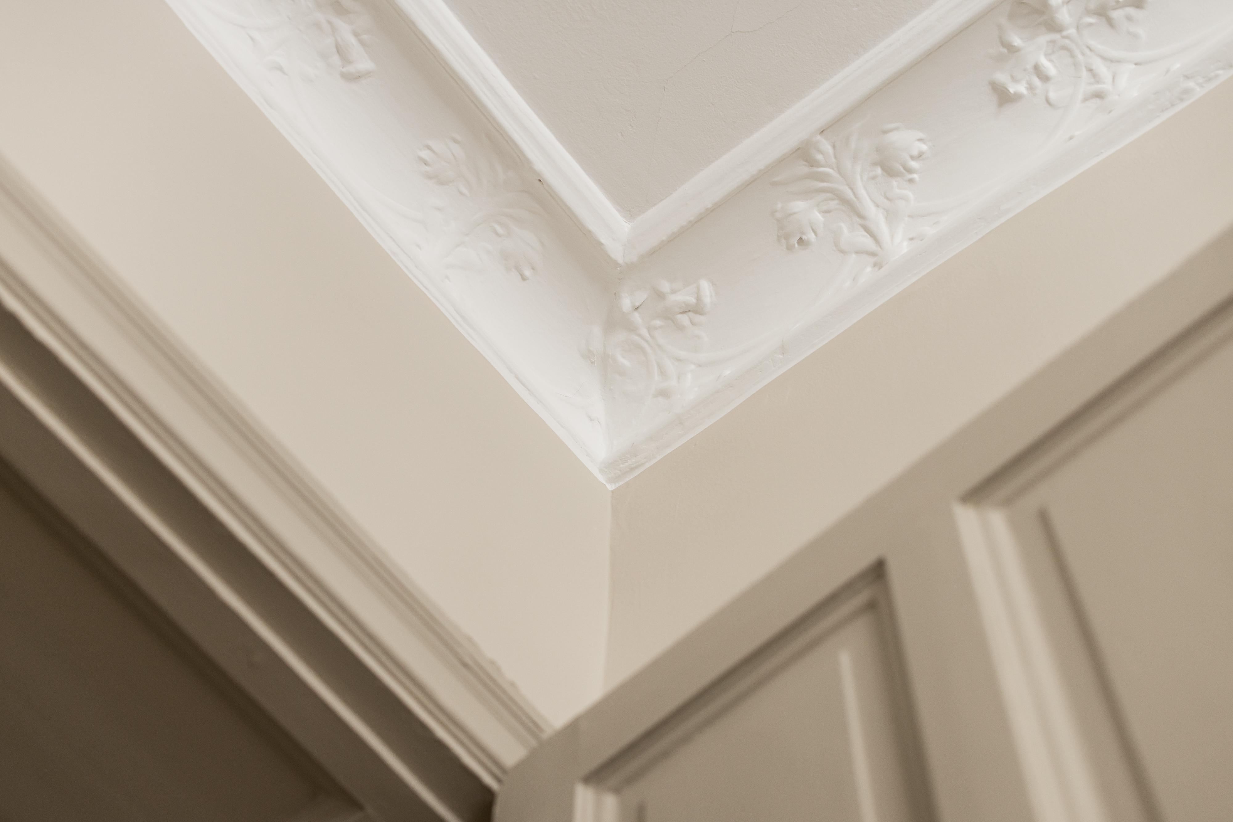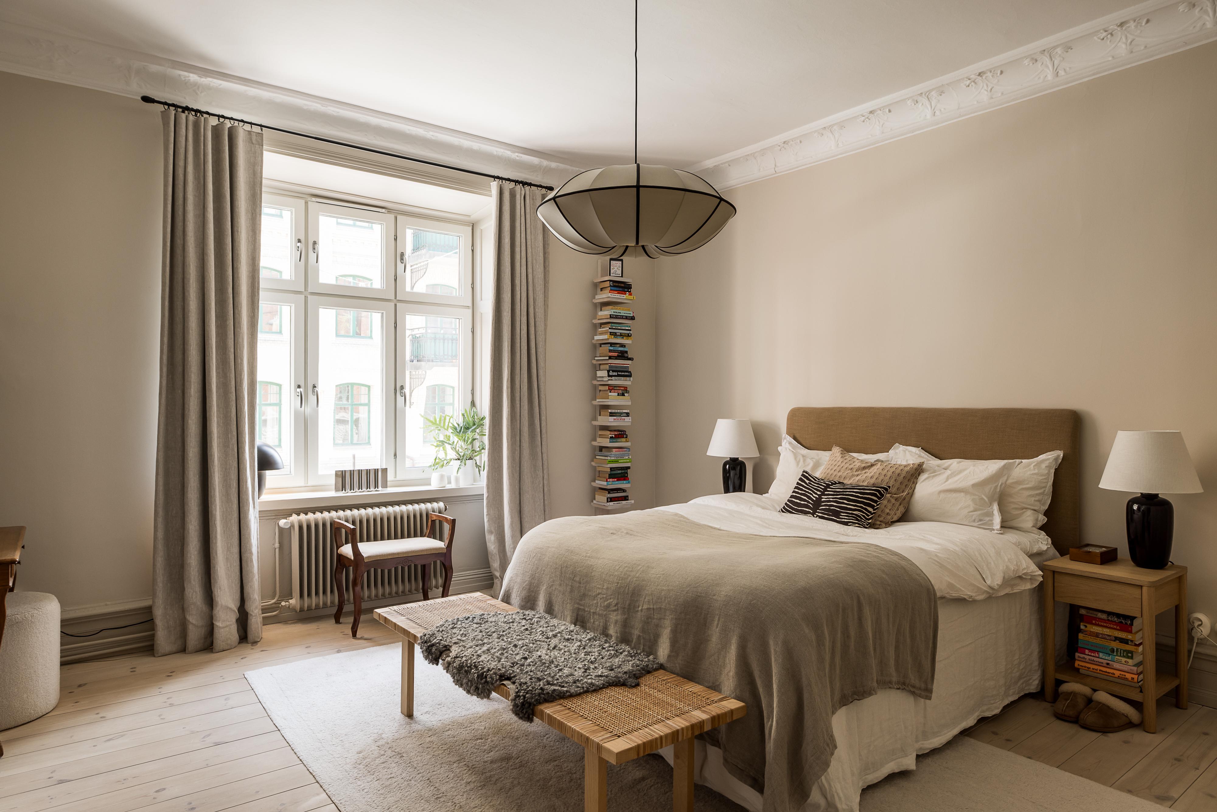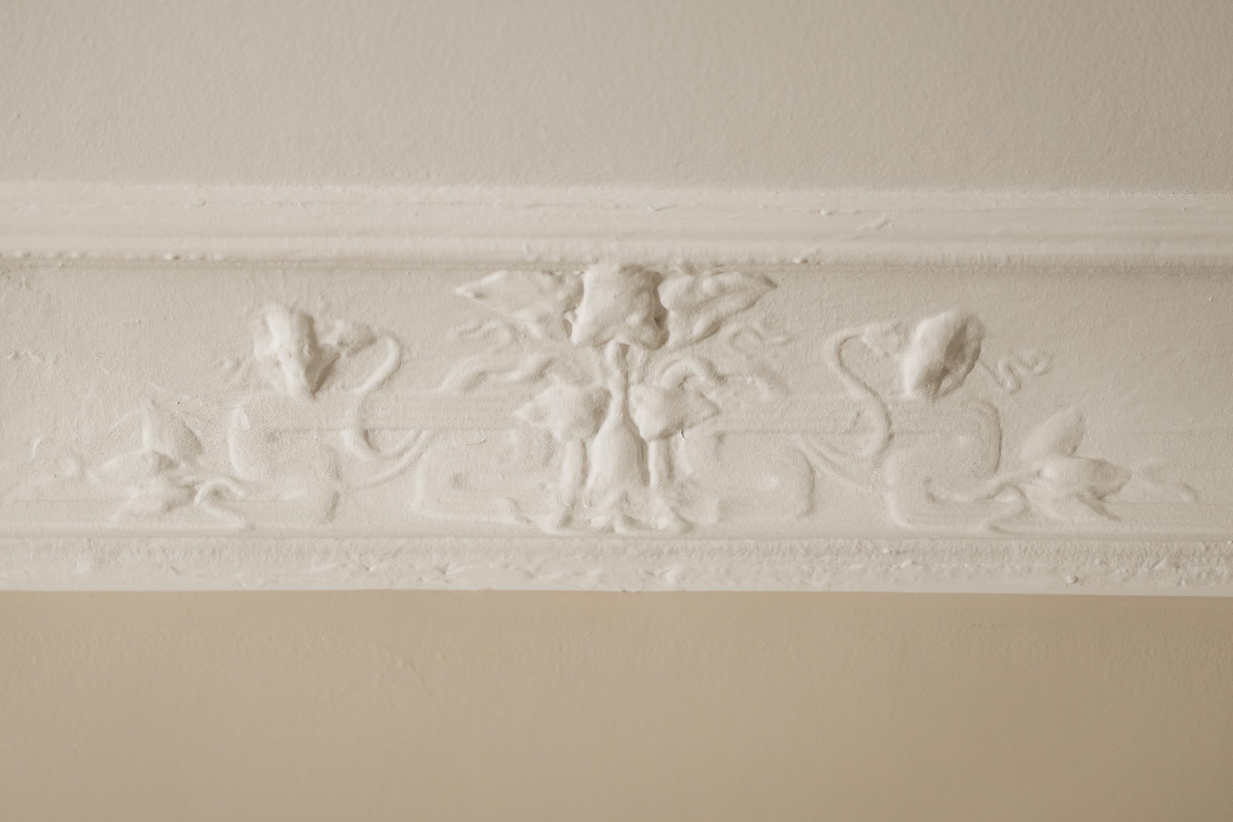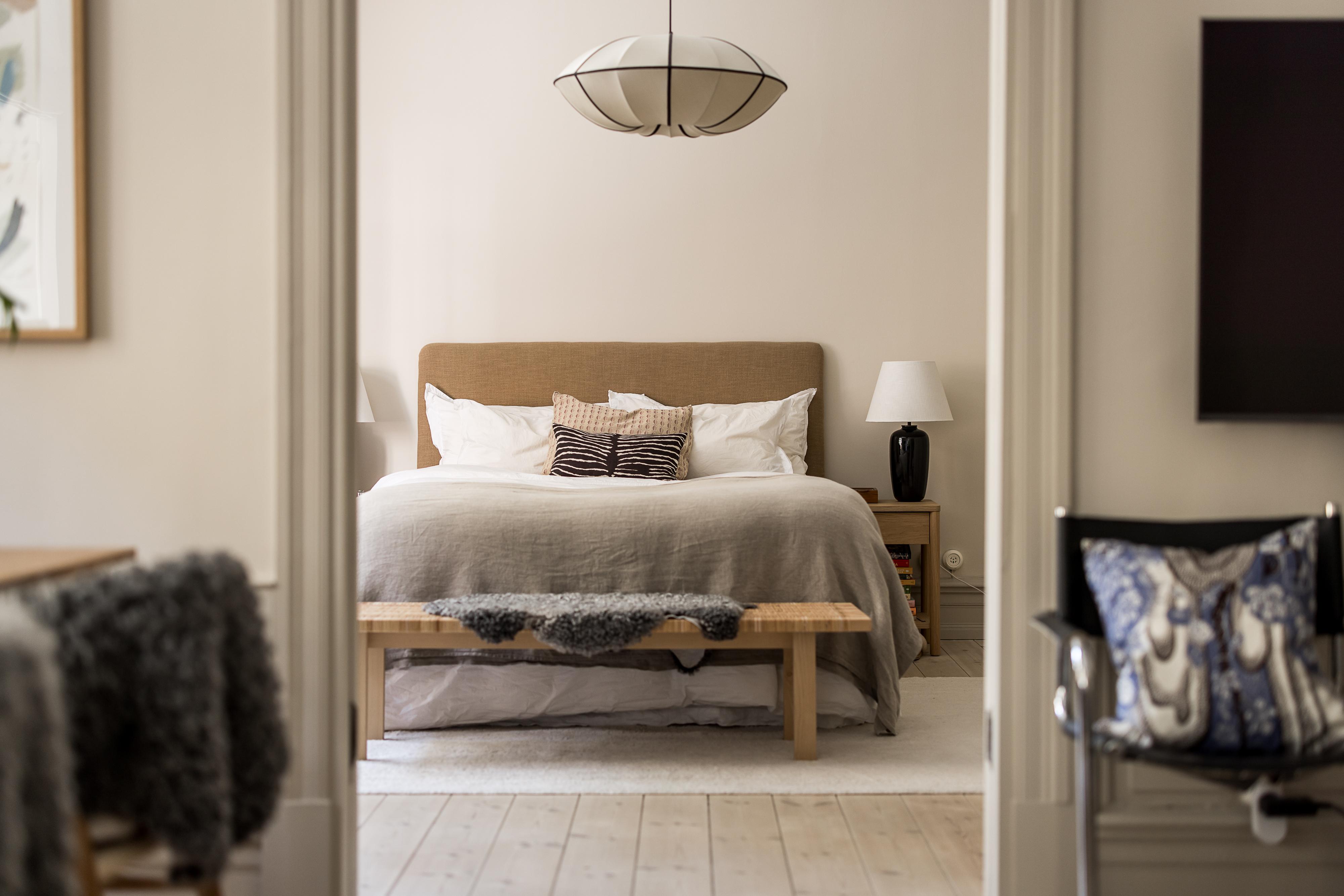 Bostaden bär spår av tidens vackra ideal med höga tak, bevarad stuckatur och genomgående vitsåpade brädgolv. Samtidigt har hemmet varsamt förädlats genom åren. Köket, badrummet och samtliga ytskikt har renoverats löpande med en tydlig känsla för material, färg och helhet. Resultatet är ett hem där varje detalj samspelar i en dämpad och harmonisk palett.