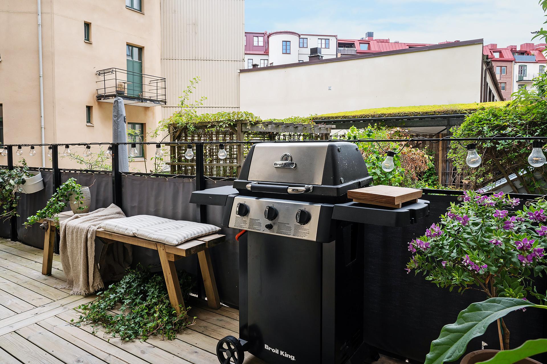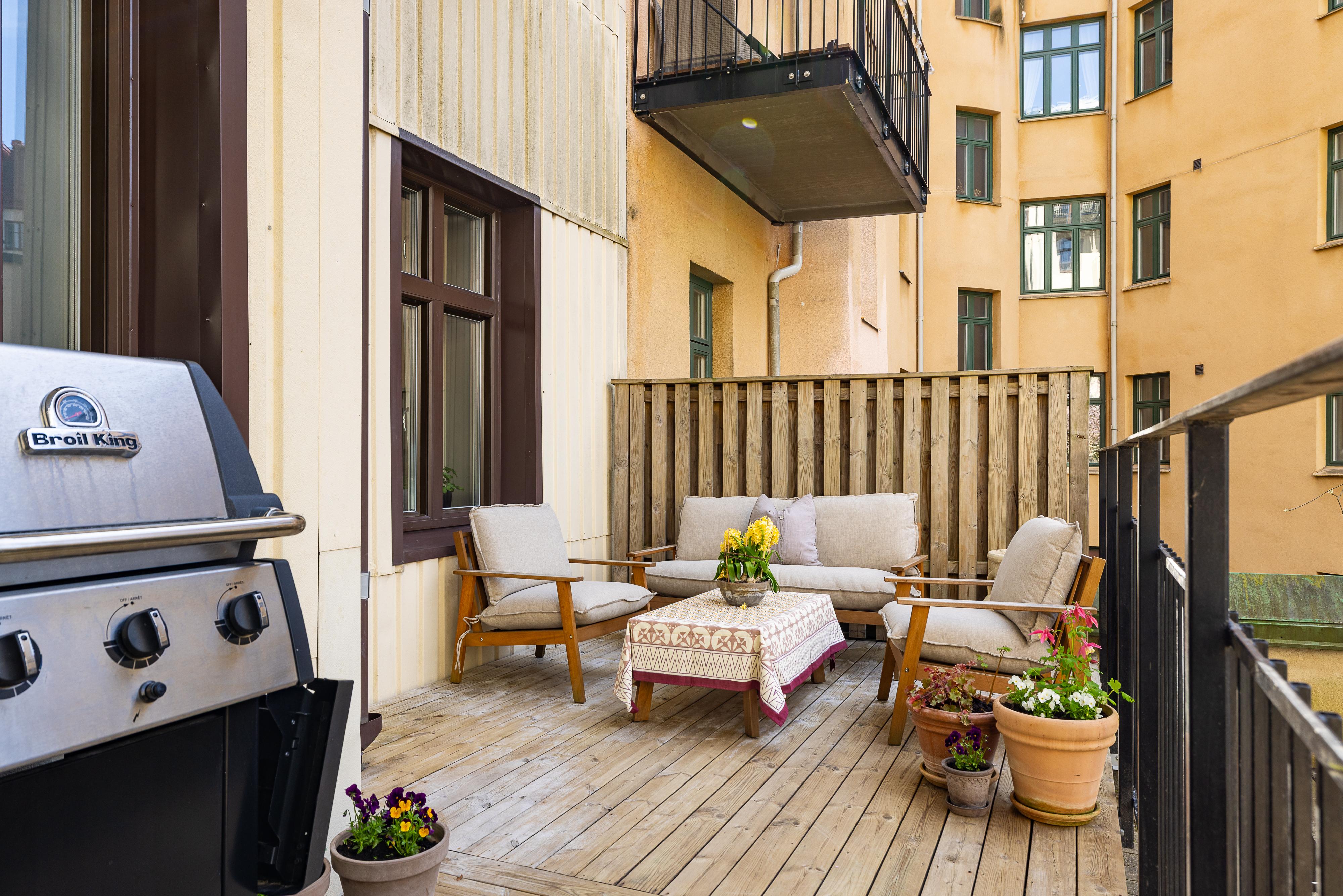 Med utgång från köket nås den sagolika terrassen som får anses vara unik i ett sekelskifteshus mitt i Linnéstaden - nästan 20 kvm stor och belägen i soligt västerläge mot föreningens renoverade innegård. Terrassen ger en underbar "huskänsla" och är lite upphöjd från den gemensamma gården. Duka upp med långbord och bjud hem vännerna på kräftskiva eller njut av en lugn stund i en solsäng, storleken ger plats åt både sittgrupp, solstolar, parasoll, kryddodlingar och torkställning för tvätten. Ett fint tidstypiskt smidesräcke med väv ramar in och på golvet ligger trall. Terrassen byggdes 2013 i samband med att de övriga lägenheterna byggde balkonger in mot gården.