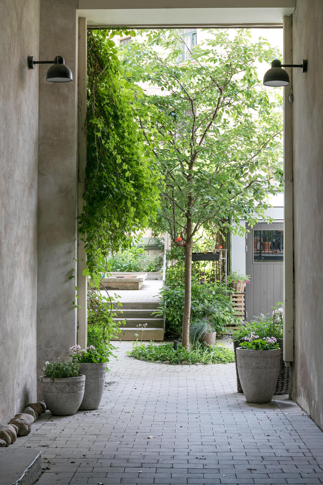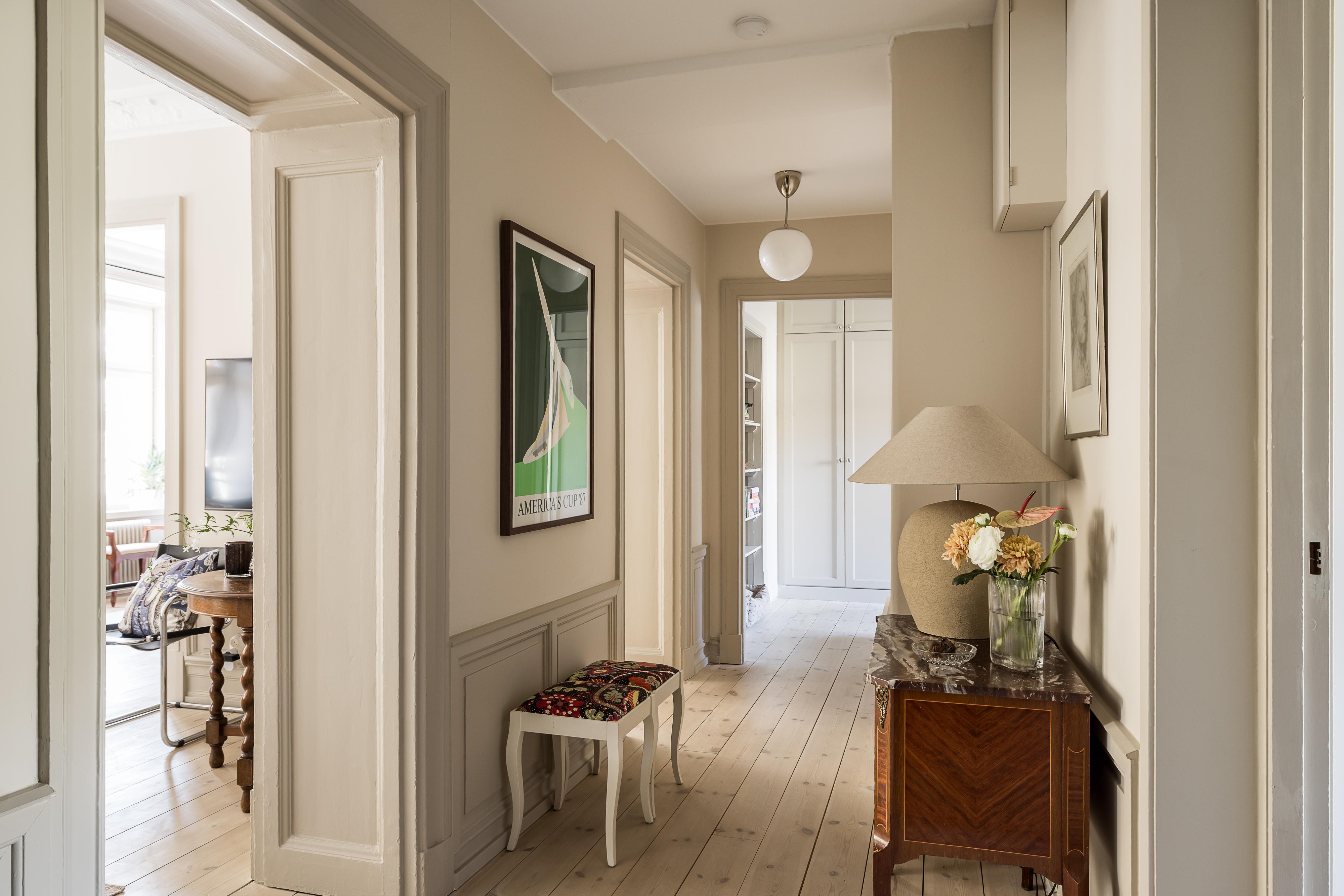 Redan i trapphuset anas innergårdens goa känsla. Här finns ro och stilla frid bortom stadens brus och i det välkomnande trapphuset kan man beskåda de nyinsatta säkerhetsdörrarna som bekostats av föreningen. Innergården nås också via Risåsgatans port om man kommer från det hållet. Två halvtrappor upp välkomnar en stor och luftig hall med gott om plats för både jackor och skor i form av väggfasta skåp. Hallen leder vidare till samtliga rum och blir lite av lägenhetens nav. Från de olika öppningarna till de övriga rummen kan man se solen strila in. Precis innanför entrédörren ligger klinker från Marrakech Design som sedan övergår i vitsåpat furuplank medan väggar och snickerier är målade i en ljus nyans.