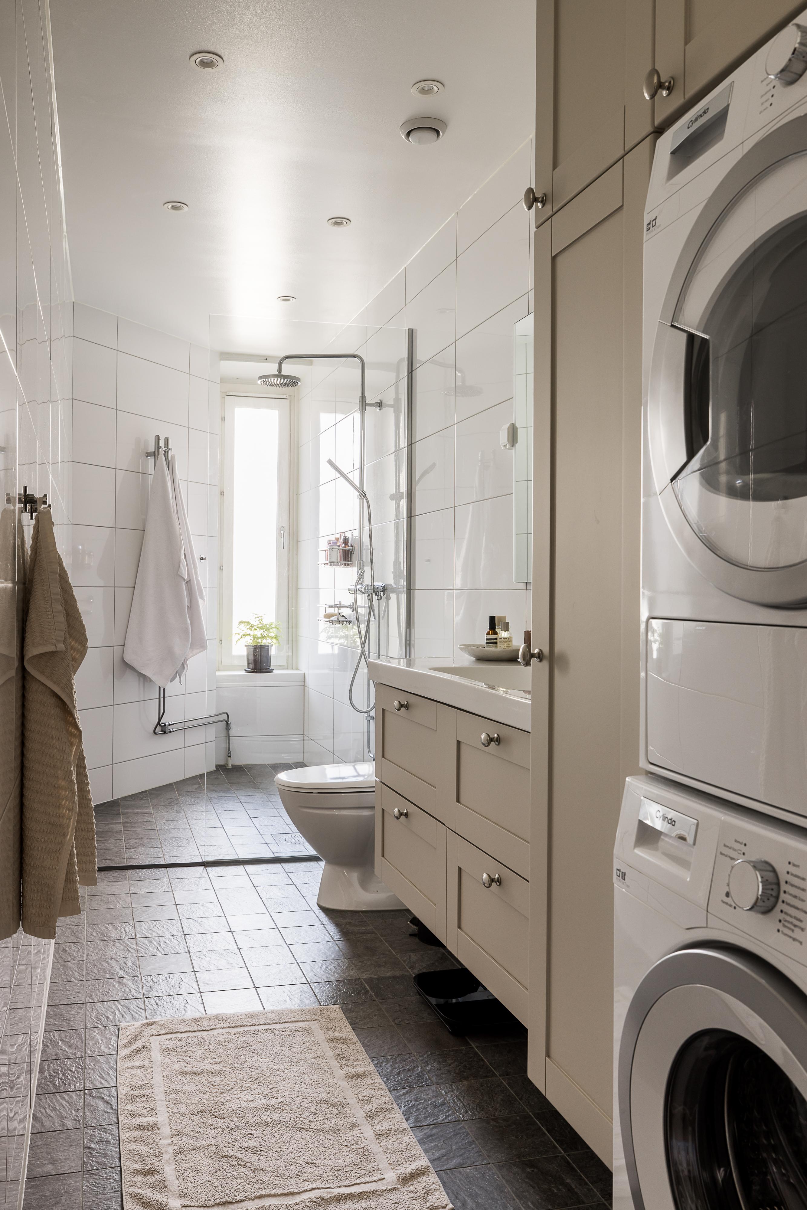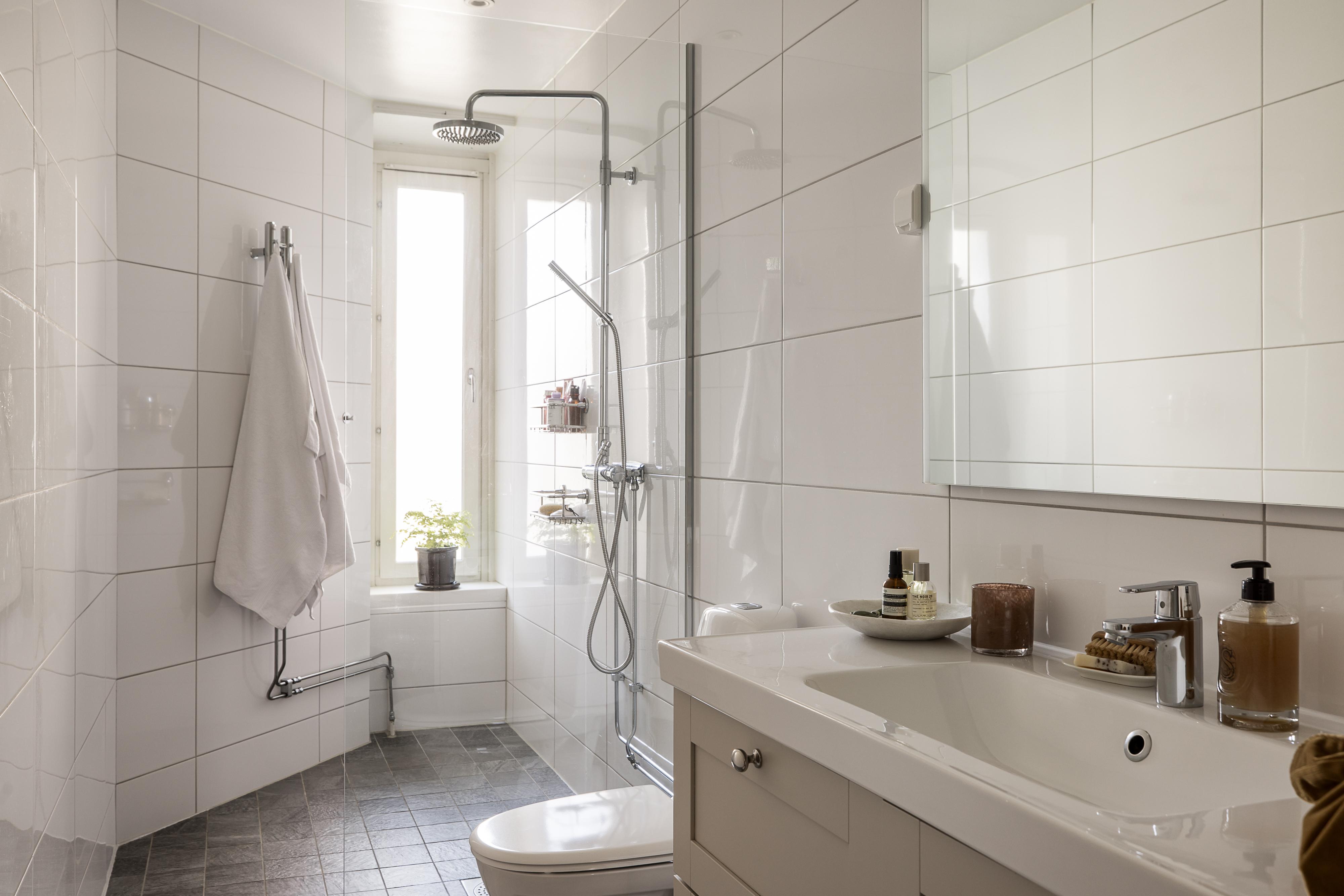 Badrummet präglas av lyxig vardagskänsla med praktisk design och påkostade lösningar. Renoverat av fackmän (kvalitetsdokument finns) med plats för både lyx och funktion. Längst in finns ett fönster mot innergården i väster och här finns en rymlig dusch med en snygg glasvägg. Väggarna är kaklade med vita stora kakelplattor och golvet pryds av mörkgrå klinker från Italgraniti med underliggande golvvärme. Nyligen lät nuvarfande ägare en snickare platsbygga badrumsmöbler för att optimera förvaringen. Ovanpå kommoden finns ett handfat med en översittande bred spegel och belysning från Deco. Badrummet är också utrustat med en handukstork från Deco. Direkt innanför dörren finns en tvättpelare med både tvättmaskin och torktumlare. Fönstret släpper in rikligt med naturligt dagsljus men kvällstid när mörkret faller på tänds med fördel de infällda spotlightsen i taket.
