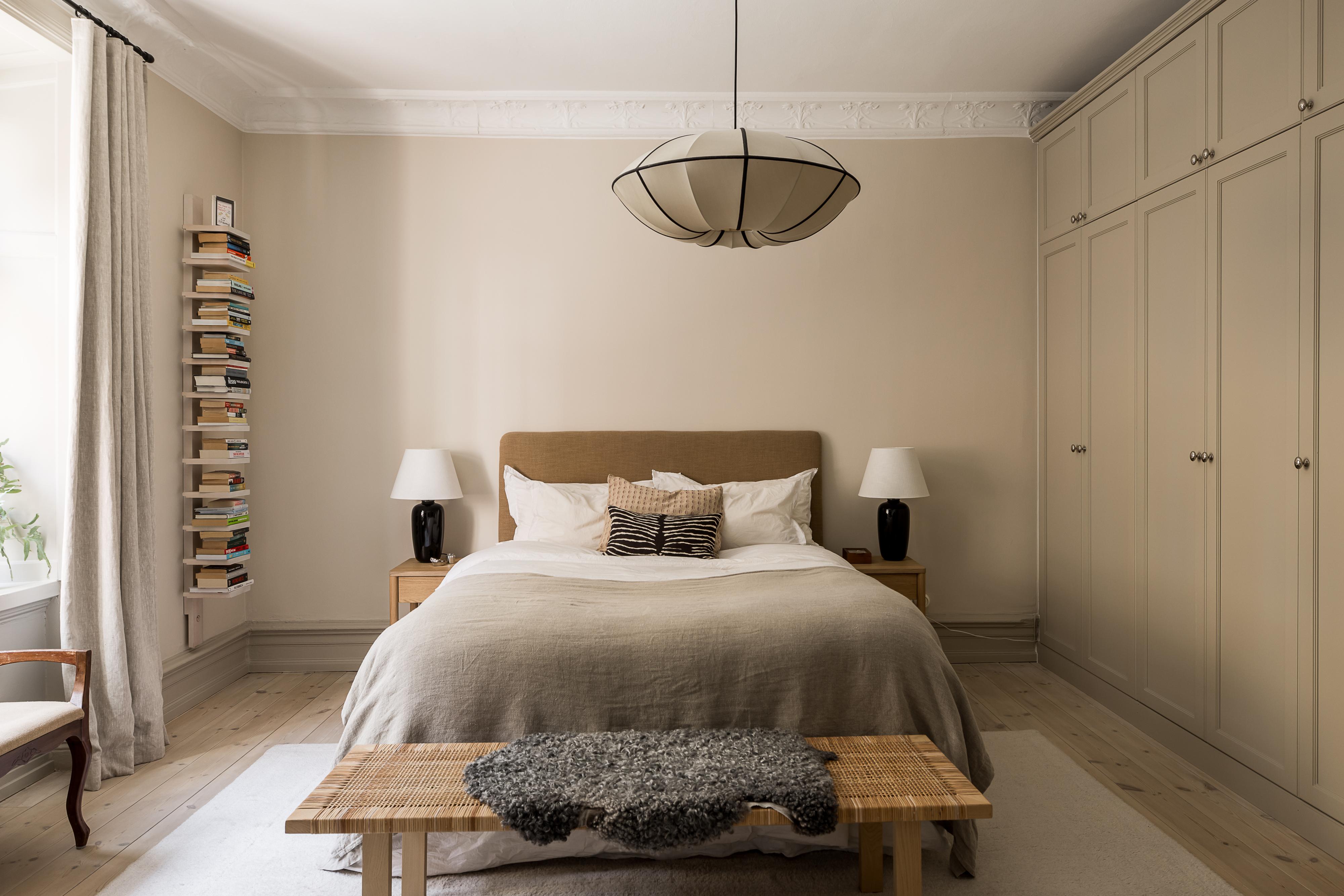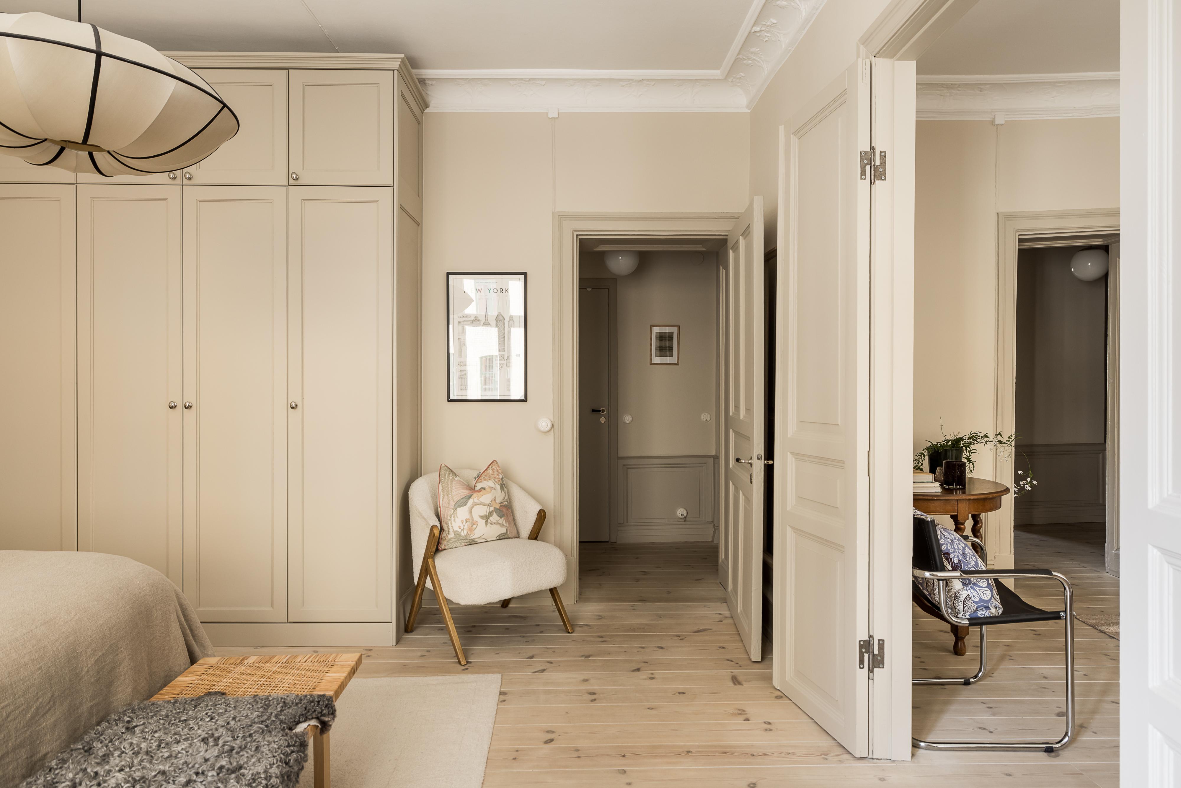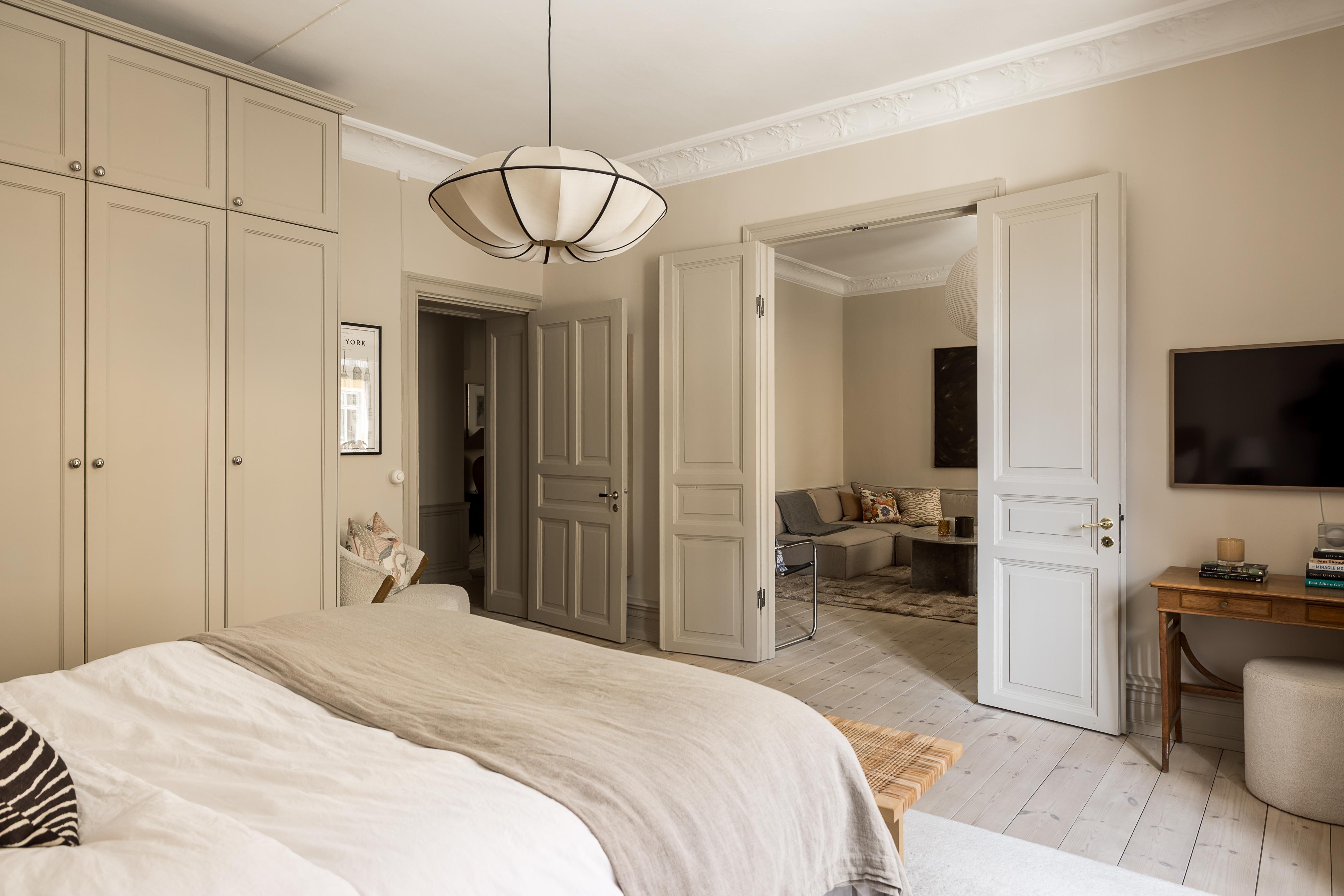 I fil med vardagsrummet och med ett rejält treluftsfönster mot Kastellgatan ligger det rum som idag används som master bedroom. Då sovrummet in mot gården också ger plats åt dubbelsäng kan detta med fördel även nyttjas som matsal. Ca tre meter upp ramas taket in av stuckatur samt takrosett och golvet som även här består av vitsåpade furuplank ramas in av höga profilerade fotlister och panel. Den genomgående och kringgående planlösningen med öppningar åt både hallen och vardagsrummet ger en hemtrevlig känsla. Färgskalan från vardagsrummet går igen även här inne, vilket ger en behagligt vilsam bas. Längs ena väggen finns fem platsbyggda garderober för klädförvaring. Massiva profilerade pardörrar avskiljer detta rum från vardagsrummet.