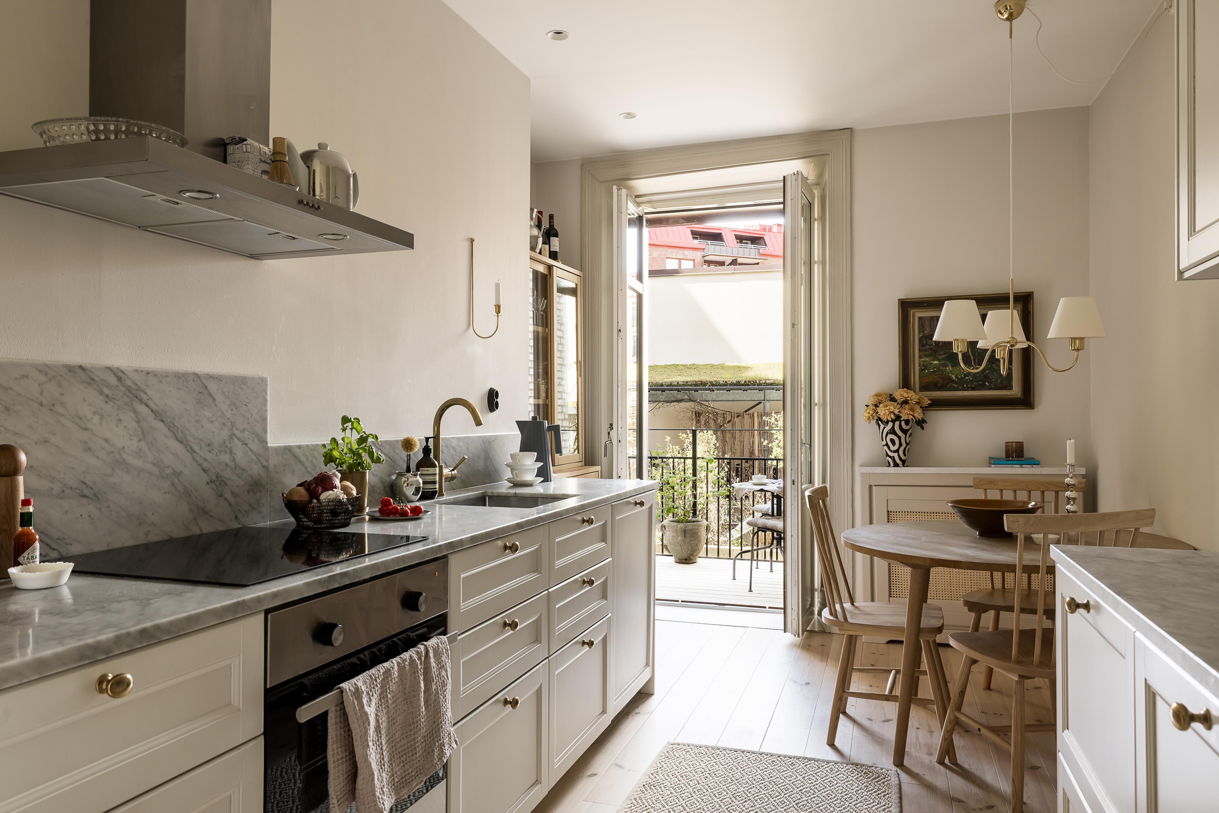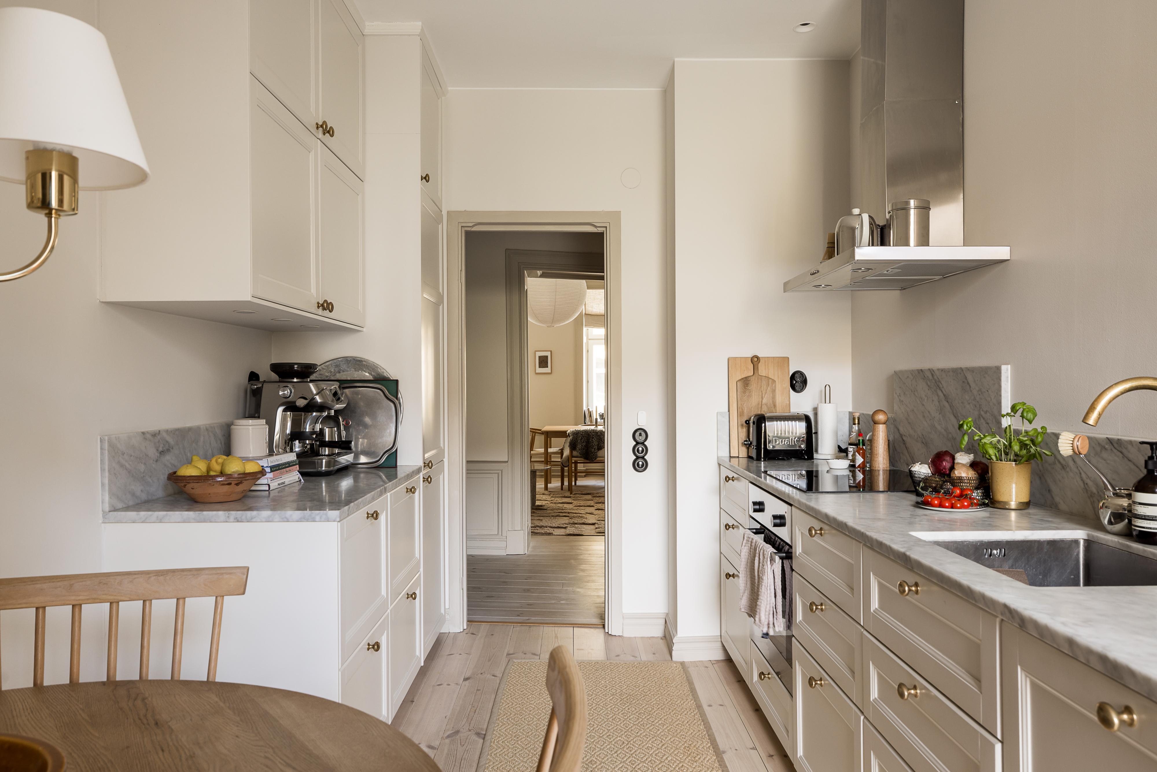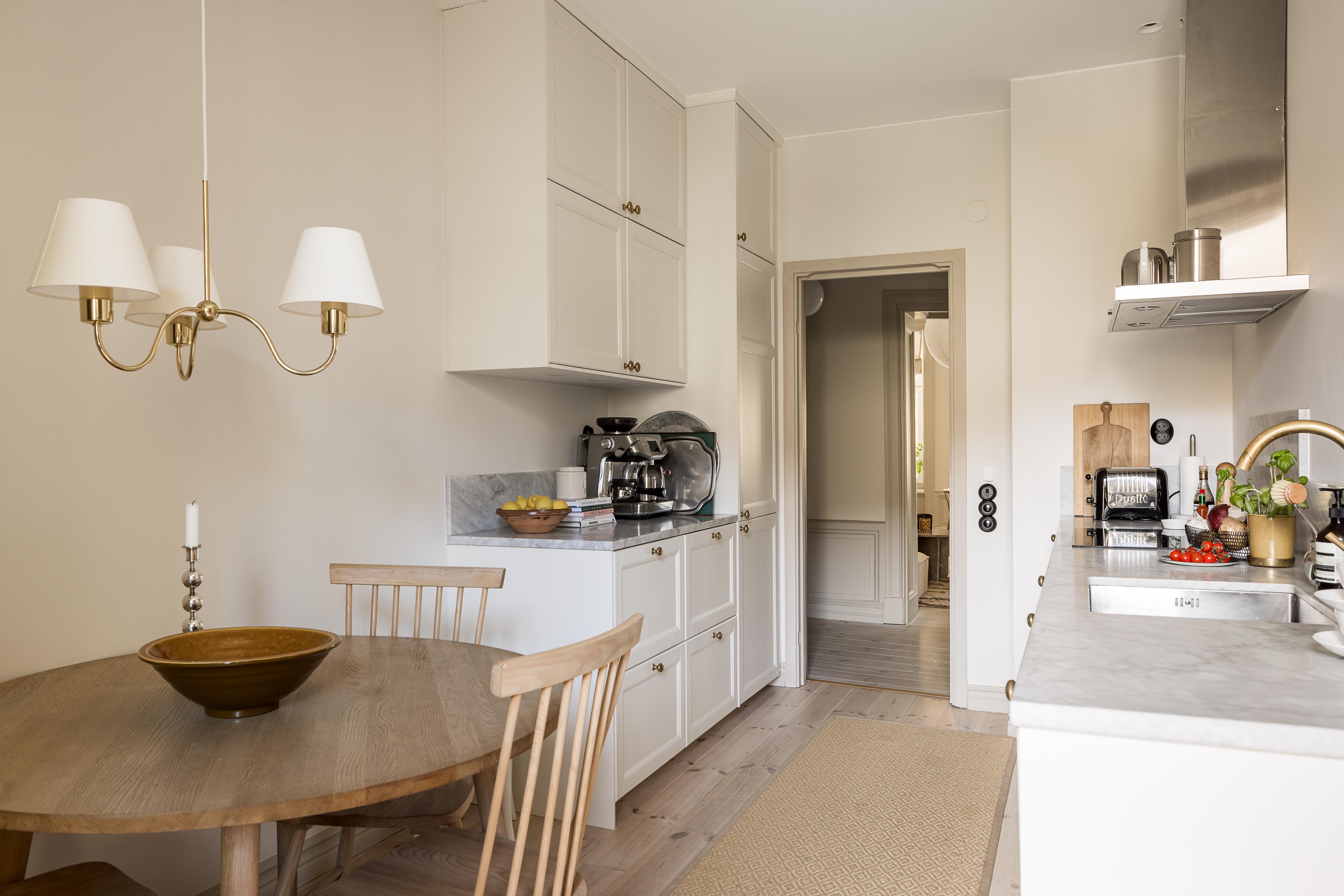 Till höger om hallen ligger köket som renoverats med klassisk profilerad köksinredning i vitt med generösa arbetsytor av Carraramarmor bryts fint av med beigemålade väggar och bänkskiva av Carrarmamror som också utgör ett fint stänkskydd. Med glasade dörrar mot terrassen och innergården ges nästan känslan av att bo i hus och sommartid intas både frukost, lunch och middag utomhus. Alldeles innanför altandörrarna ryms ett matbord där hela familjen kan samlas. Den maskinella utrustningen består av integrerad kyl och frys, induktionshäll med ovansittande kolfilterfläkt, ugn och integrerad diskmaskin. De profilerade köksluckorna har nyligen lackerats om i en bruten vit nyans som ger en fin harmoni till mässingdetaljerna. Infällda spotlights ger en behaglig belysning.