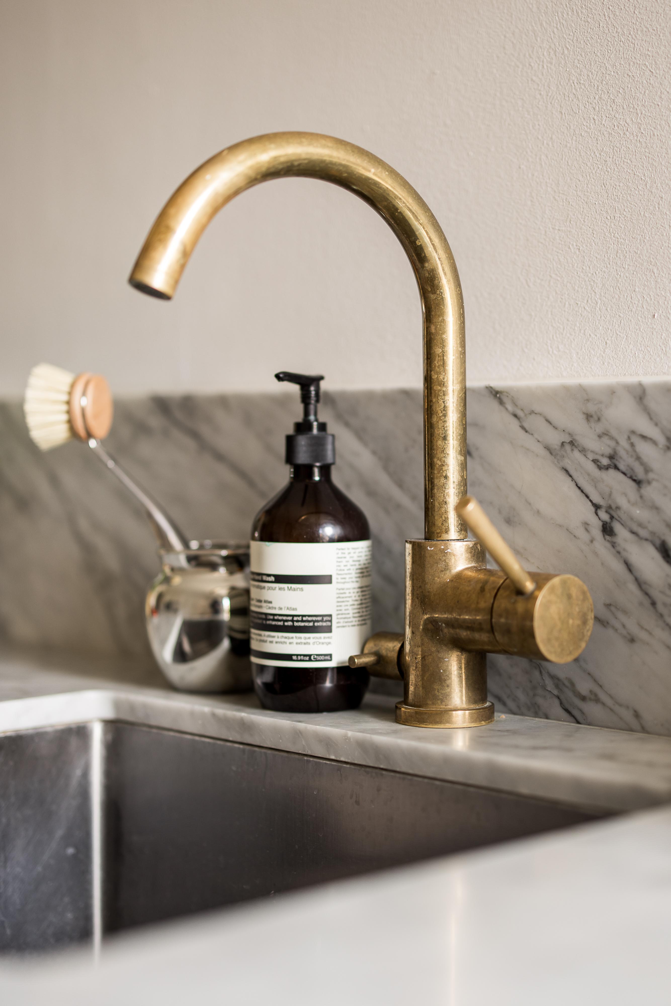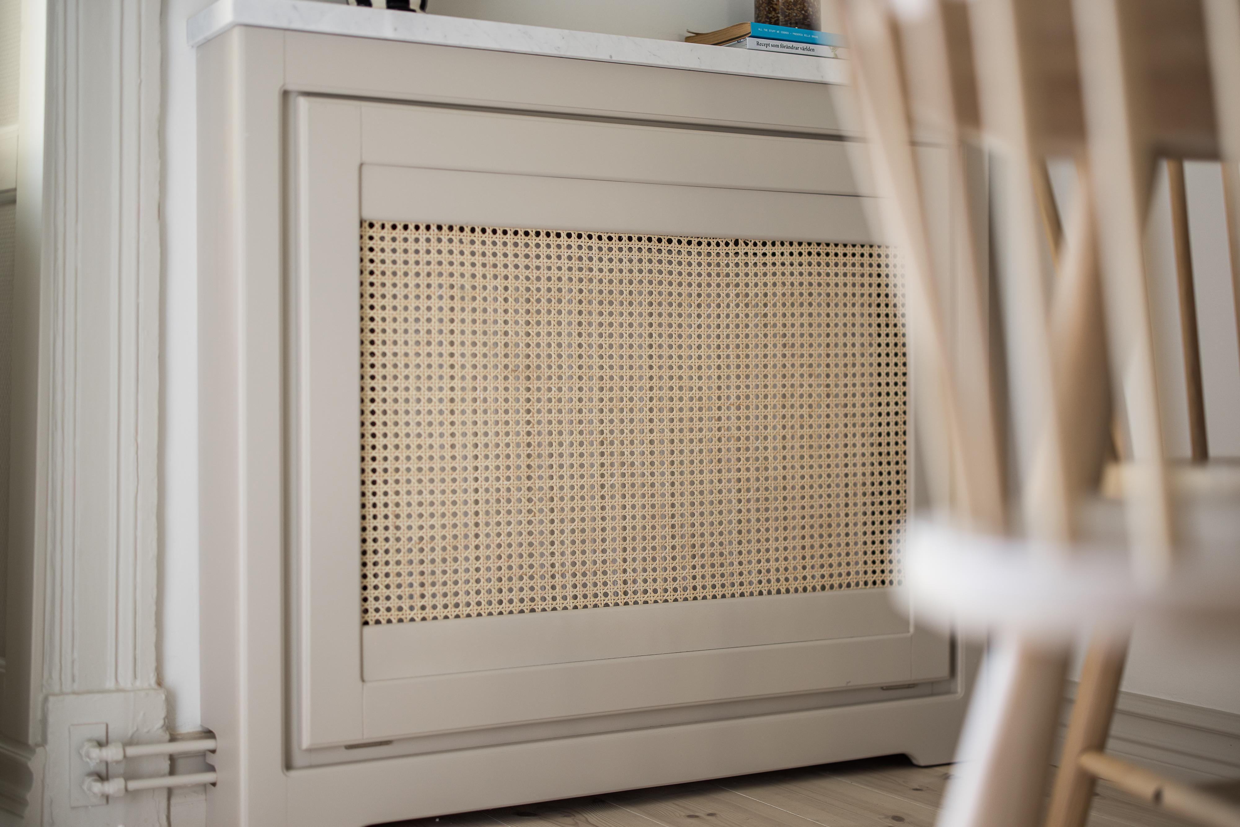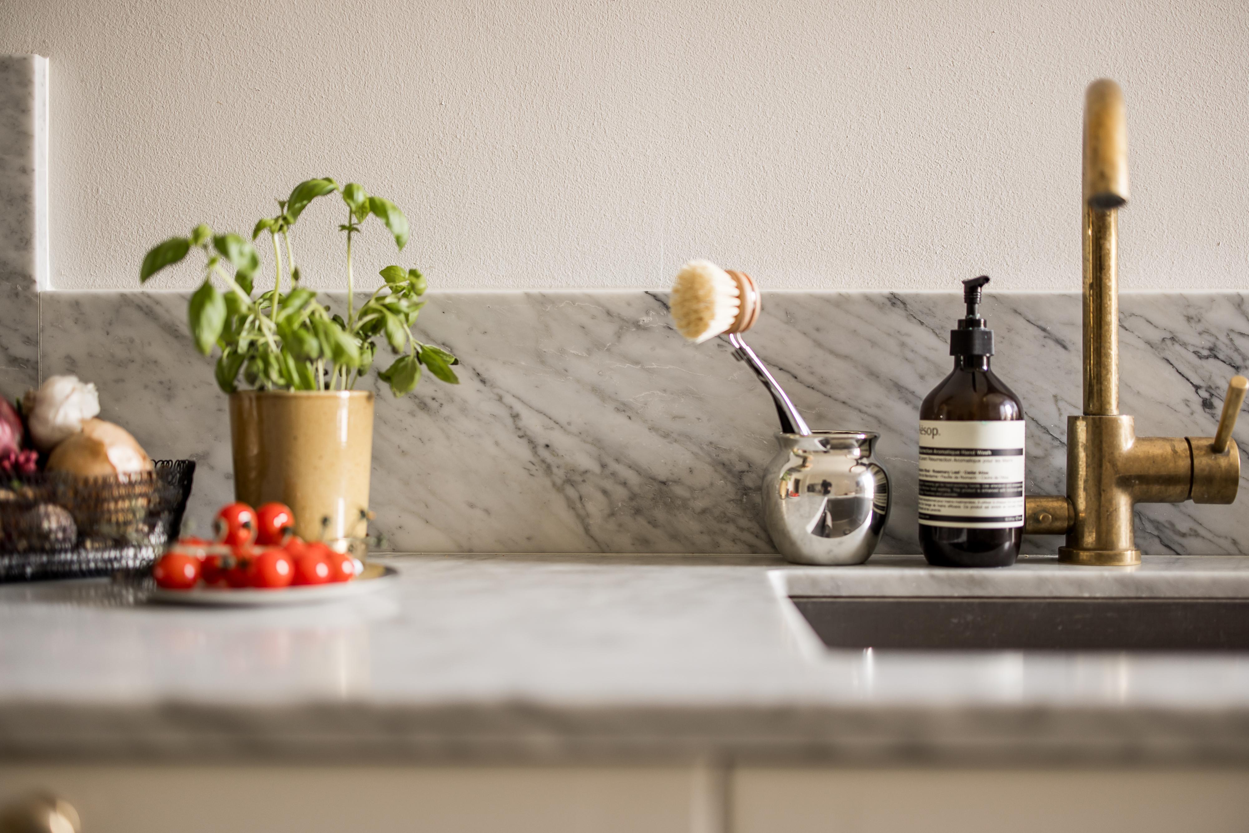 Till höger om hallen ligger köket som renoverats med klassisk profilerad köksinredning i vitt med generösa arbetsytor av Carraramarmor bryts fint av med beigemålade väggar och bänkskiva av Carrarmamror som också utgör ett fint stänkskydd. Med glasade dörrar mot terrassen och innergården ges nästan känslan av att bo i hus och sommartid intas både frukost, lunch och middag utomhus. Alldeles innanför altandörrarna ryms ett matbord där hela familjen kan samlas. Den maskinella utrustningen består av integrerad kyl och frys, induktionshäll med ovansittande kolfilterfläkt, ugn och integrerad diskmaskin. De profilerade köksluckorna har nyligen lackerats om i en bruten vit nyans som ger en fin harmoni till mässingdetaljerna. Infällda spotlights ger en behaglig belysning.