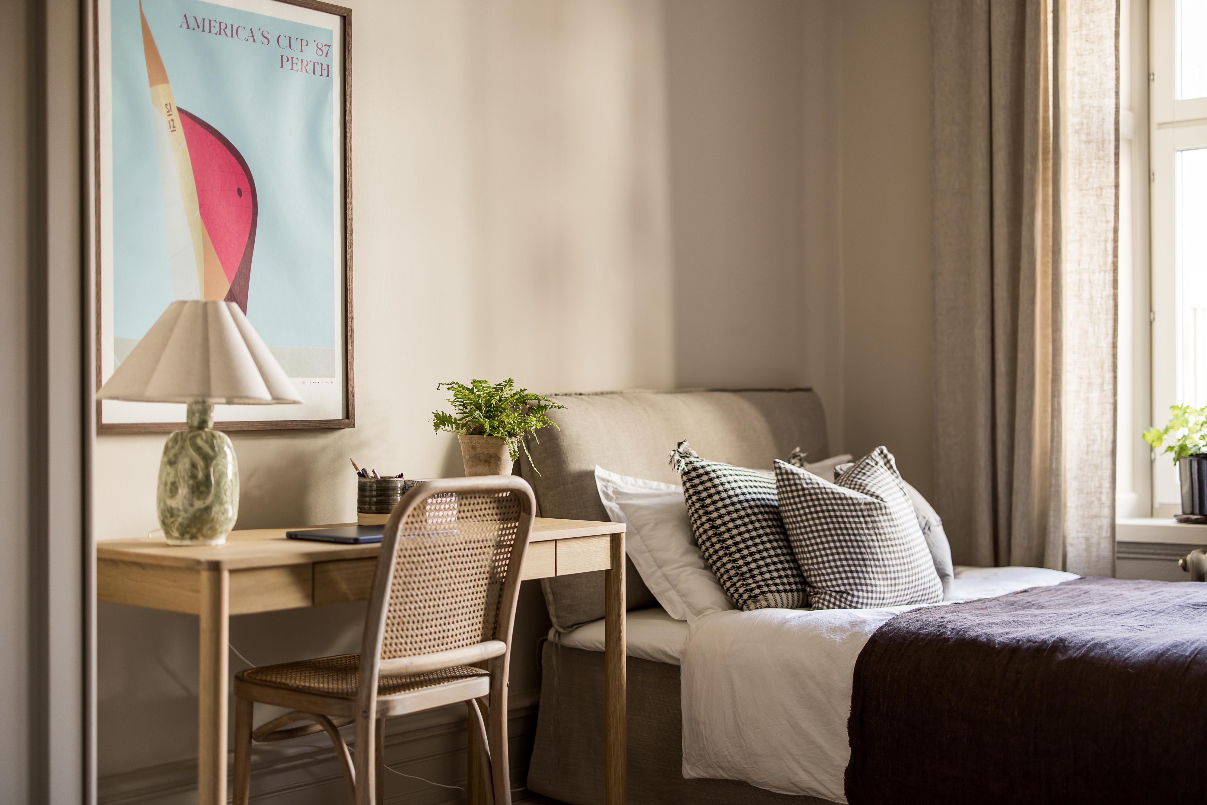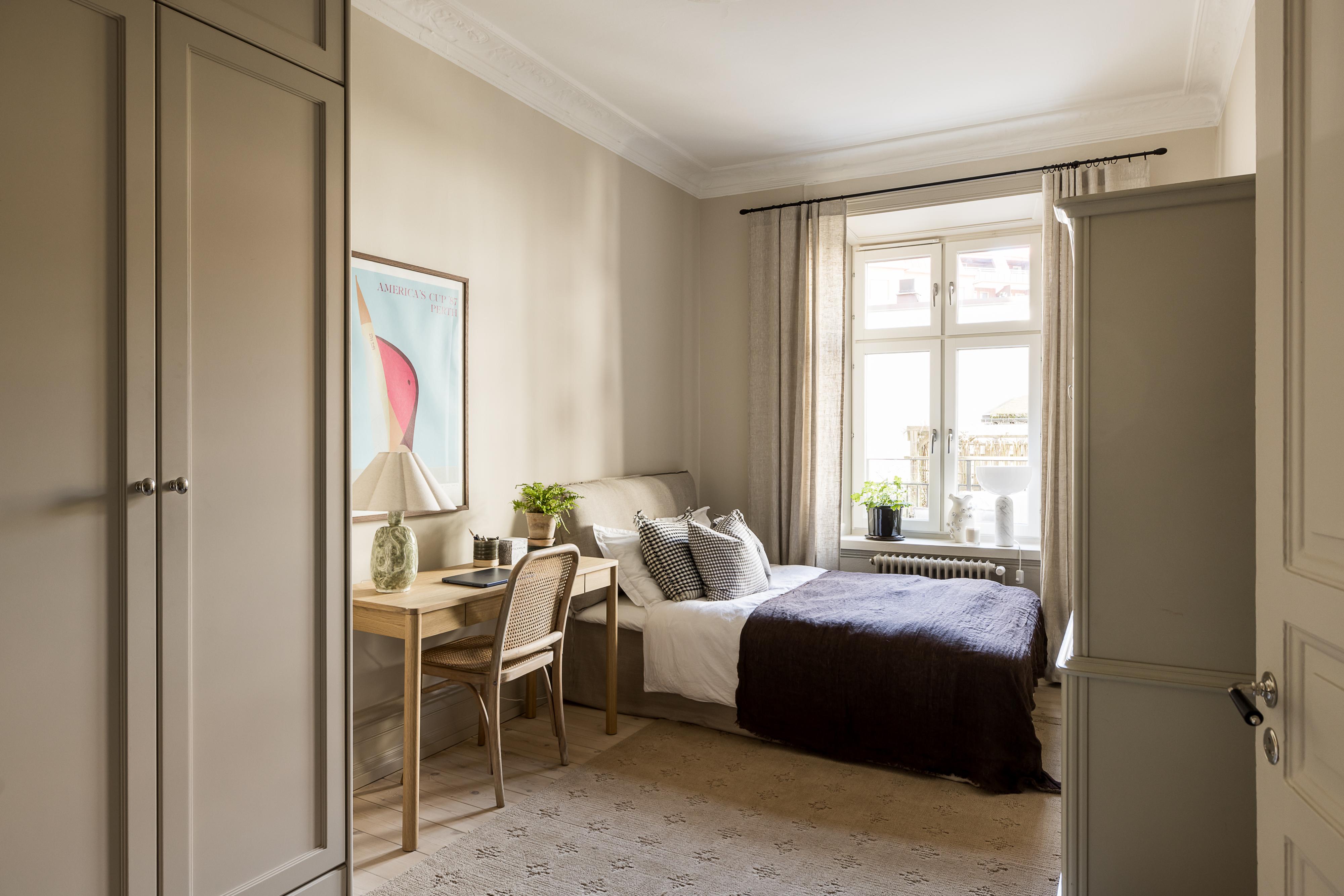 Med fönster mot den lugna innergården vetter det rum som idag nyttjas som kombinerat gästrum/arbetsrum. Här är det ovanligt tyst och fridfullt och det är svårt att tro att man befinner sig i en storstad. Detta rum rymmer gott och väl en dubbelsäng och förslagsvis en byrå eller fåtölj. Fyra platsbyggda garderober erbjuder bra förvaringsmöjligheter och i en tidigare igensatt dörröppning har man skapat en infälld bokhylla. Även här inne finns stuckaturen i fint bevarat skick med tillhörande takrosett och vitsåpat brädgolv.