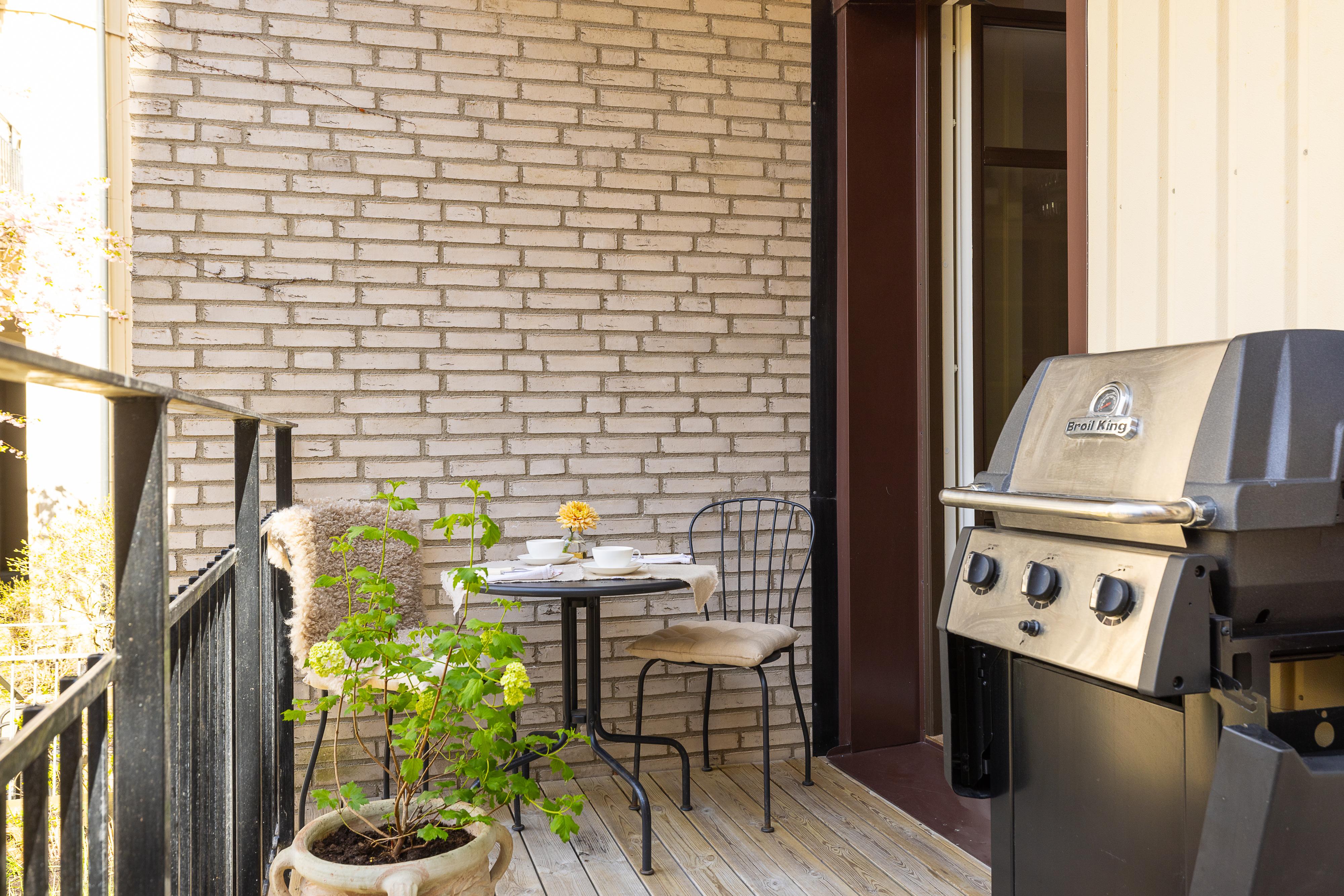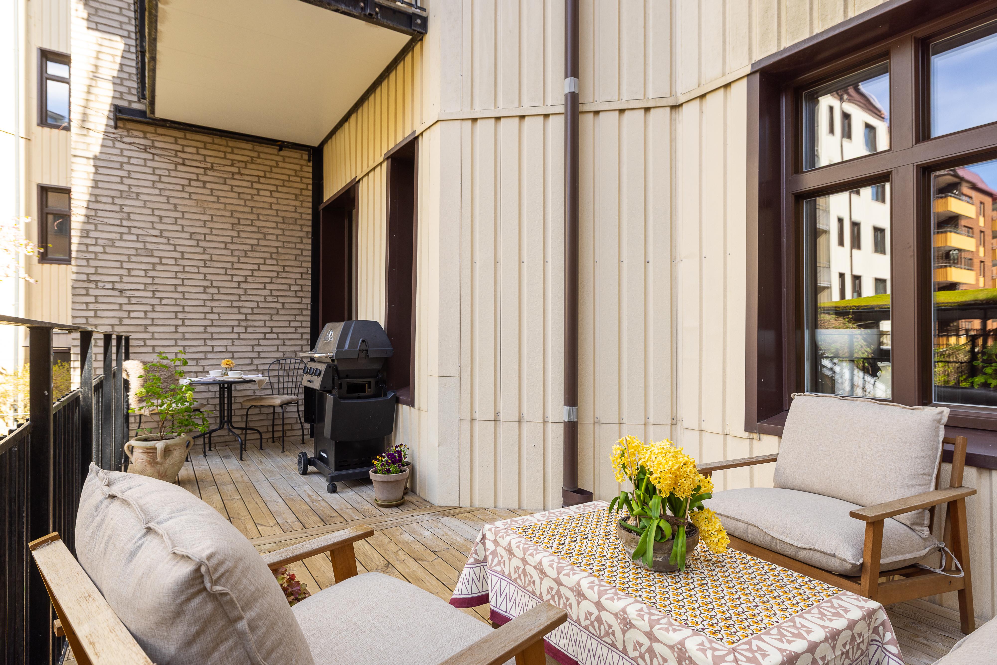 En stilla oas mitt i staden, där sekelskiftets själ möter en sällsynt frihetskänsla. Här väntar en trerummare från 1907 med något så ovanligt som en generös terrass om närmare 20 kvadratmeter i soligt västerläge. Uteplatsen vetter mot en grönskande och omsorgsfullt omhändertagen innergård och skapar en känsla av ett eget litet hus, mitt bland stadens kvarter. Eftermiddagens och kvällens sol dröjer sig kvar och låter måltider och stunder utomhus få ta plats i lugn och ro. Under de senaste åren har hemmet varsamt förfinats med en tydlig känsla för helhet och detaljer. År 2024 målades hela lägenheten i en sammanhållen, mjuk färgskala som låter ljuset vandra stilla mellan rummen. I båda sovrummen har platsbyggda garderober skapats och målats in i väggarnas kulörer, vilket ger ett harmoniskt och skräddarsytt uttryck. Köket har uppdaterats med varsam hand. Luckorna lackerades om under 2024 och en tidigare vägg togs ned, vilket öppnade upp och gav rummet en generösare bredd. Nya spotlights har integrerats och tillför ett behagligt ljus över arbetsytorna, samtidigt som helheten känns både modern och tidlös. Även badrummet har fått nya, genomtänkta inslag. Platsbyggd förvaring skapar lugn och ordning, och under 2025 installerades en ny duschvägg som förstärker rummets rena och luftiga karaktär.