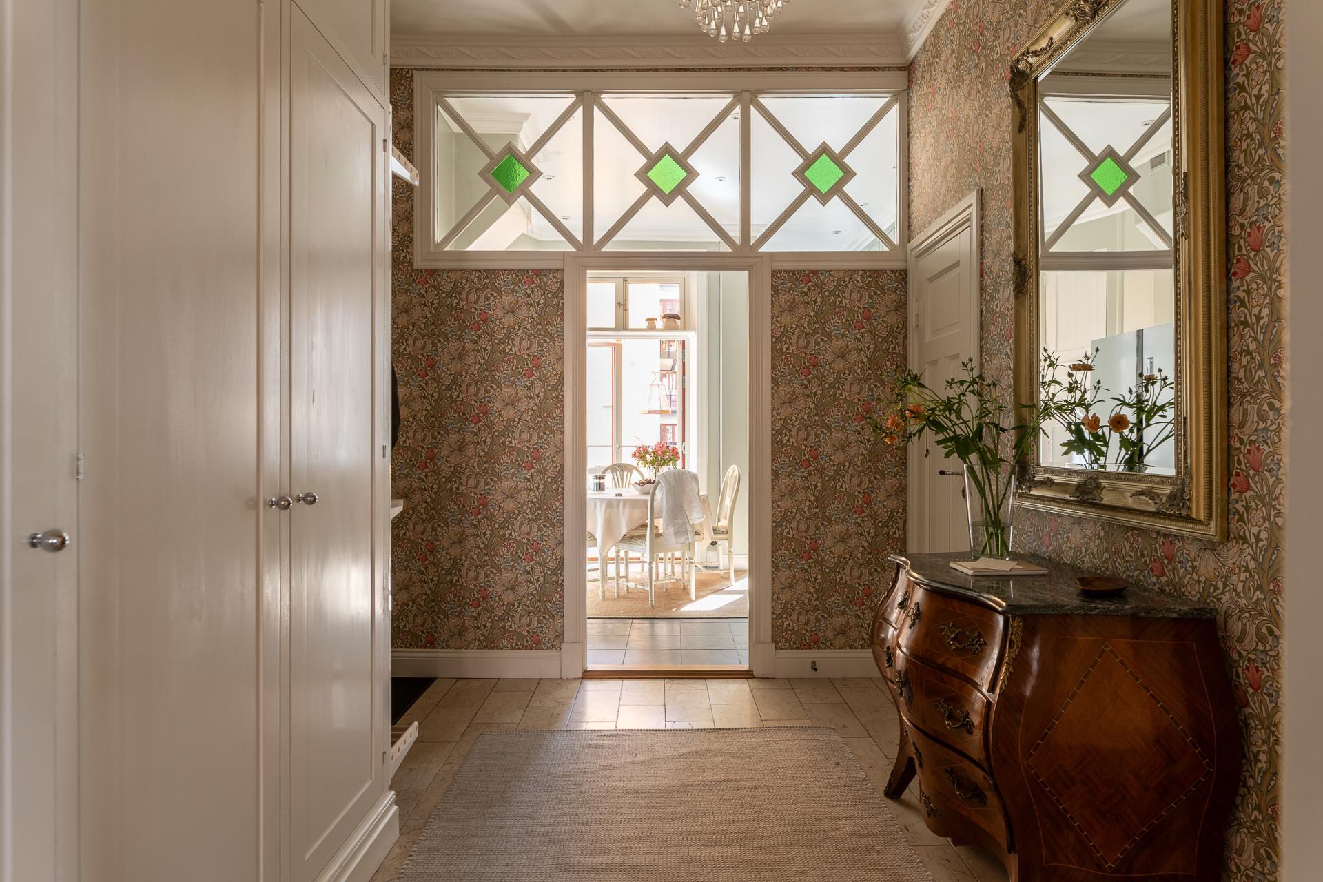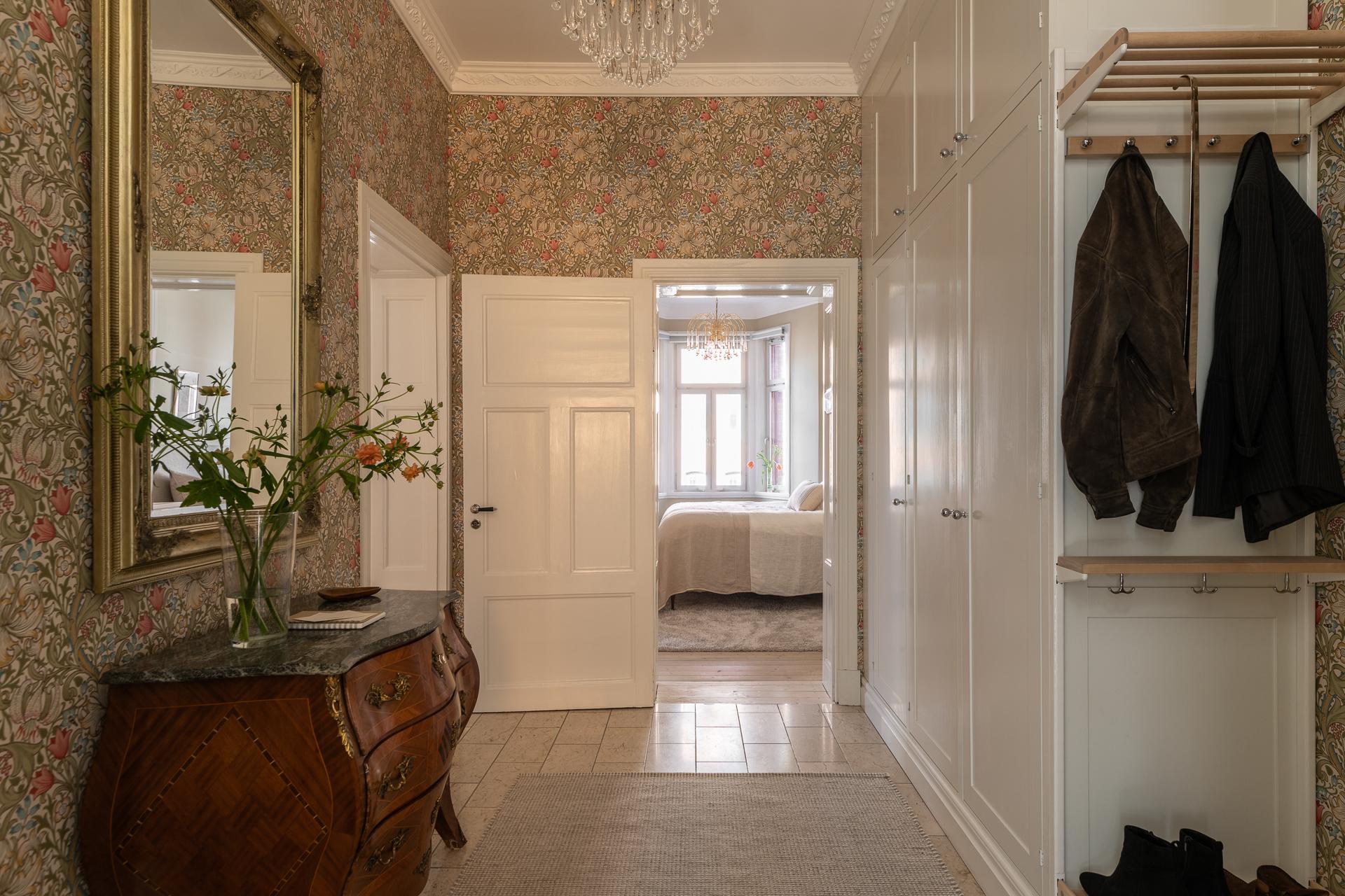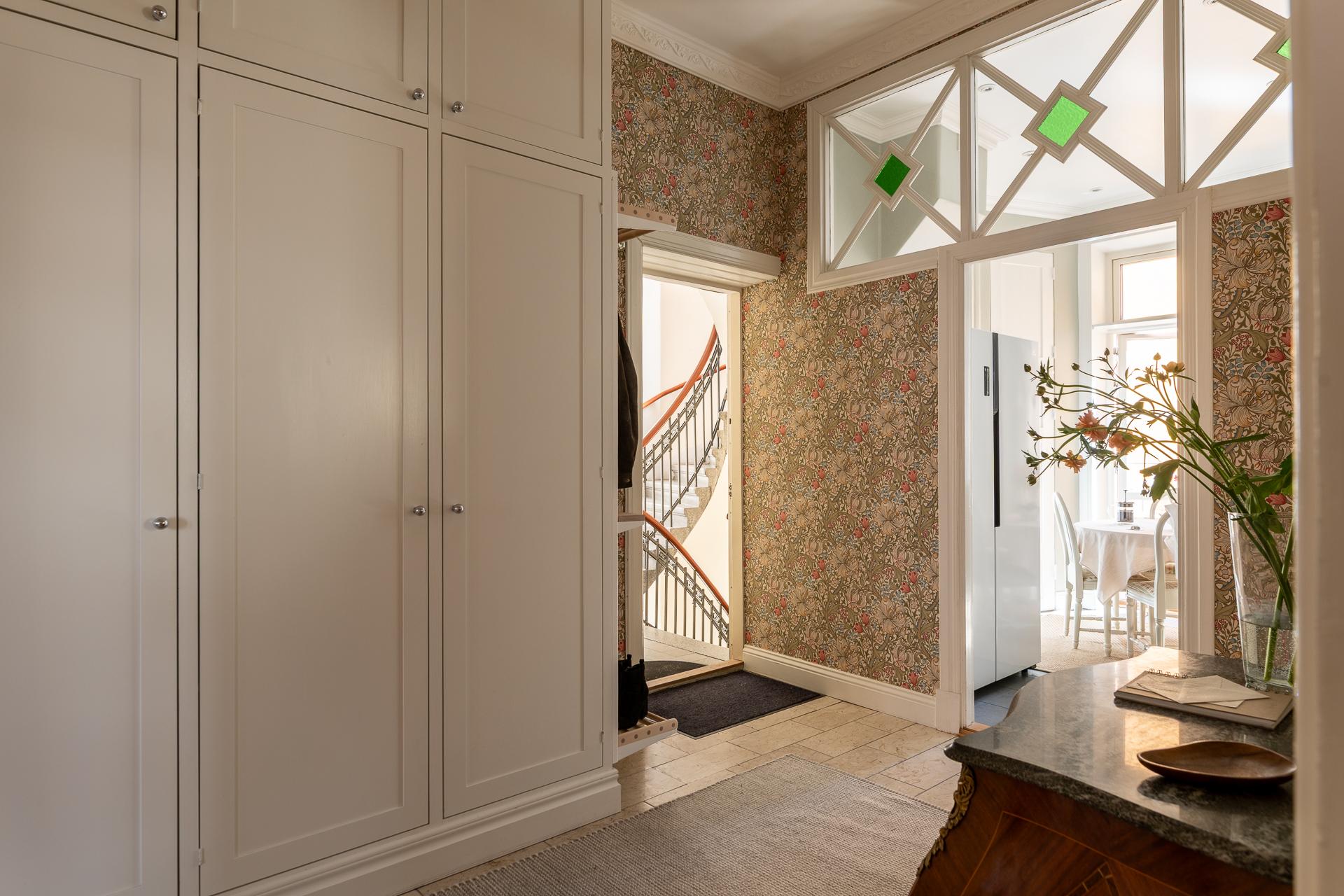 Via hissen eller trapphuset tar ni er upp till tredje våningen för att öppna upp dörren till ert nya hem. Hallen sätter genast tonen och den ljuvliga tapeten Golden Lilly från William Morris pryder väggarna. Man känner tidigt att detta är ett medvetet hem med smakfulla detaljer. Till höger finns platsbyggda garderober som rymmer alla ytterkläder ni behöver, både jackor och skor. På golvet ligger naturstensplattor vilket bidrar till det fina första intrycket.