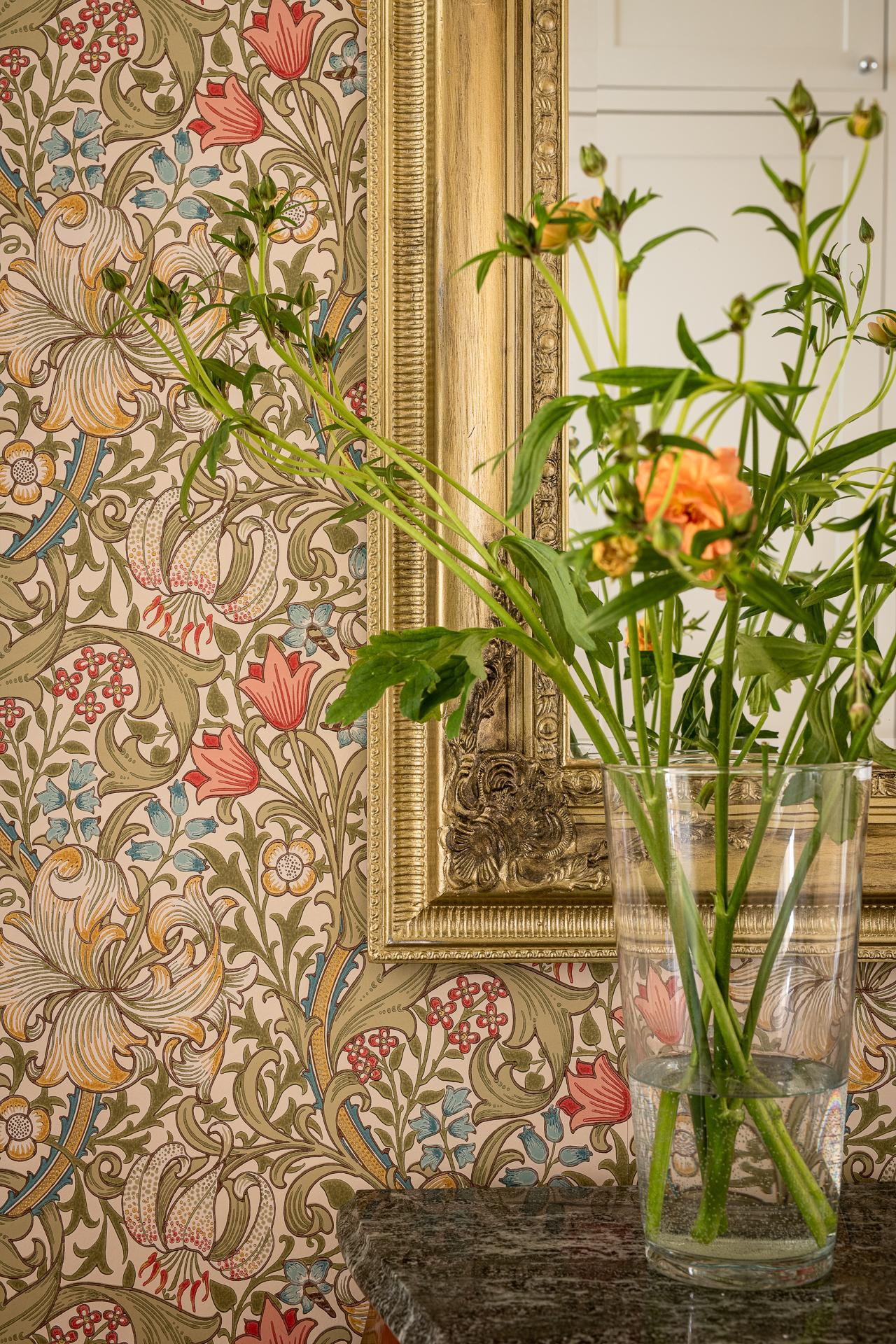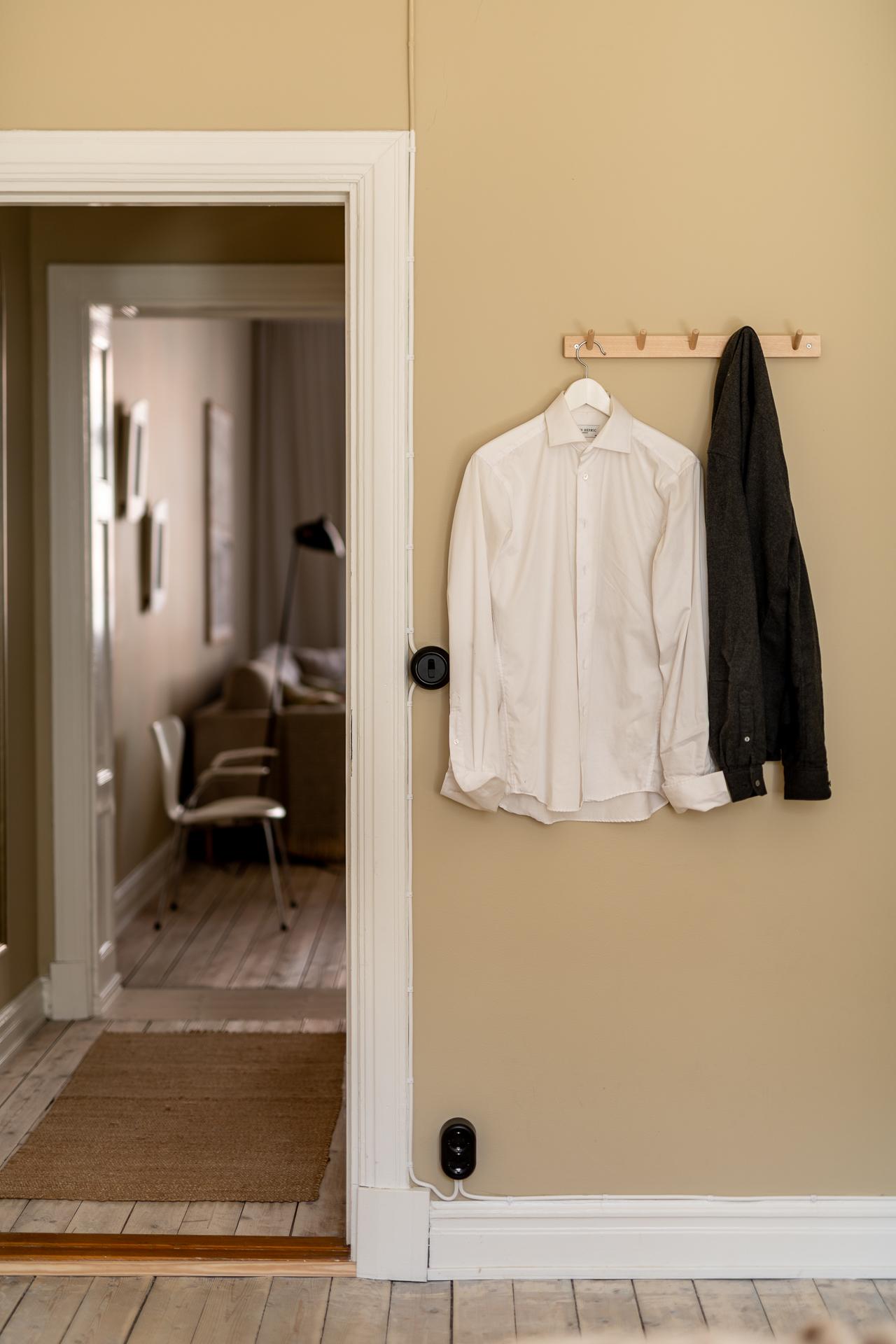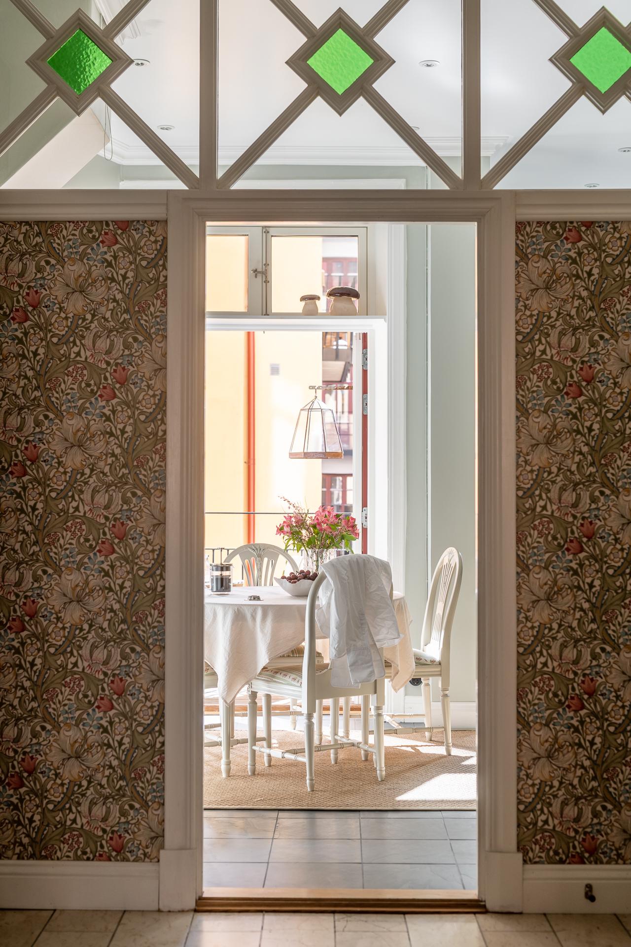Via hissen eller trapphuset tar ni er upp till tredje våningen för att öppna upp dörren till ert nya hem. Hallen sätter genast tonen och den ljuvliga tapeten Golden Lilly från William Morris pryder väggarna. Man känner tidigt att detta är ett medvetet hem med smakfulla detaljer. Till höger finns platsbyggda garderober som rymmer alla ytterkläder ni behöver, både jackor och skor. På golvet ligger naturstensplattor vilket bidrar till det fina första intrycket.