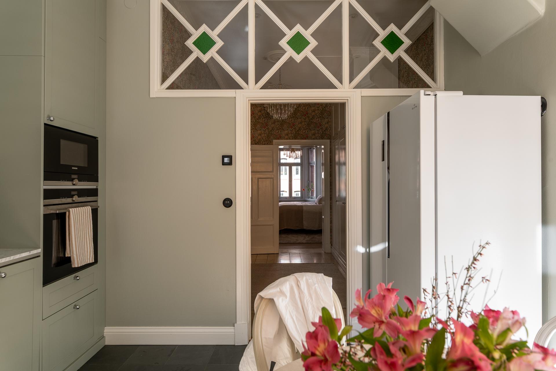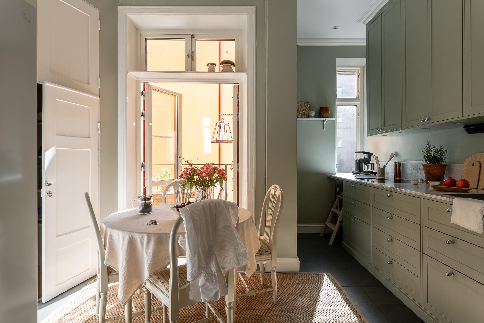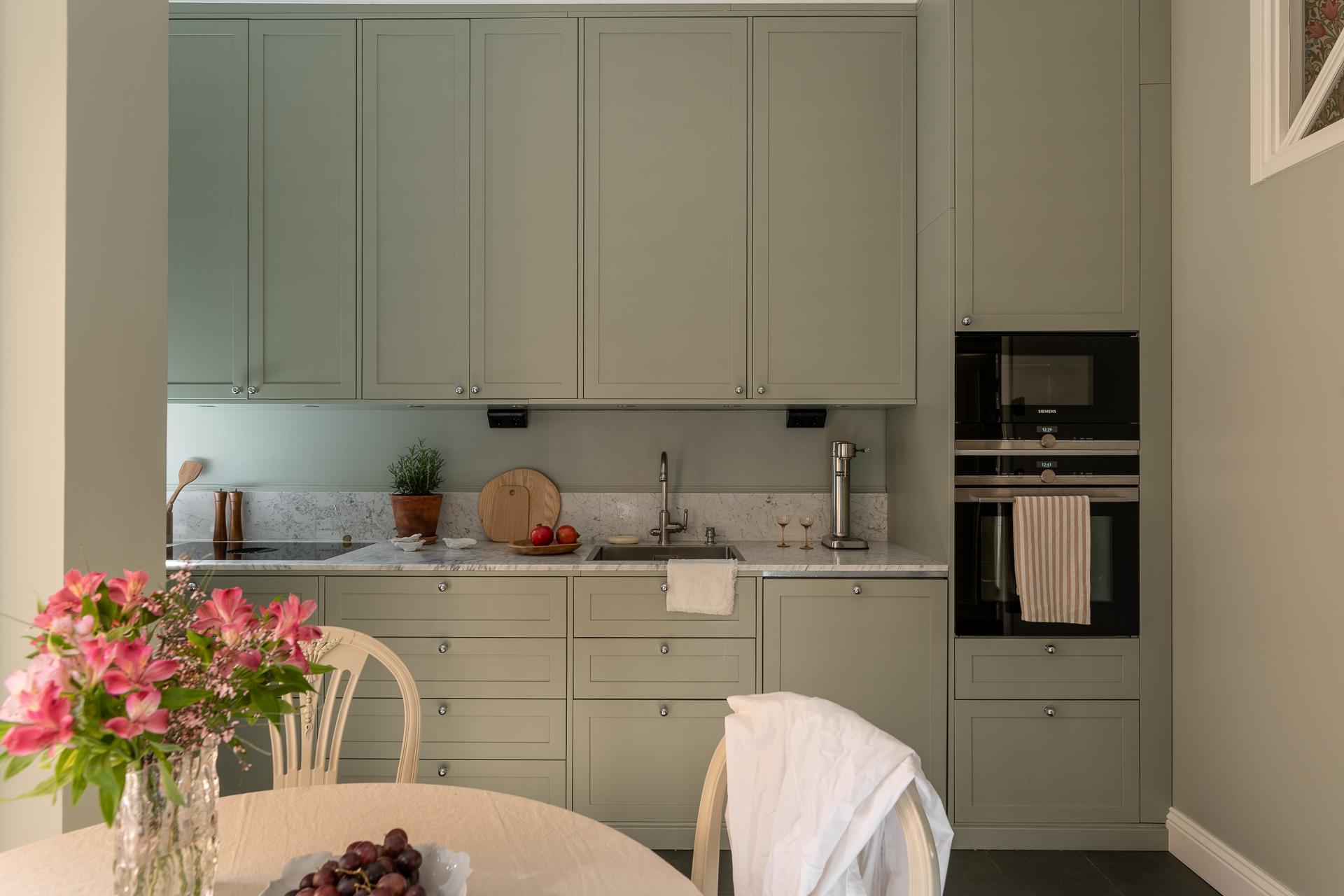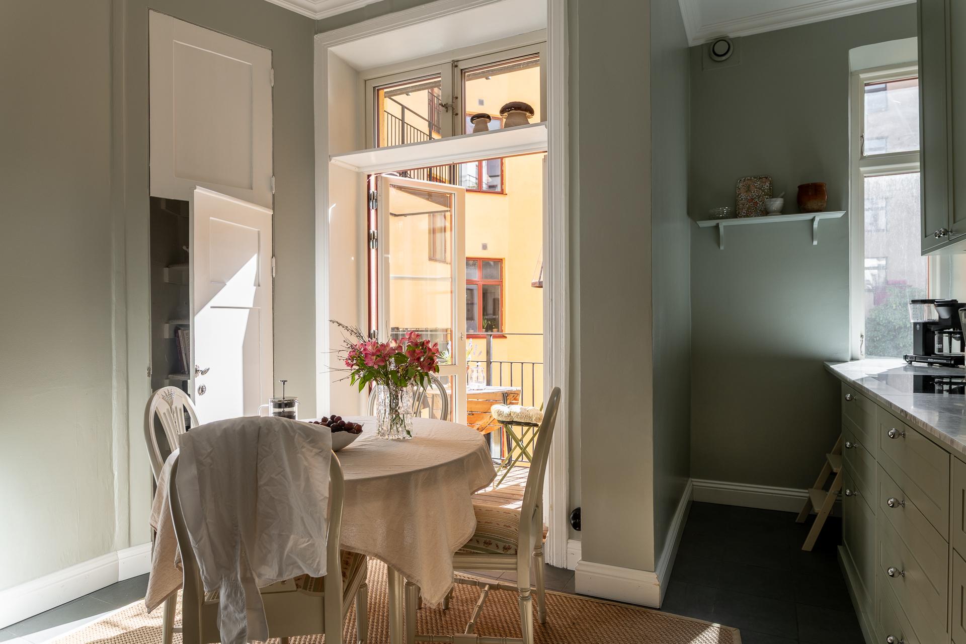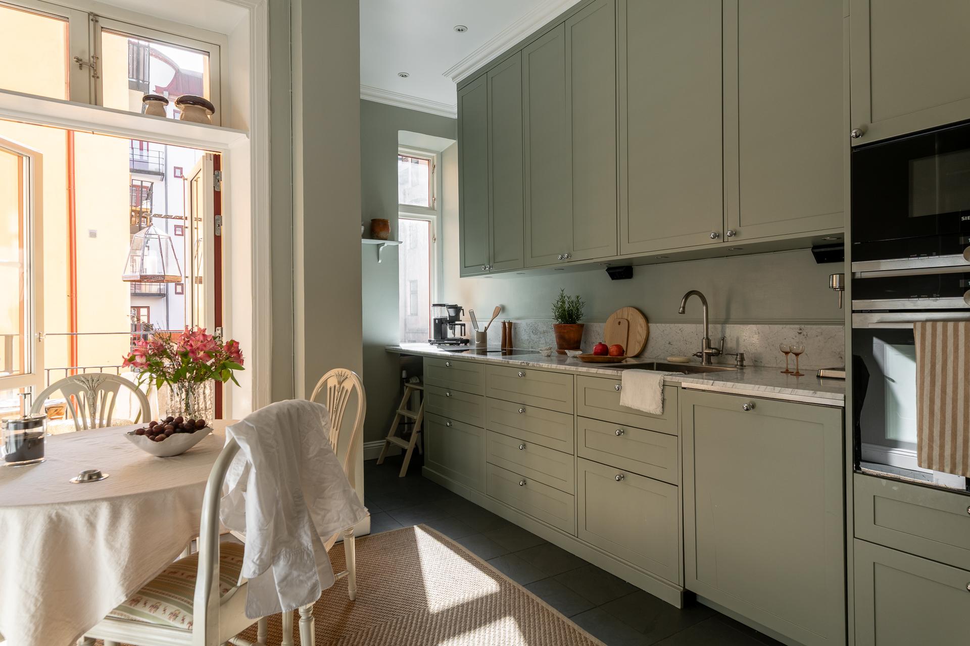 Ett kök så som det är när det är som bäst. Klassiskt vänd mot innergården och av högsta karat. Renoverat i shakerstil med Ikea-stommar och profilerade, specialbeställda luckor från Urbanfront. Skåpen går hela vägen upp och skapar fantastisk förvaring. Bänkskivan i carraramarmor är av högsta snitt och skapar stort ha-begär. Separat kyl och frys, diskmaskin och check även på induktionshäll från Bora med integrerad fläkt. Inbyggd ugn och mikro från Siemens. Naturstensklinker med underliggande golvvärme. Intill fönstret rymmer ni ett matbord med plats för hela familjen. Här sveper södersolen in och vittnar om den annalkande våren som är på ingång. Från köket når ni balkongen som är vänd mot föreningens innergård.