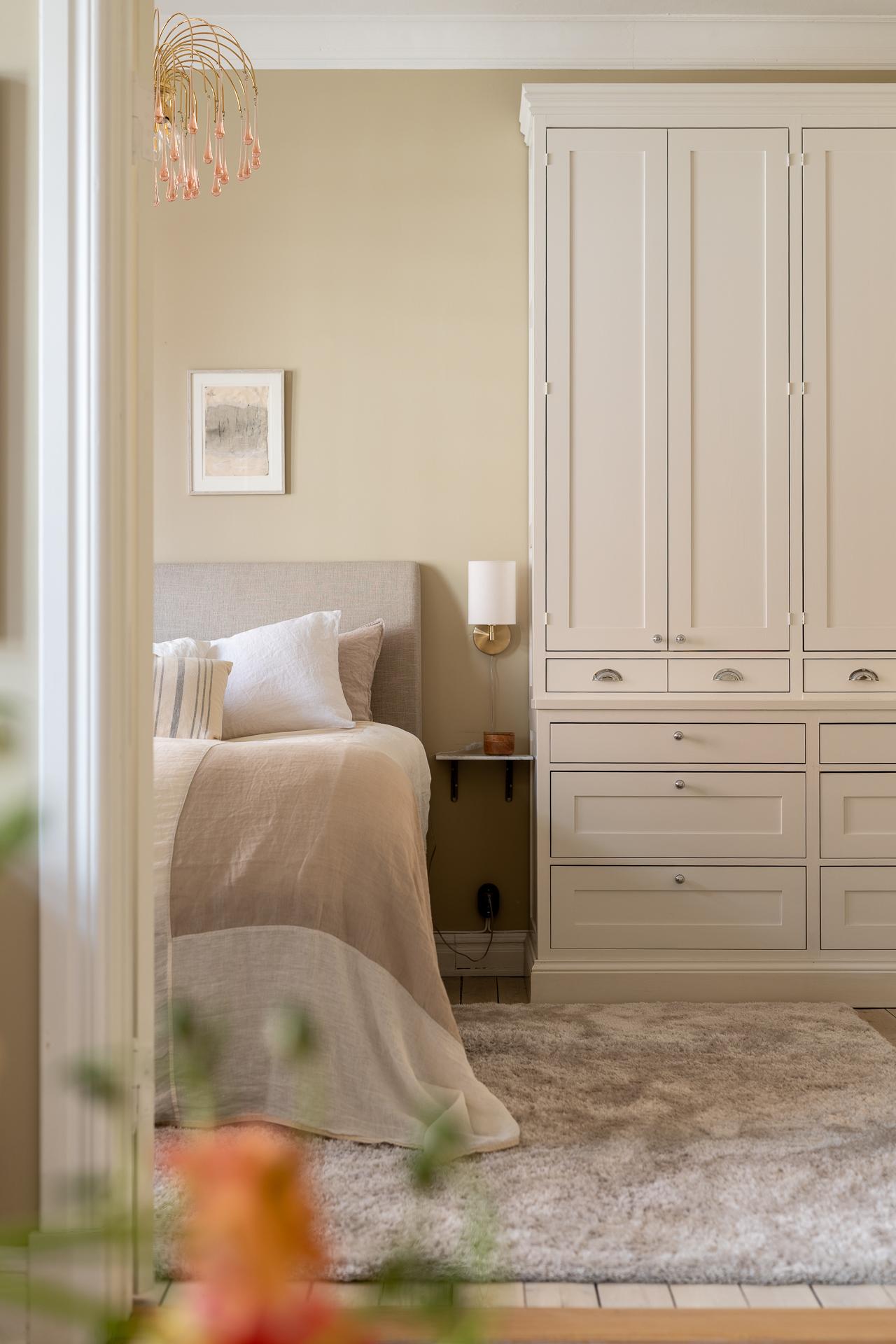 En tidigare stängd yta öppnades och möjliggjorde på så vis en ingång till sovrum från vardagsrummet. I passagen så finns platsbyggd förvaring i en stil som livar med husets historia och karaktär.