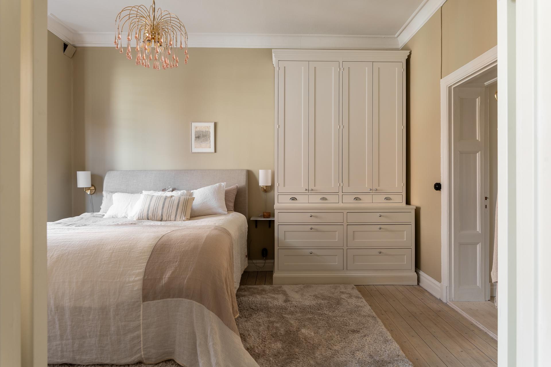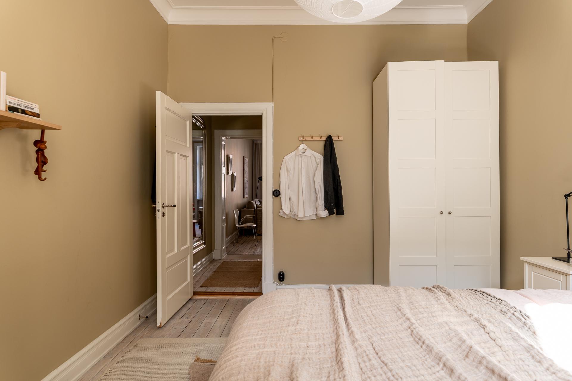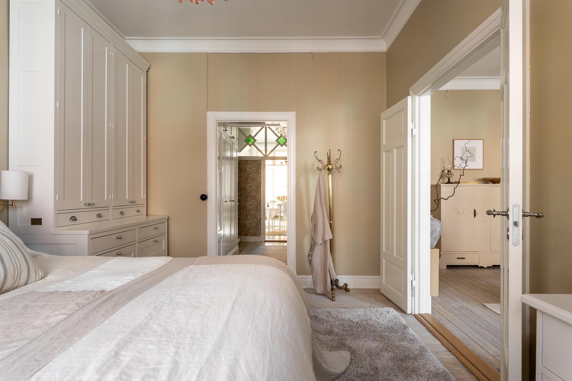 Rummet är ståtligt och välplanerat och i ena hörnet står en stolt förvaringsmöbel som en finsnickare låtit bygga. Utöver det finns plats för en dubbelsäng, nattduksbord samt ytterligare byrå, garderob eller ett skrivbord för den som önskar. Förutom hallen så kommer ni också vidare till vardagsrummet genom pardörrar i spegelutförande.