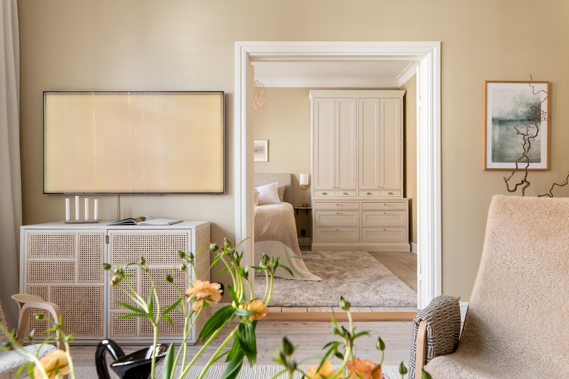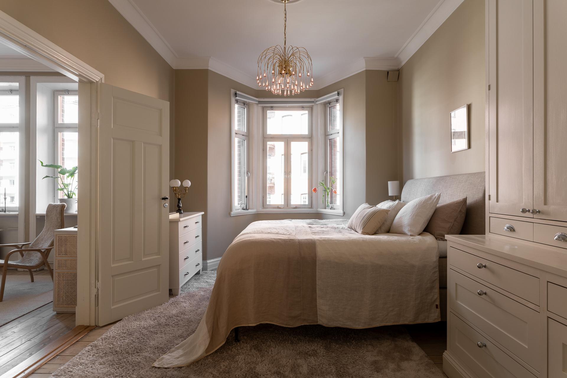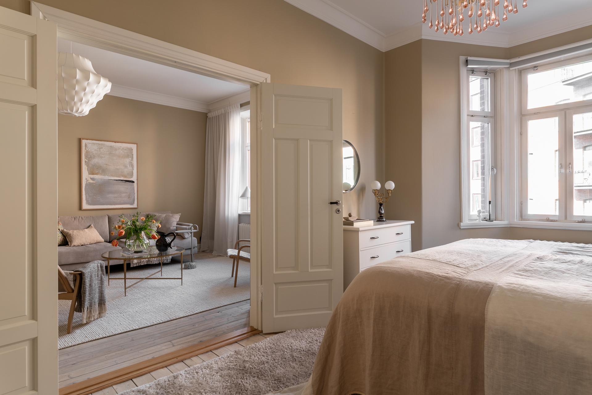 Rummet är ståtligt och välplanerat och i ena hörnet står en stolt förvaringsmöbel som en finsnickare låtit bygga. Utöver det finns plats för en dubbelsäng, nattduksbord samt ytterligare byrå, garderob eller ett skrivbord för den som önskar. Förutom hallen så kommer ni också vidare till vardagsrummet genom pardörrar i spegelutförande.