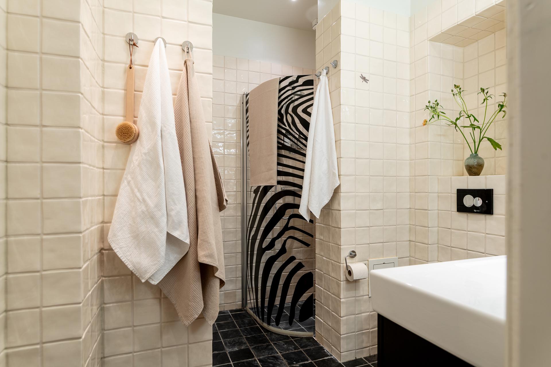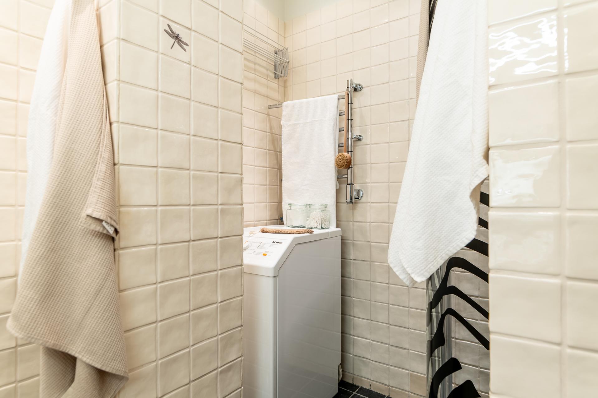 Helkaklat badrum med golvvärme och handdukstork. Tvättmaskinen underlättar i vardagsbestyren.