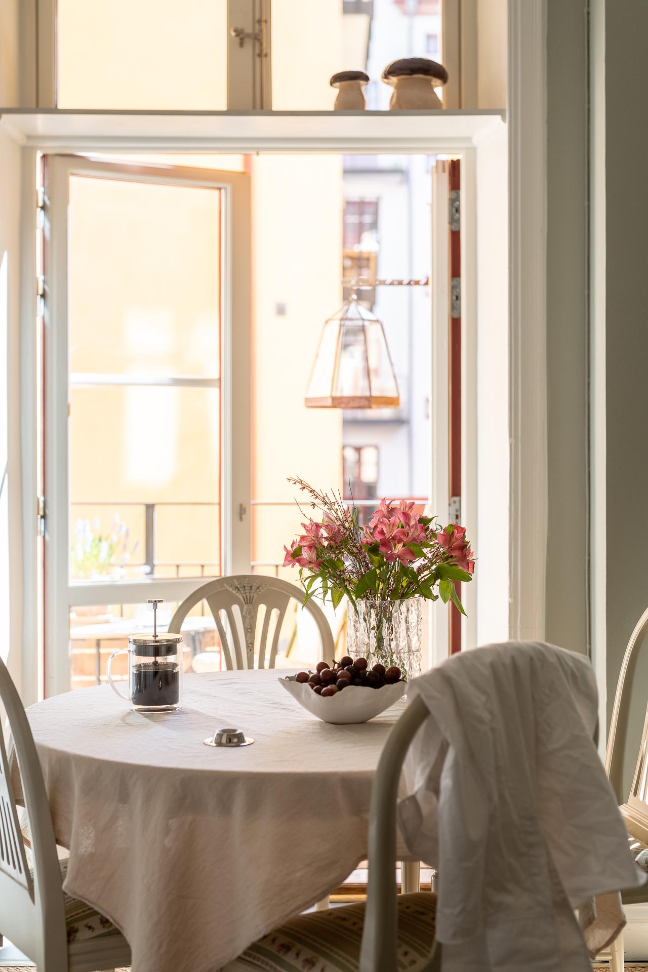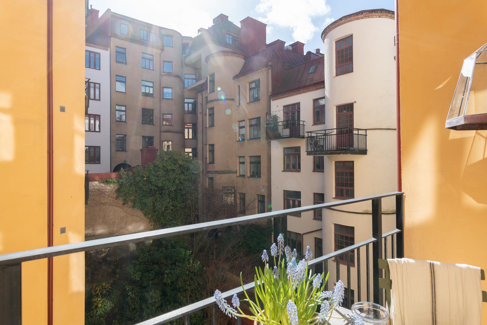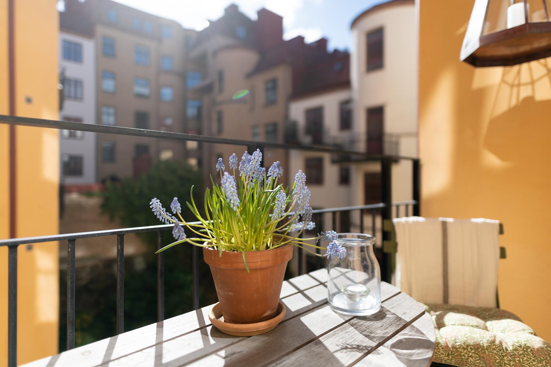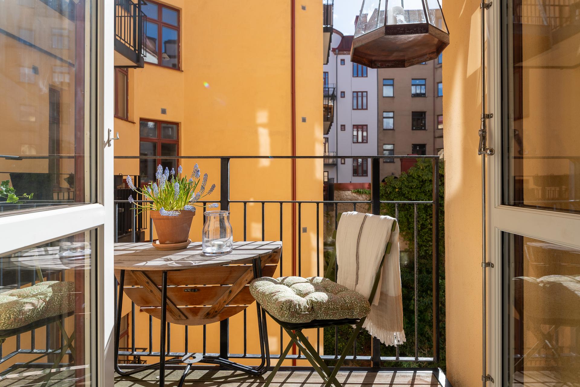 I bästa söderläge och i knäpptyst gårdsläge ligger balkong. En naturlig förlängning av bostaden och den används som ett extrarum från tidig vår till sent in på hösten. Frukostfrallan och espresson trivs lika bra som ett glas rött, men solläget gör det också tacksamt för hushållets kryddor och örter att odlas här.
