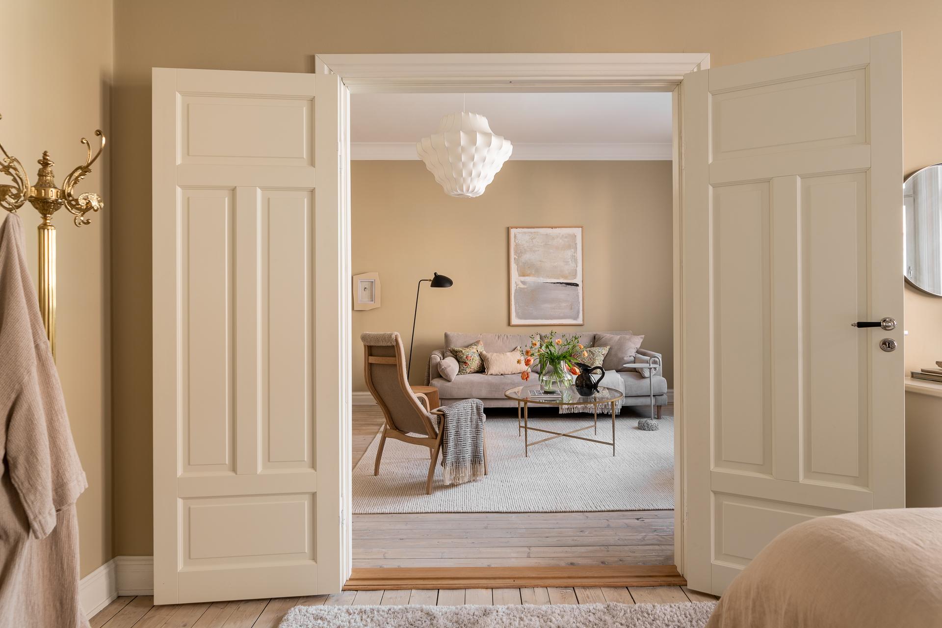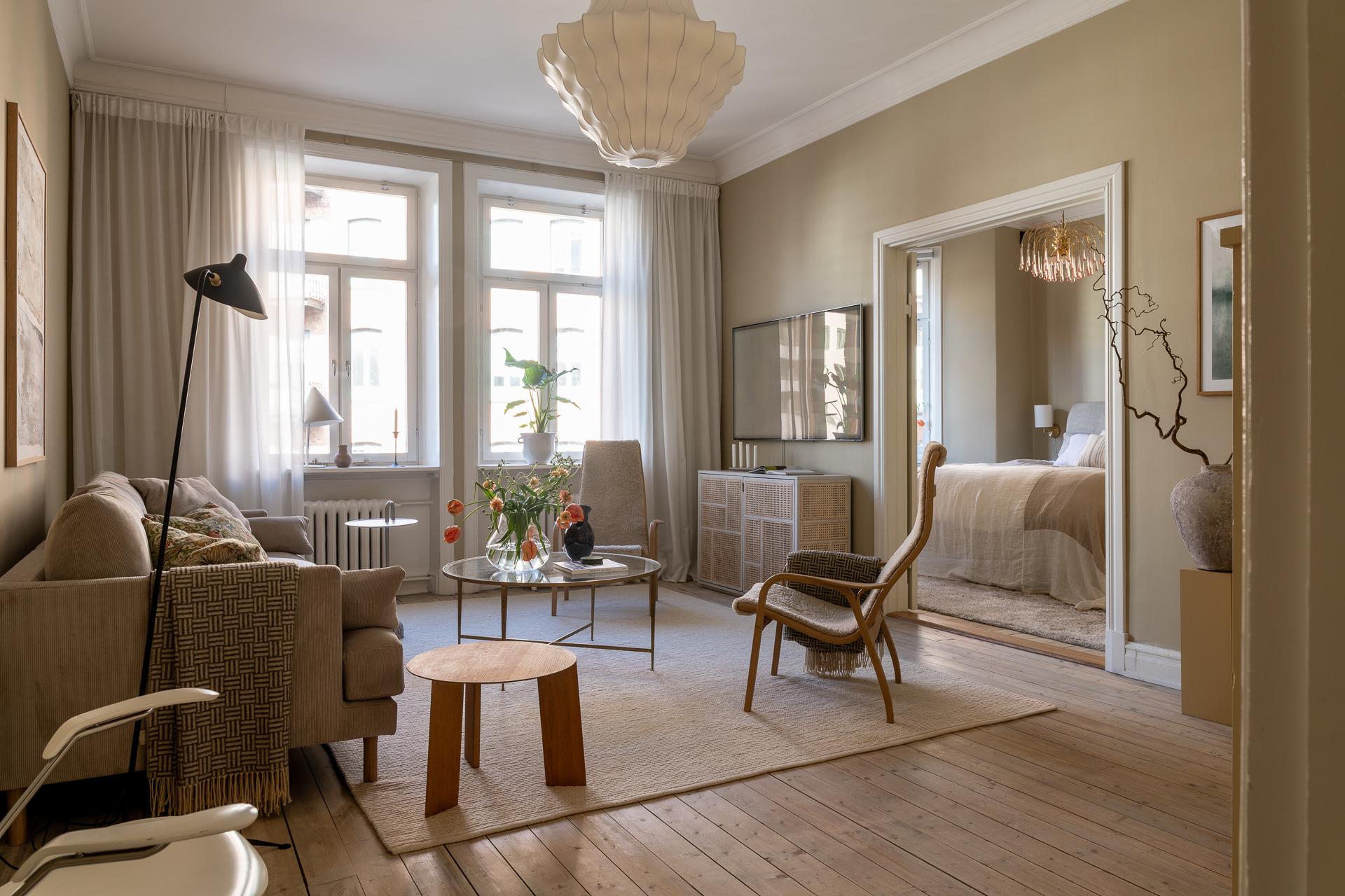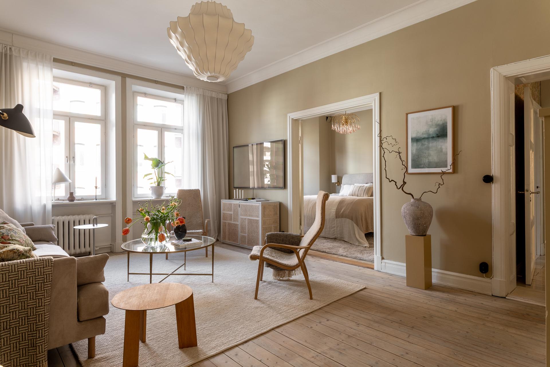 Tillbaka till lägenheten, här har hänt en hel del de senaste åren och lägenheten kan nu stoltsera med att vara sitt allra bästa jag. För den som har renoverat förr så vet ni hur många timmar och beslut som ligger bakom, utöver timmarna som rullar på när skickliga hantverkare är inblandade. Med stort fokus på kvalité och estetik tog nuvarande ägare sig an en mer eller mindre totalrenoveringen av hela våningen under 2023.