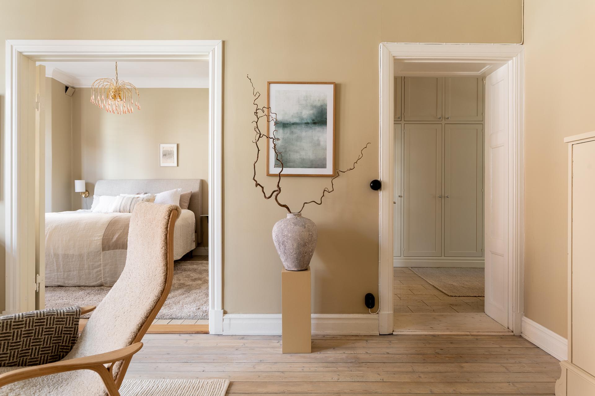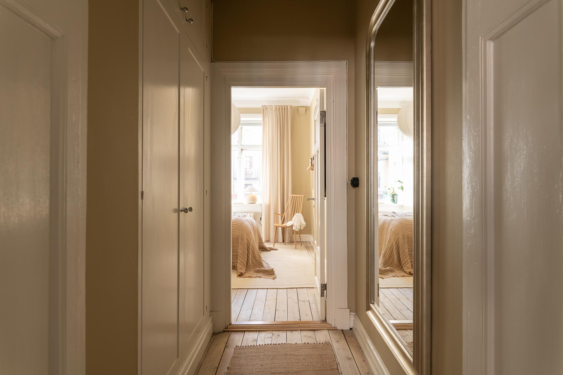 Från hallen finns många vägar att gå, men vår rundvandring fortsätter in i ett av de två rymliga sovrummen.