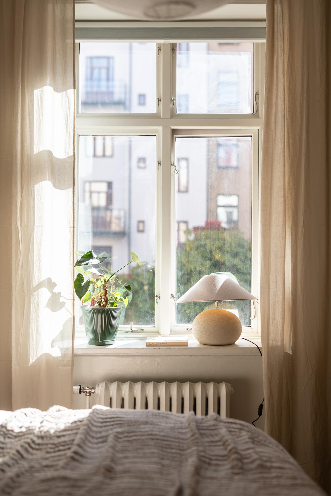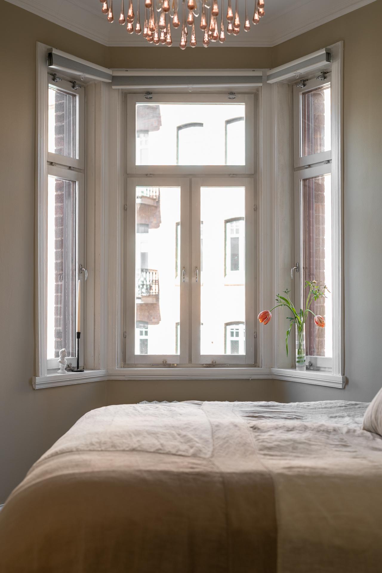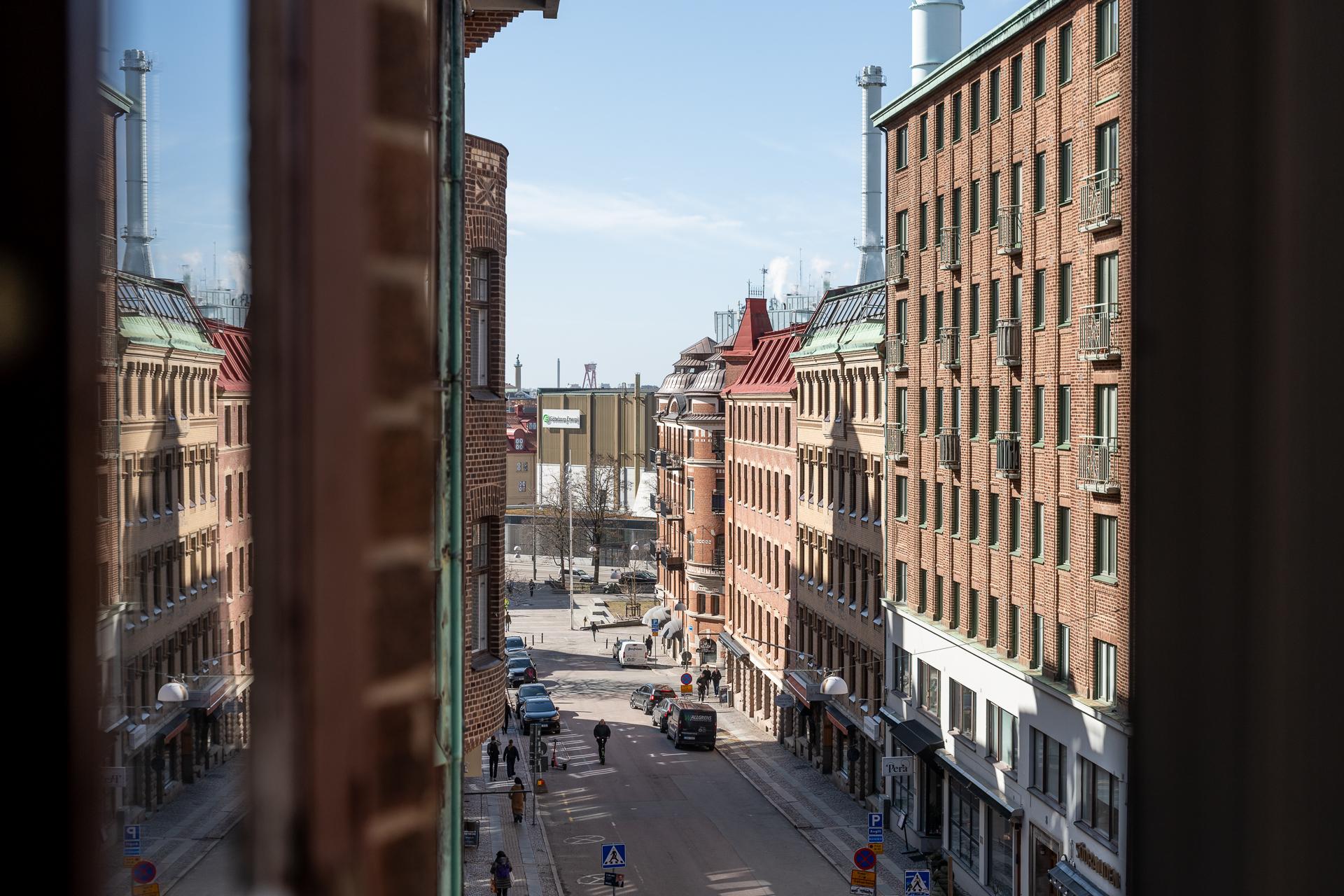 Blicken vandrar genast fram till fönstret och det fantastiska burspråket. Tack vare dess utformning har ni ljus och en härlig vy från hela tre håll. Härifrån ser ni hela vägen bort till Sjömanshustrun i Majorna.