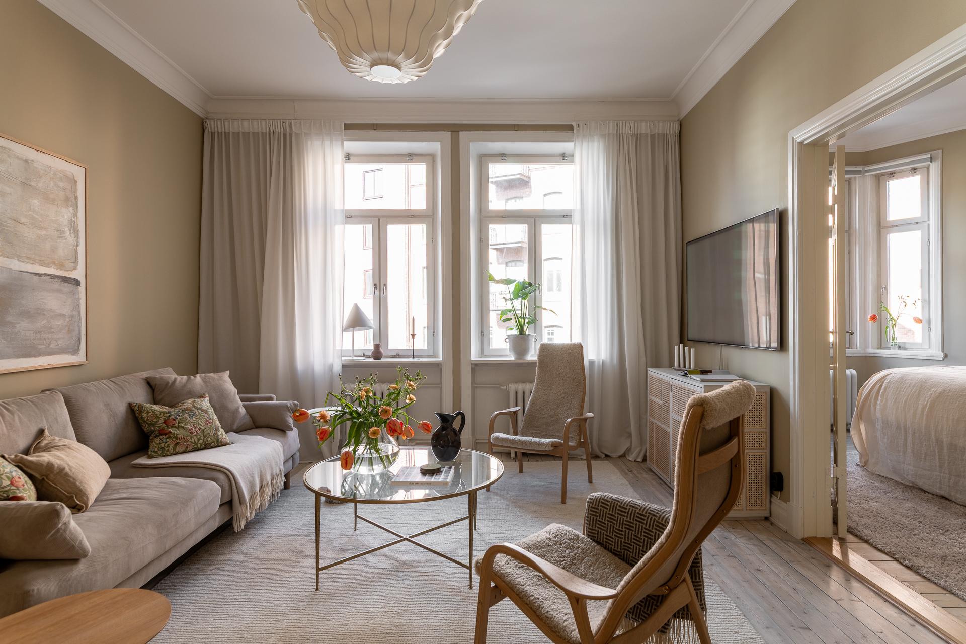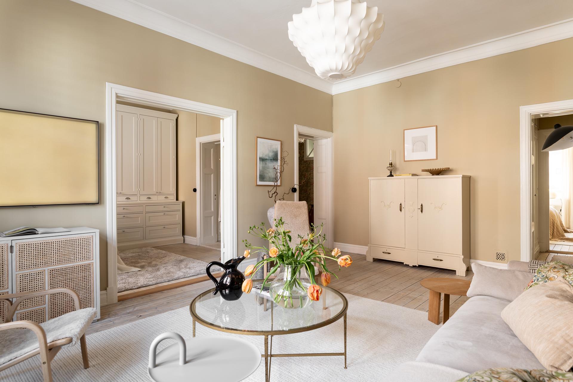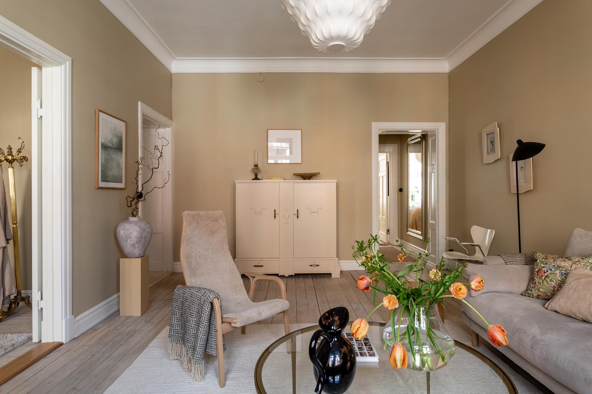 Den goa känslan följer med in i vardagsrummet och är ständigt närvarande. Det klanderfria skicket talar för sig självt - släta fina väggar med en ljuvlig kulör som får både stuckaturer, foder och listverk att poppa så som de förtjänar. Två stora fönster med överljus släpper in en naturligt, skönt dagsljus. Rummets generösa storlek gör det möjligt att möblera på flera sätt och rummet tål både större soffgrupper, fåtöljer och tv-hörna - möjligheterna är många.