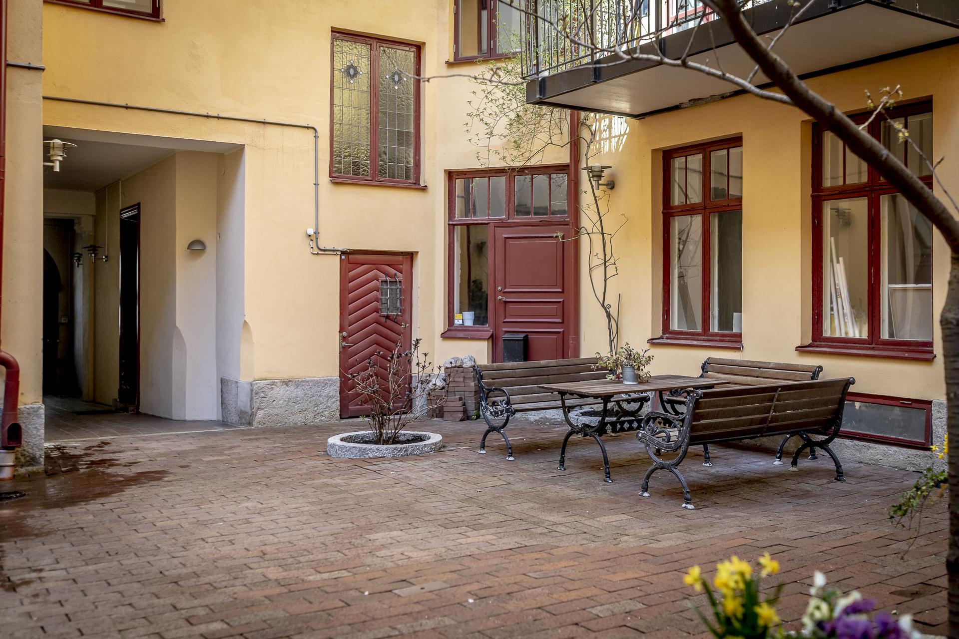 Innanför porten döljs en vackert stenlagd och härligt grön innergård med kontinental atmosfär. Sommartid finns här sittmöbler och cyklar parkeras under tak på gården. Från gårdsingången nås tvättstugan och även Zekes. Högst upp i gårdsuppgången finns den fina takterrassen som är möblerad med möbler, grill och solstolar. En underbar plats att samlas på ett gäng en varm sommardag. Förutom solläget imponerar även utsikten över hamninloppet. Föreningen anordnar tre gårdsträffar årligen då de bl.a städar i ordning och plockar fram utemöbler. På julträffen kläs granen och man serverar pepparkakor och glögg.