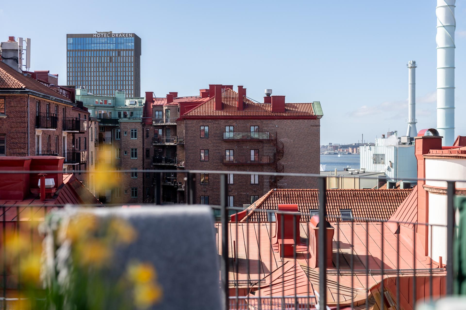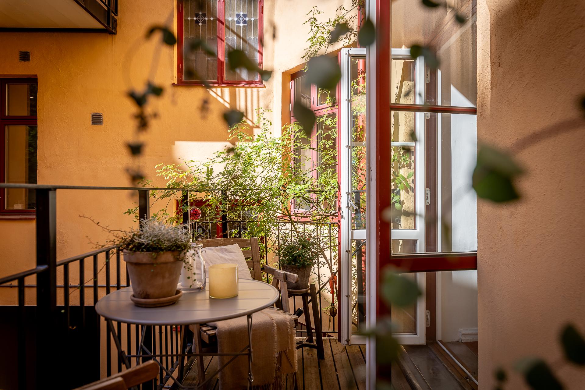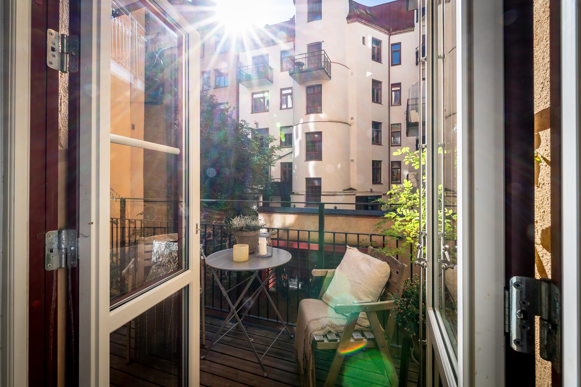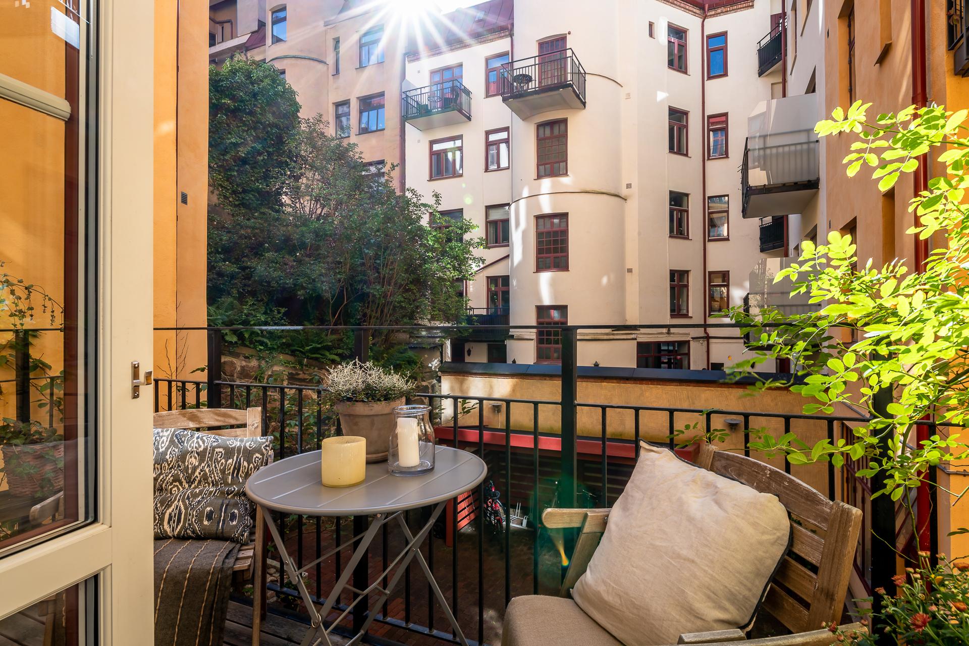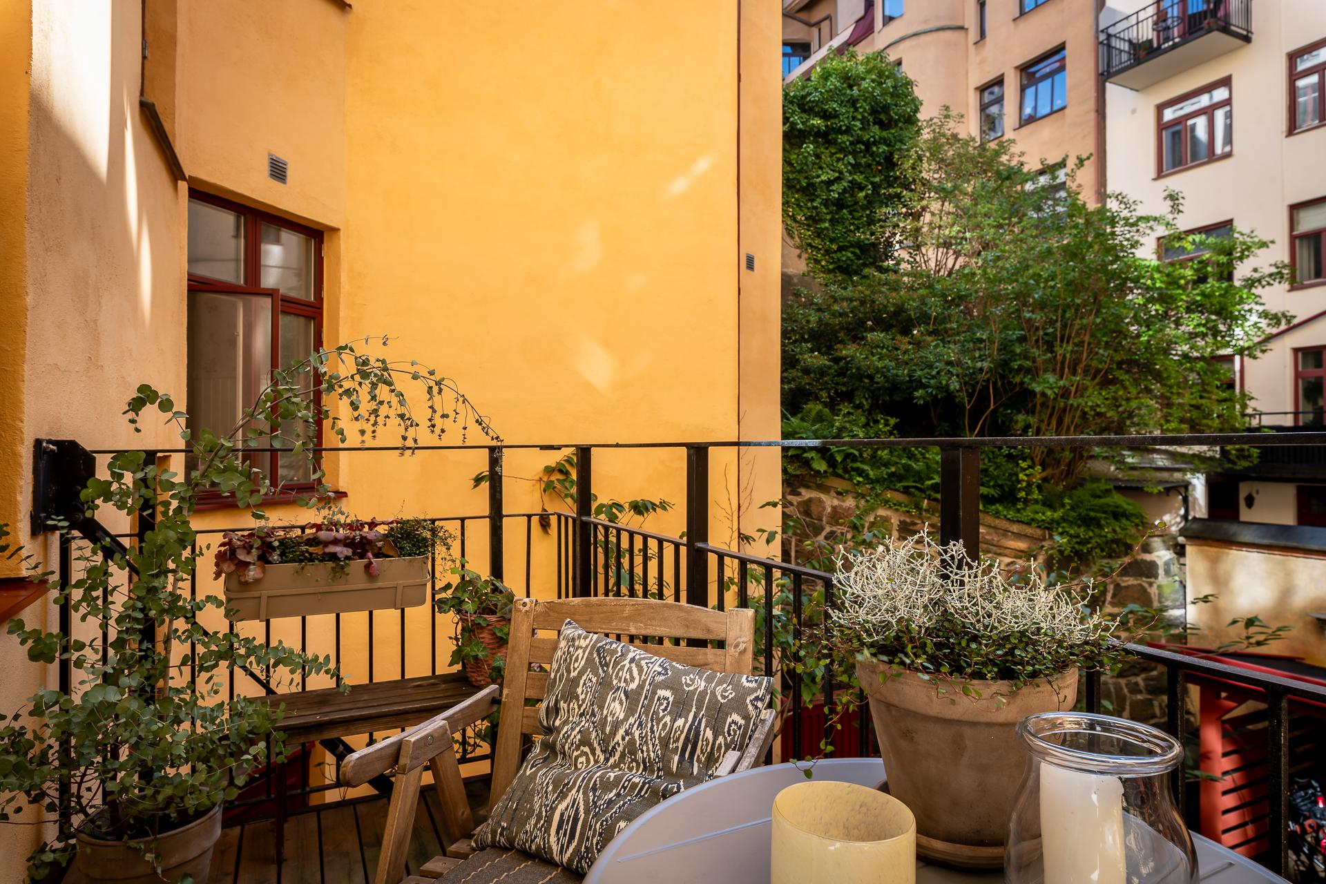 Balkongen imponerar och blir tack vare sin storlek det där extra rummet man suktar efter under vår- och sommarmånaderna. Västerläget ger härlig eftermiddagssol och lugnet och tystnaden här är total. Här kan ni sitta närmaste familj eller vänner och njuta av ett glas i solgasset medan de vackra fasaderna från förra sekelskiftet gör er sällskap. Vill ni vidare ut sen så är det inte många steg från porten. Här får ni också plats med med odling av både blommor och örter, vilka trivs fint i solen.