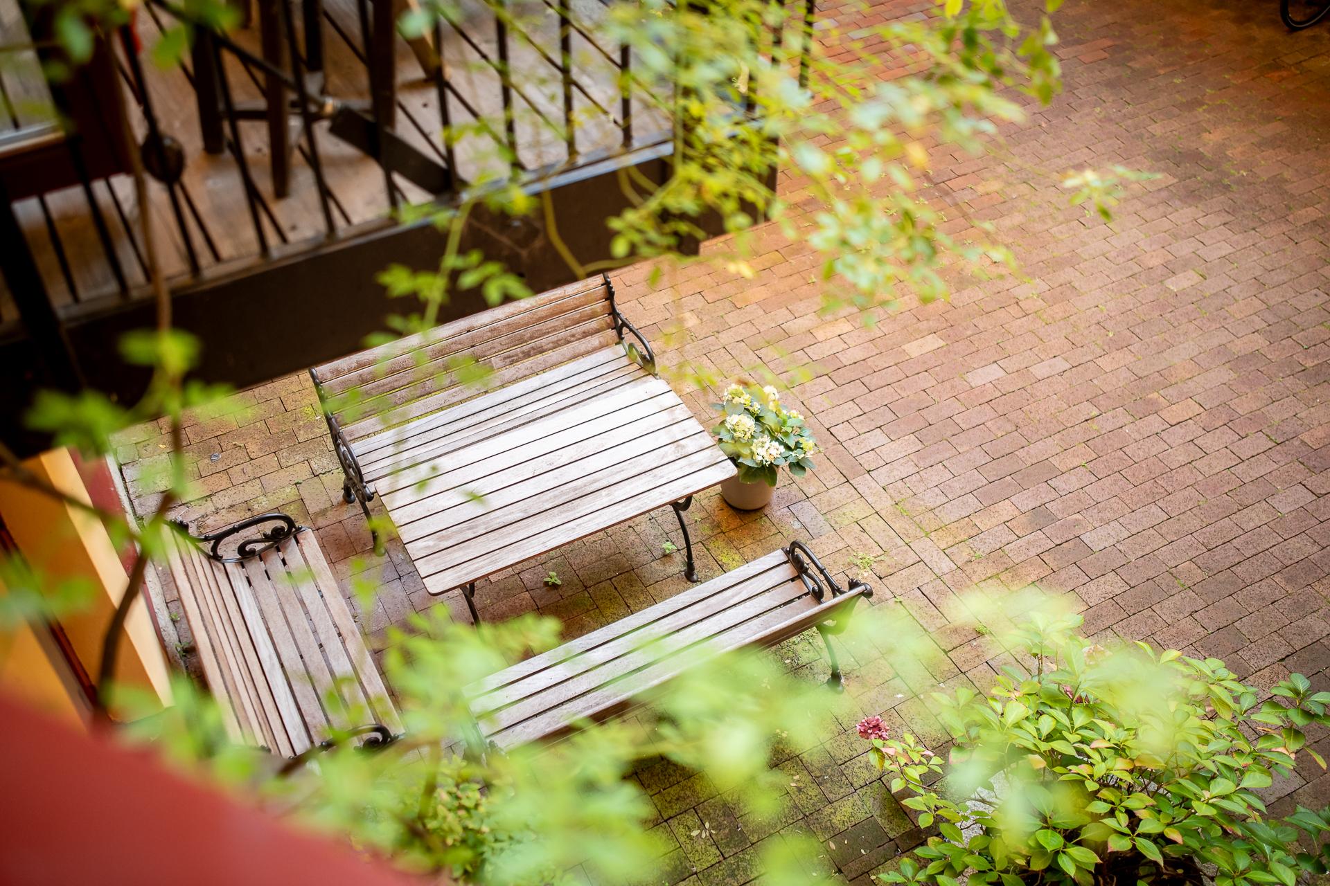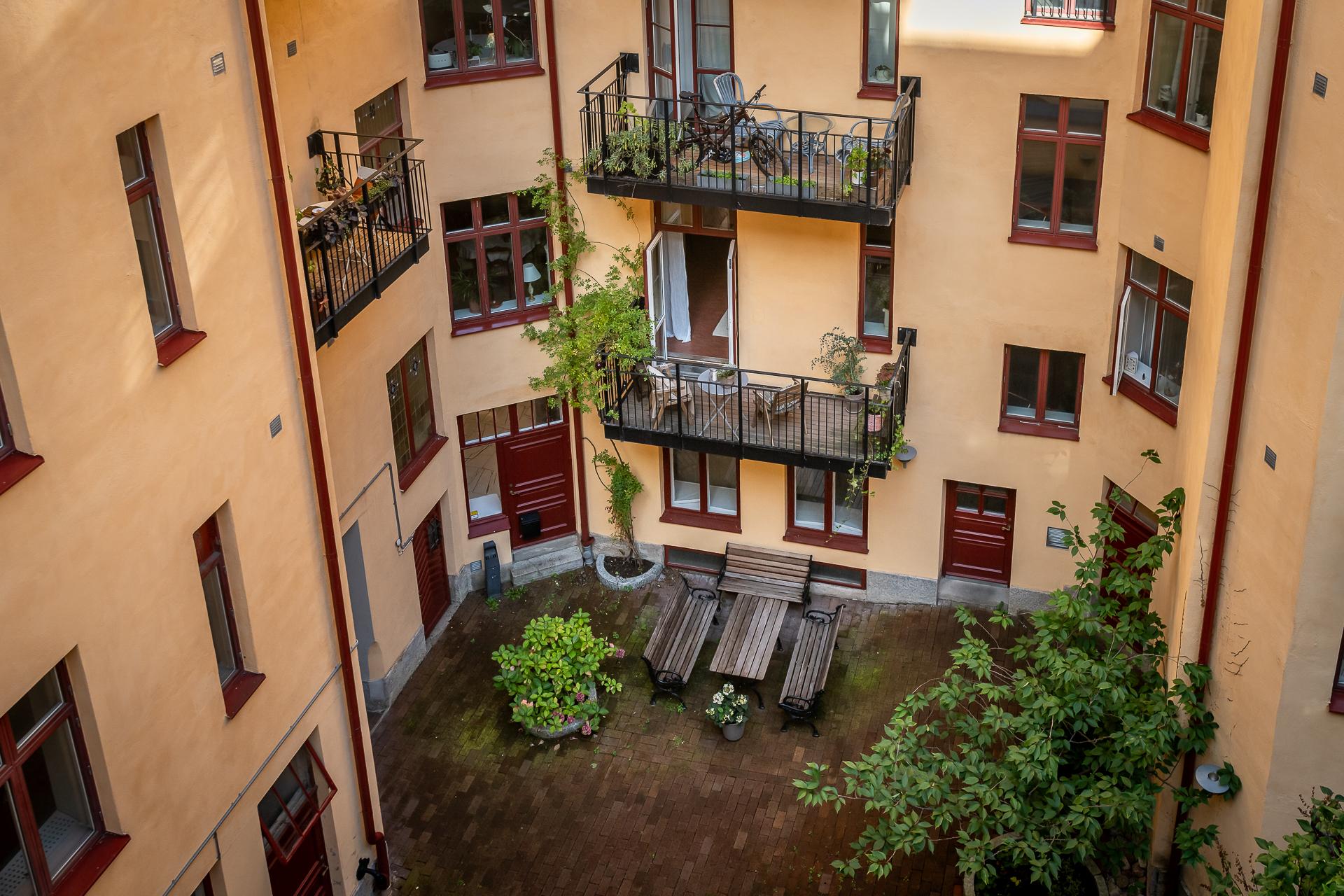 Innanför porten döljs en vackert stenlagd och härligt grön innergård med kontinental atmosfär. Sommartid finns här sittmöbler och cyklar parkeras under tak på gården. Från gårdsingången nås tvättstugan och även Zekes. Högst upp i gårdsuppgången finns den fina takterrassen som är möblerad med möbler, grill och solstolar. En underbar plats att samlas på ett gäng en varm sommardag. Förutom solläget imponerar även utsikten över hamninloppet. Föreningen anordnar tre gårdsträffar årligen då de bl.a städar i ordning och plockar fram utemöbler. På julträffen kläs granen och man serverar pepparkakor och glögg.