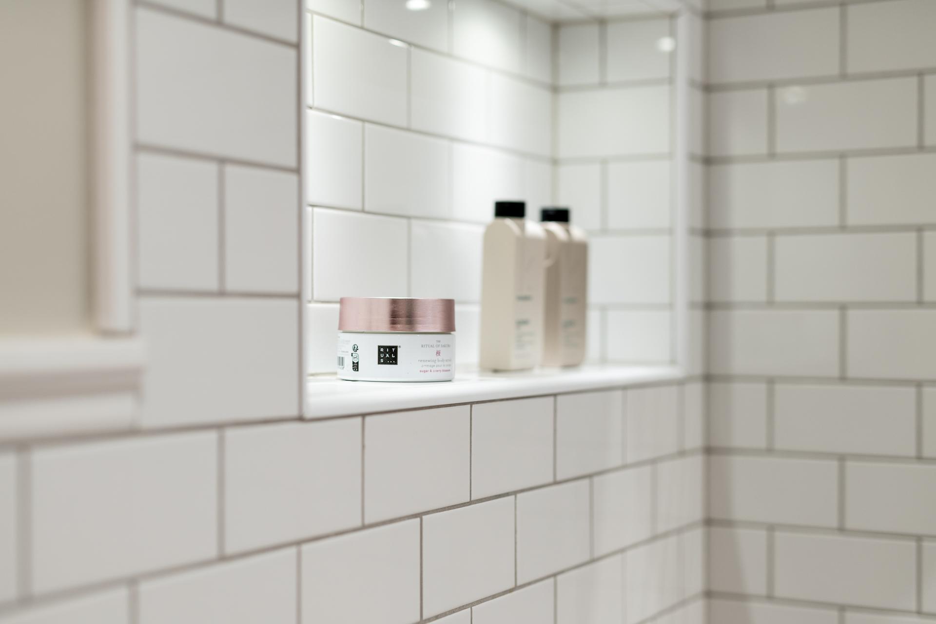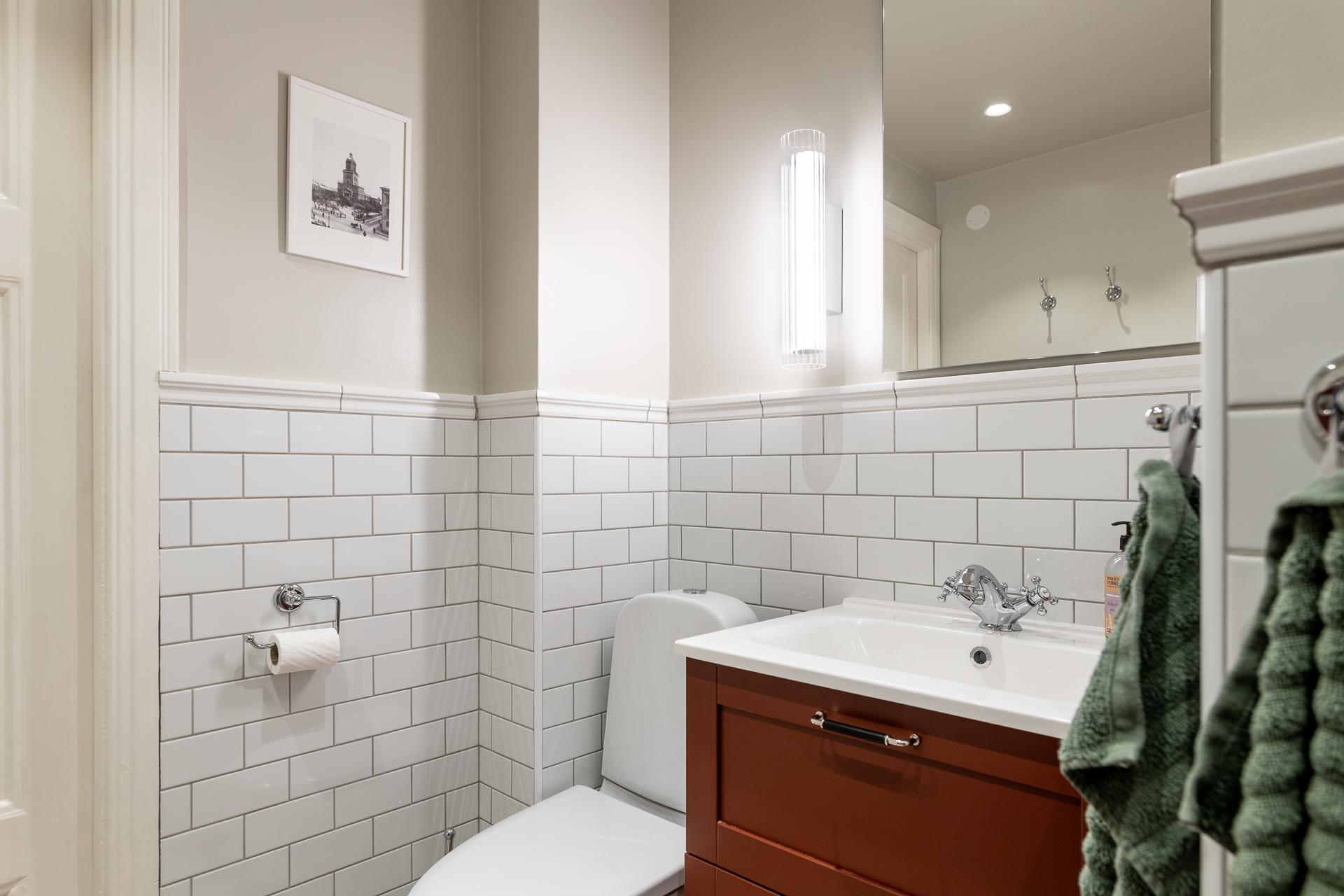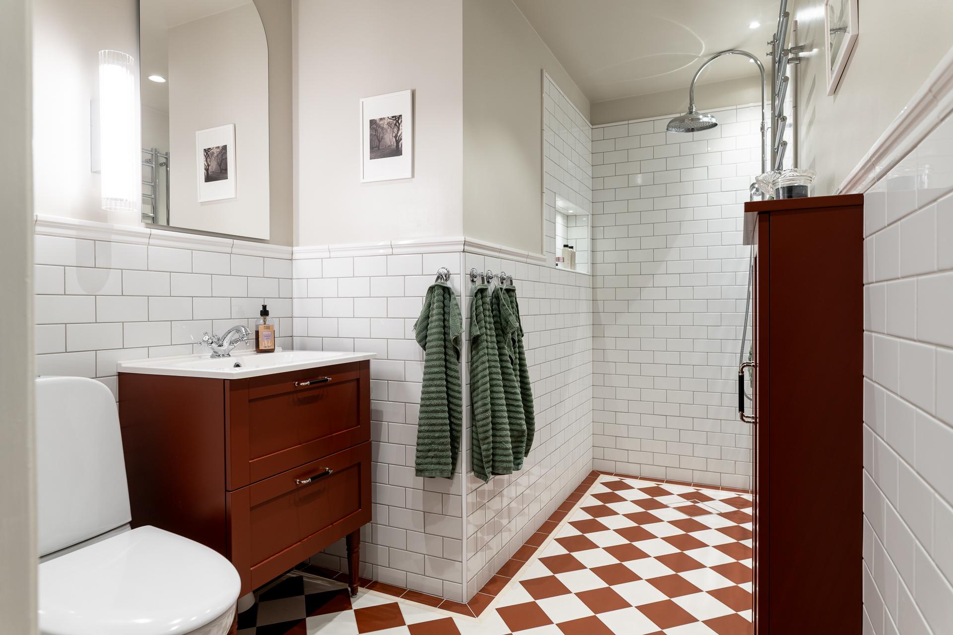 Från hallen når ni badrummet som totalrenoverades så sent som 2025 - skicket här är oantastligt. Smakfullt gjort med stort respekt för husets historia livar det väl med känslan i lägenheten i övrigt. Klinker på golvet med underliggande golvvärme, handdukstork och en fin kommod och förvaringsskåp från välrenommerade Vedum. Vitkaklade väggar i halvförband med en fris upptill där släta väggar tar vid, mycket smäckert. Duschmunstycket andas också byggvård precis som badrummet i sin helhet.