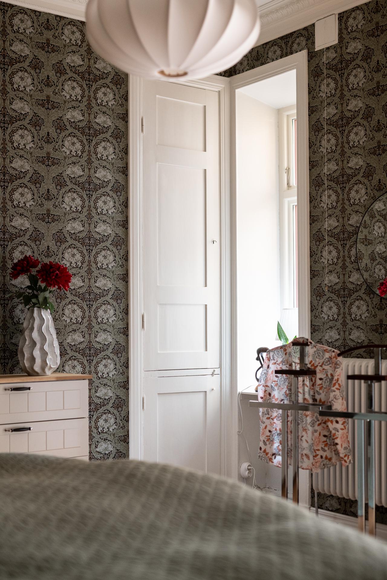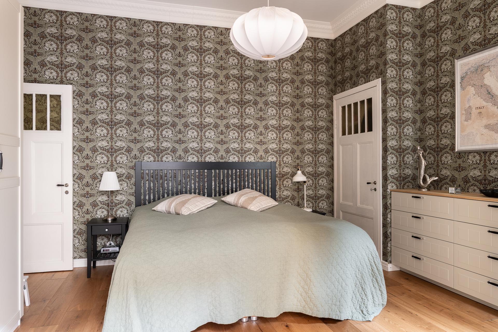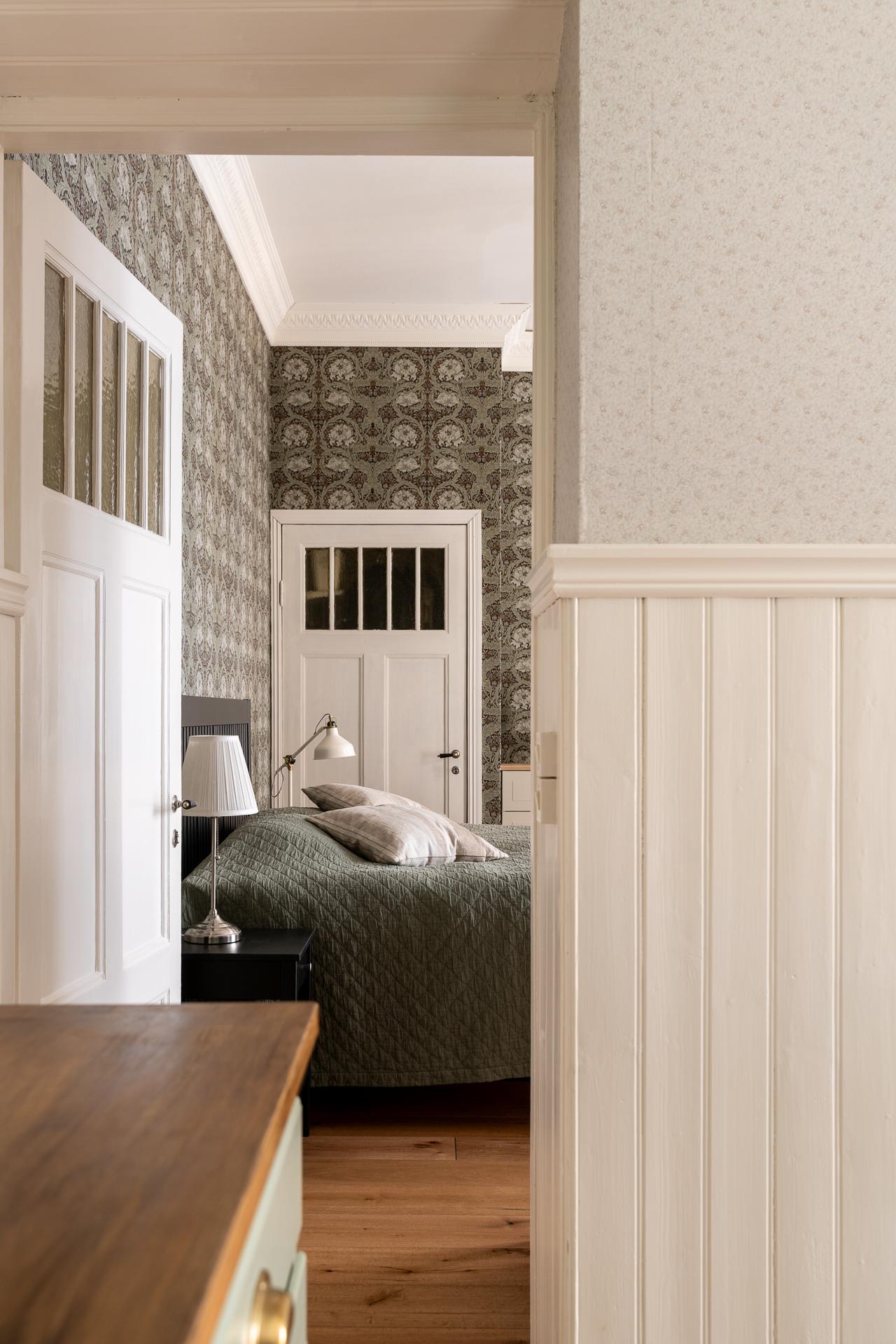 I fil med vardagsrummet ligger det ena av bostadens två sovrum. Den fina känslan från vardagsrummet följer gärna med in och tidstypiska attribut smyckar även detta rum. Stort nog för att få in dubbelsäng, garderober och skrivbord för den som önskar. Idag når man sovrummet från både vardagsrum och hall vilket bidrar till den goa känslan med rundgående planlösning. En klassisk tapet smyckar även väggarna i detta rum.