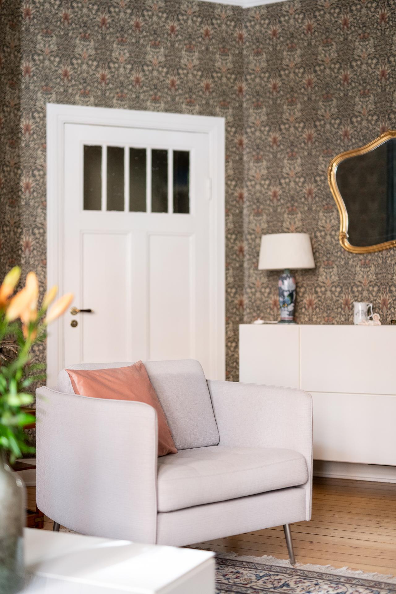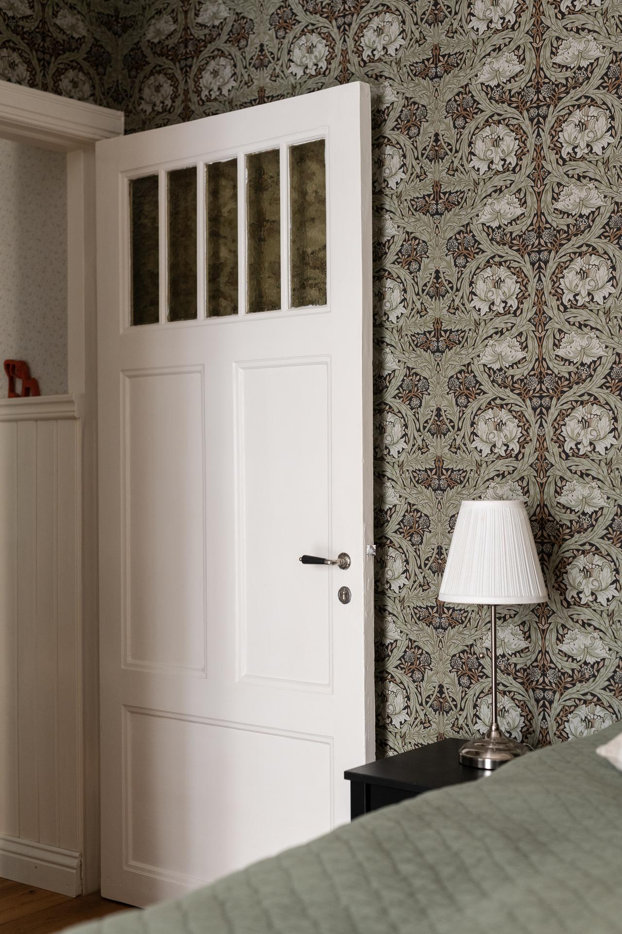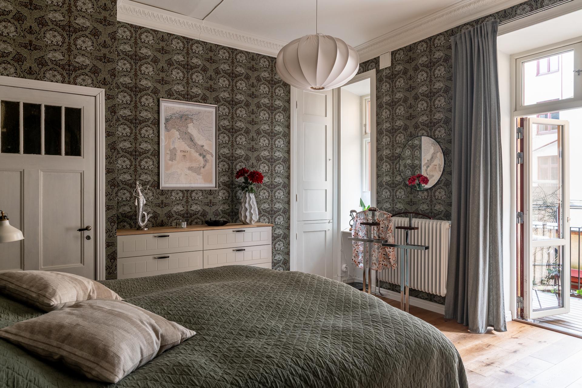 I fil med vardagsrummet ligger det ena av bostadens två sovrum. Den fina känslan från vardagsrummet följer gärna med in och tidstypiska attribut smyckar även detta rum. Stort nog för att få in dubbelsäng, garderober och skrivbord för den som önskar. Idag når man sovrummet från både vardagsrum och hall vilket bidrar till den goa känslan med rundgående planlösning. En klassisk tapet smyckar även väggarna i detta rum.