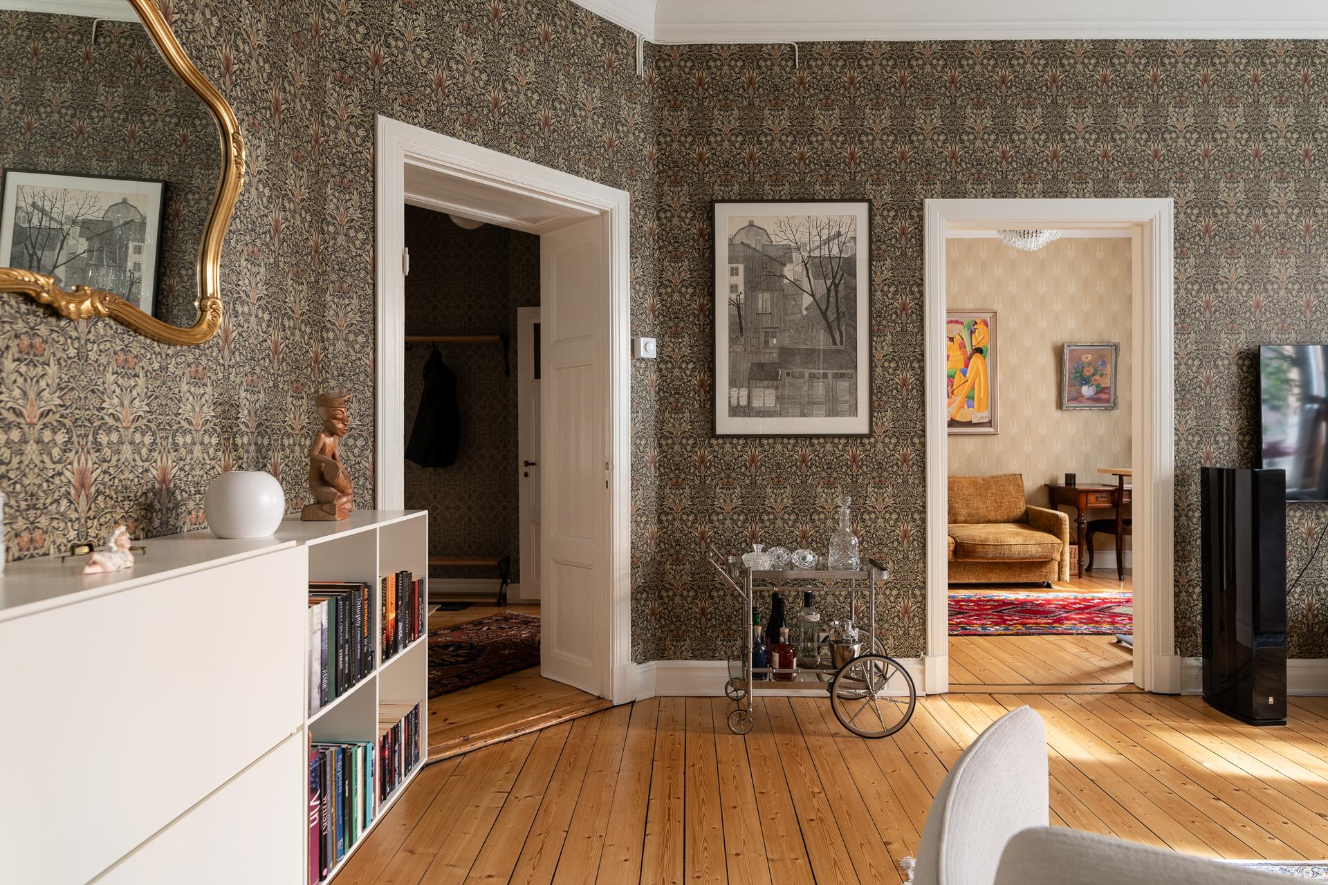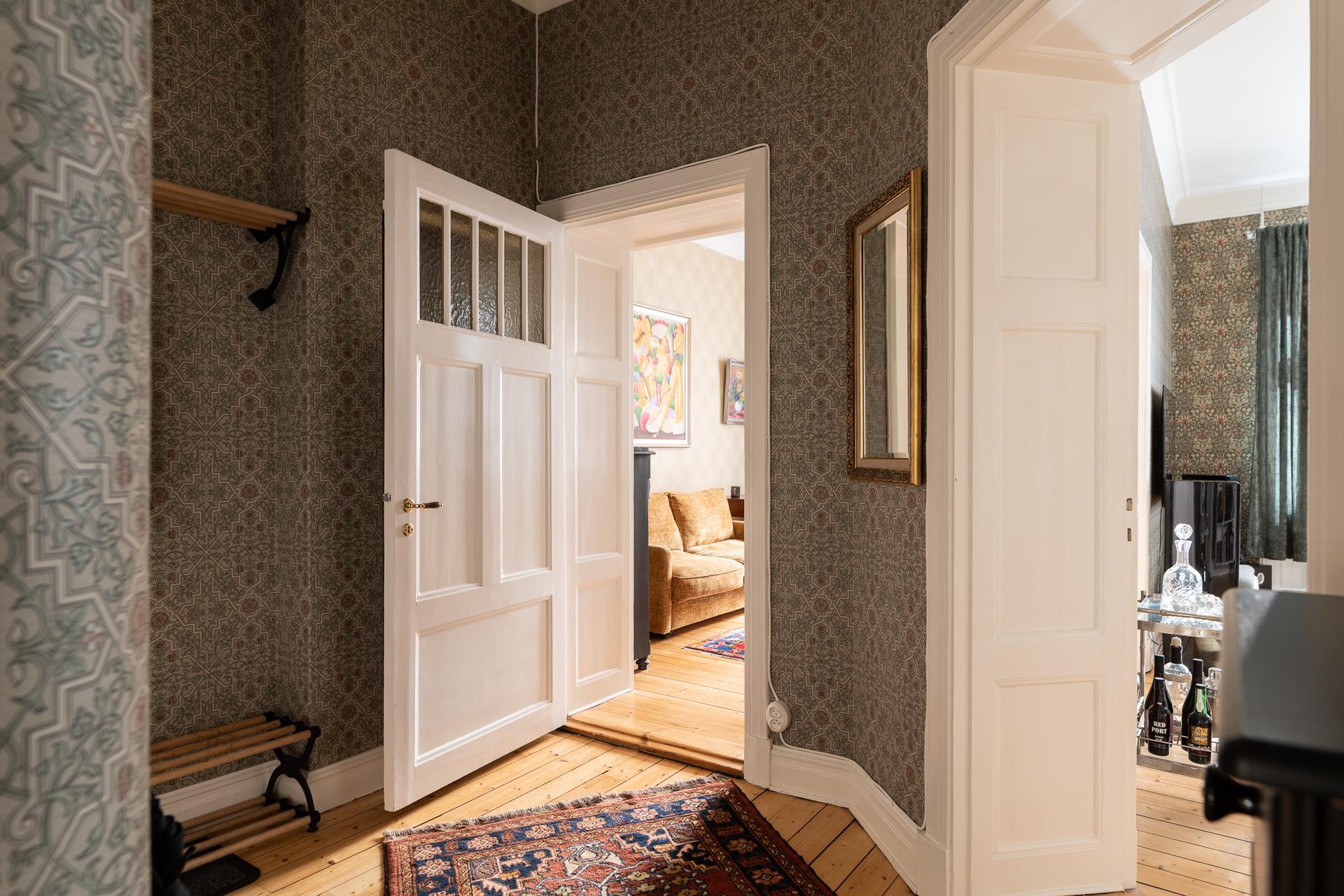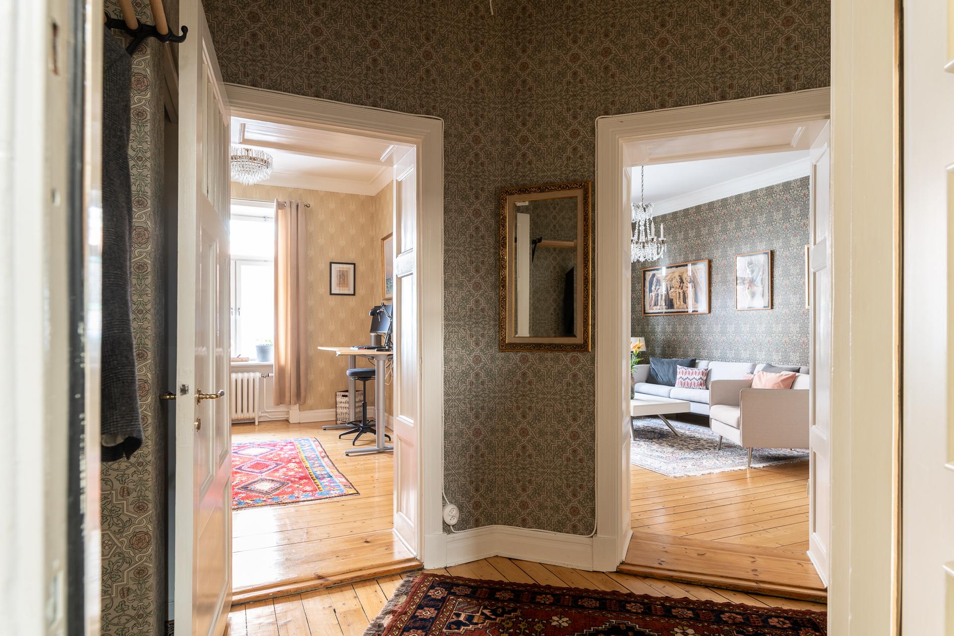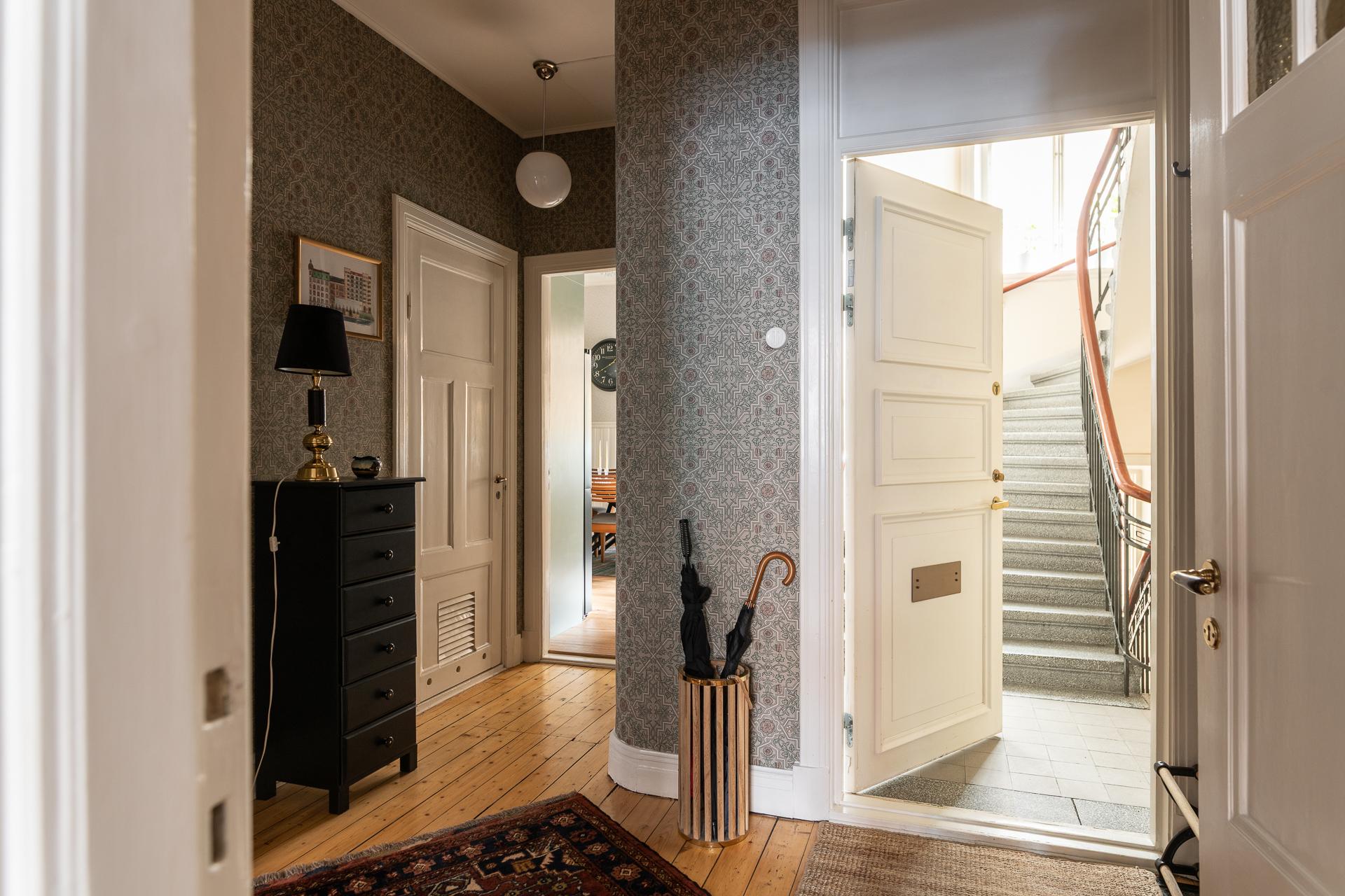 Genom den vackra ytterporten kliver ni in och möts av en omedelbar tystnad och ett sällsynt lugn. Trapphuset är rymligt och leder er en rejäl trappa upp till bostaden, eller så tar ni hissen ifall ni kommer med tunga matkassar. Hallens oregelbundna form tillsammans med vyn mot de två rummen i fil ger en välkomnande känsla. Här finns plats för familjens kappor, skor och väskor och hallen leder er vidare till de två rummen i fil mot Kungsgatan, badrummet och köket. Önskar man så går det att stänga igen mot sovrummet och platsbygga en bokhylla eller en garderob vilket andra lägenheter i huset har gjort. Tapeten (2025) från Engelska tapetmagasinet gör ett starkt första intryck och väcker en nyfikenhet att se mer. Taket målades 2025 och samtidigt sattes en ny stuckatur in.