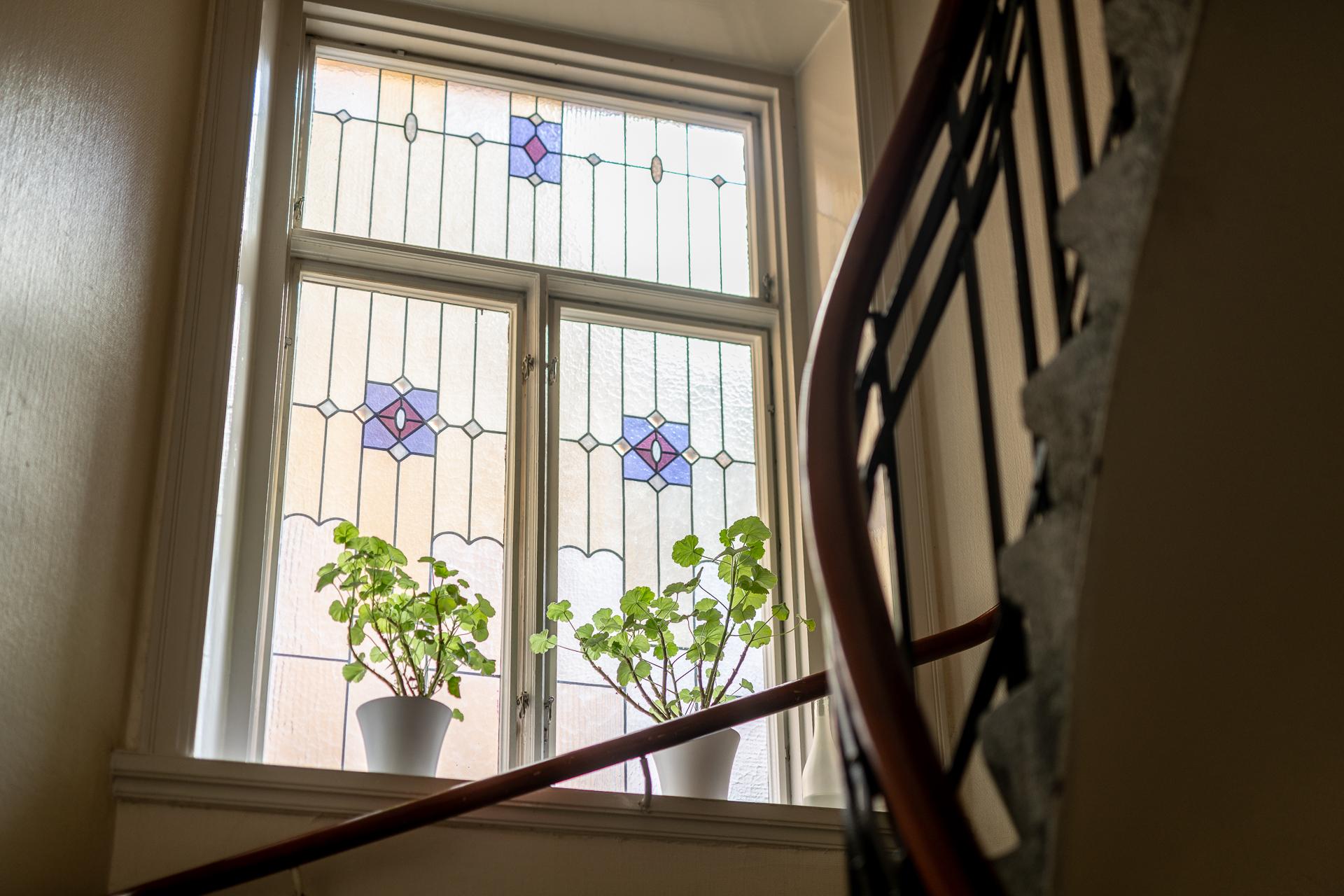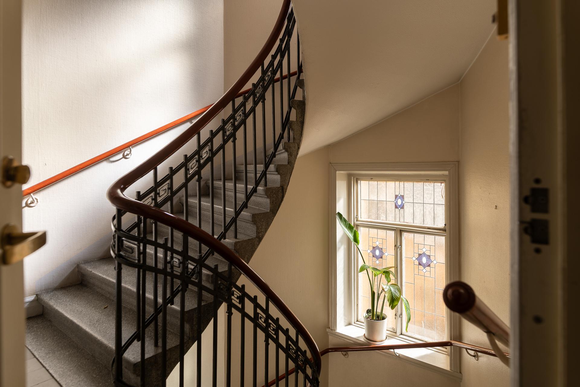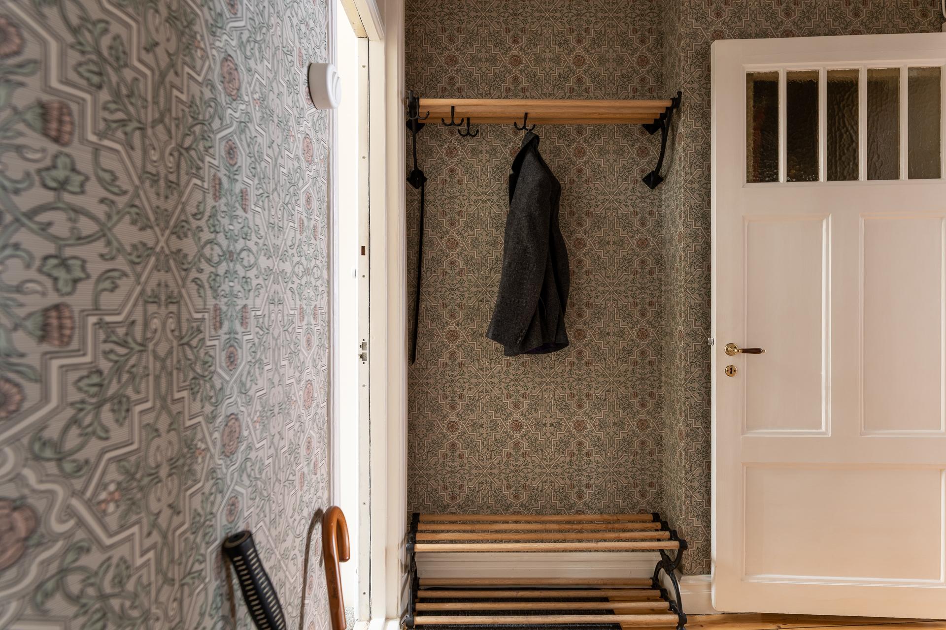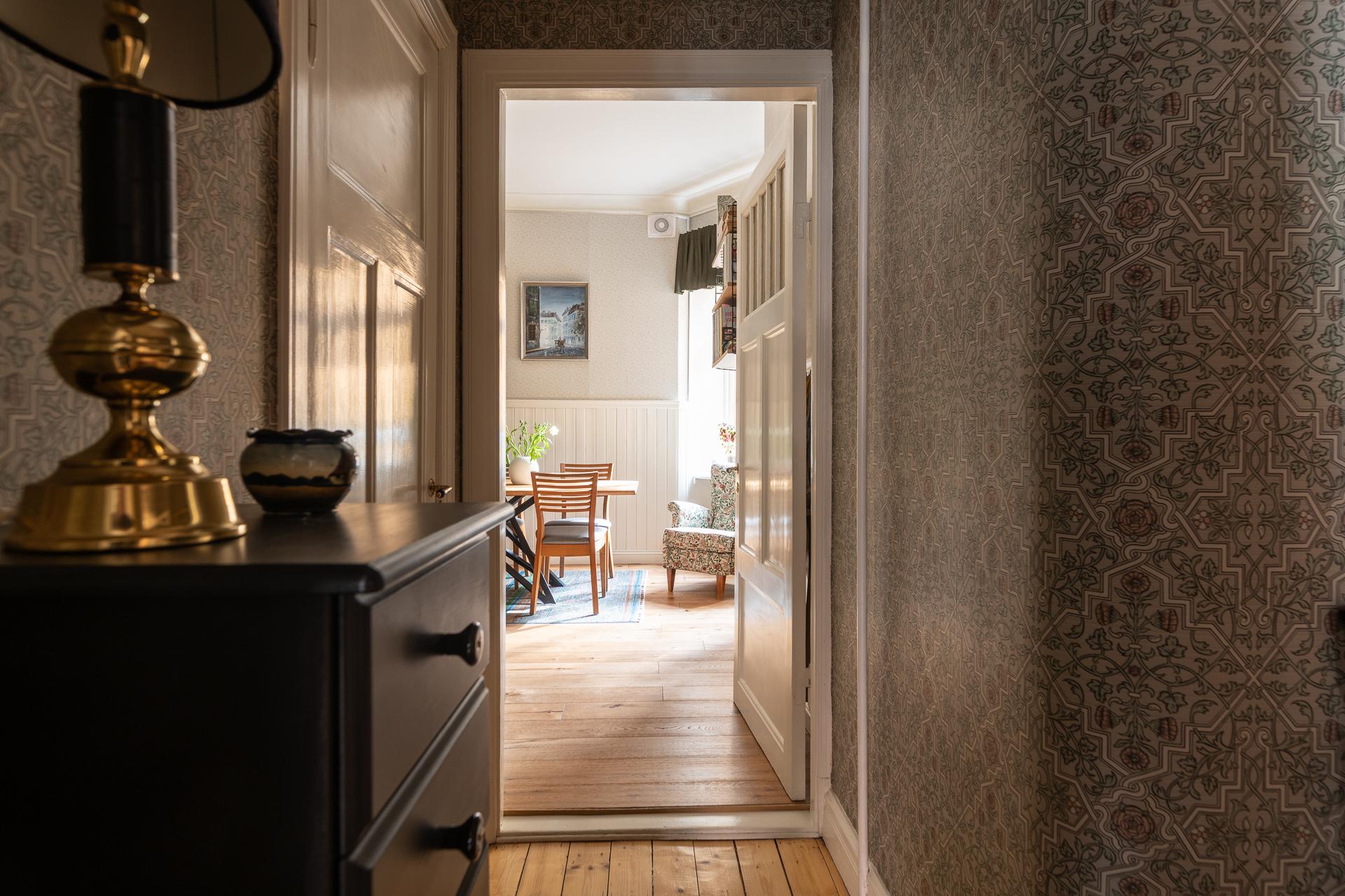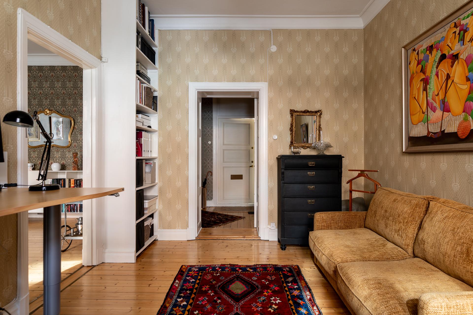 Genom den vackra ytterporten kliver ni in och möts av en omedelbar tystnad och ett sällsynt lugn. Trapphuset är rymligt och leder er en rejäl trappa upp till bostaden, eller så tar ni hissen ifall ni kommer med tunga matkassar. Hallens oregelbundna form tillsammans med vyn mot de två rummen i fil ger en välkomnande känsla. Här finns plats för familjens kappor, skor och väskor och hallen leder er vidare till de två rummen i fil mot Kungsgatan, badrummet och köket. Önskar man så går det att stänga igen mot sovrummet och platsbygga en bokhylla eller en garderob vilket andra lägenheter i huset har gjort. Tapeten (2025) från Engelska tapetmagasinet gör ett starkt första intryck och väcker en nyfikenhet att se mer. Taket målades 2025 och samtidigt sattes en ny stuckatur in.