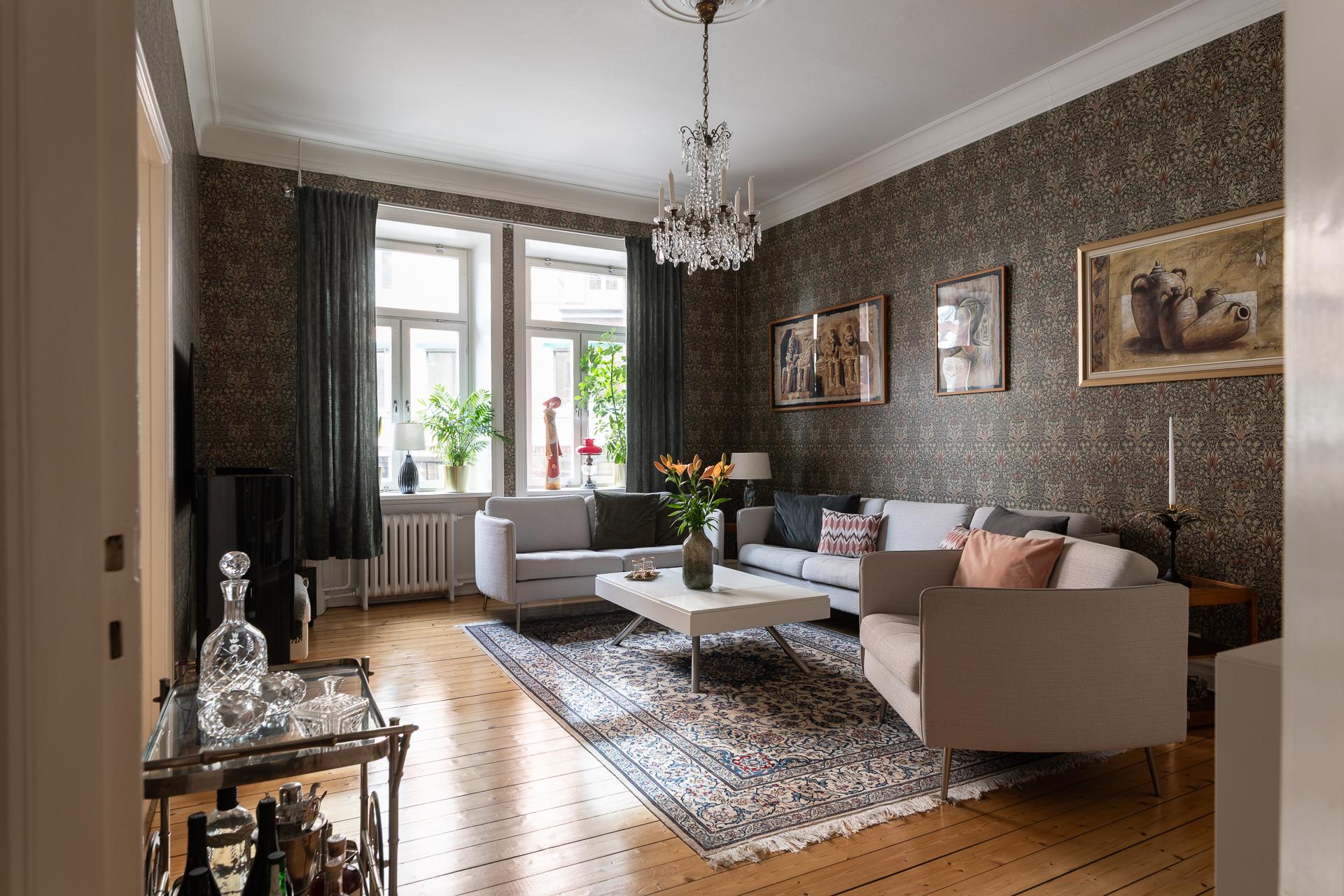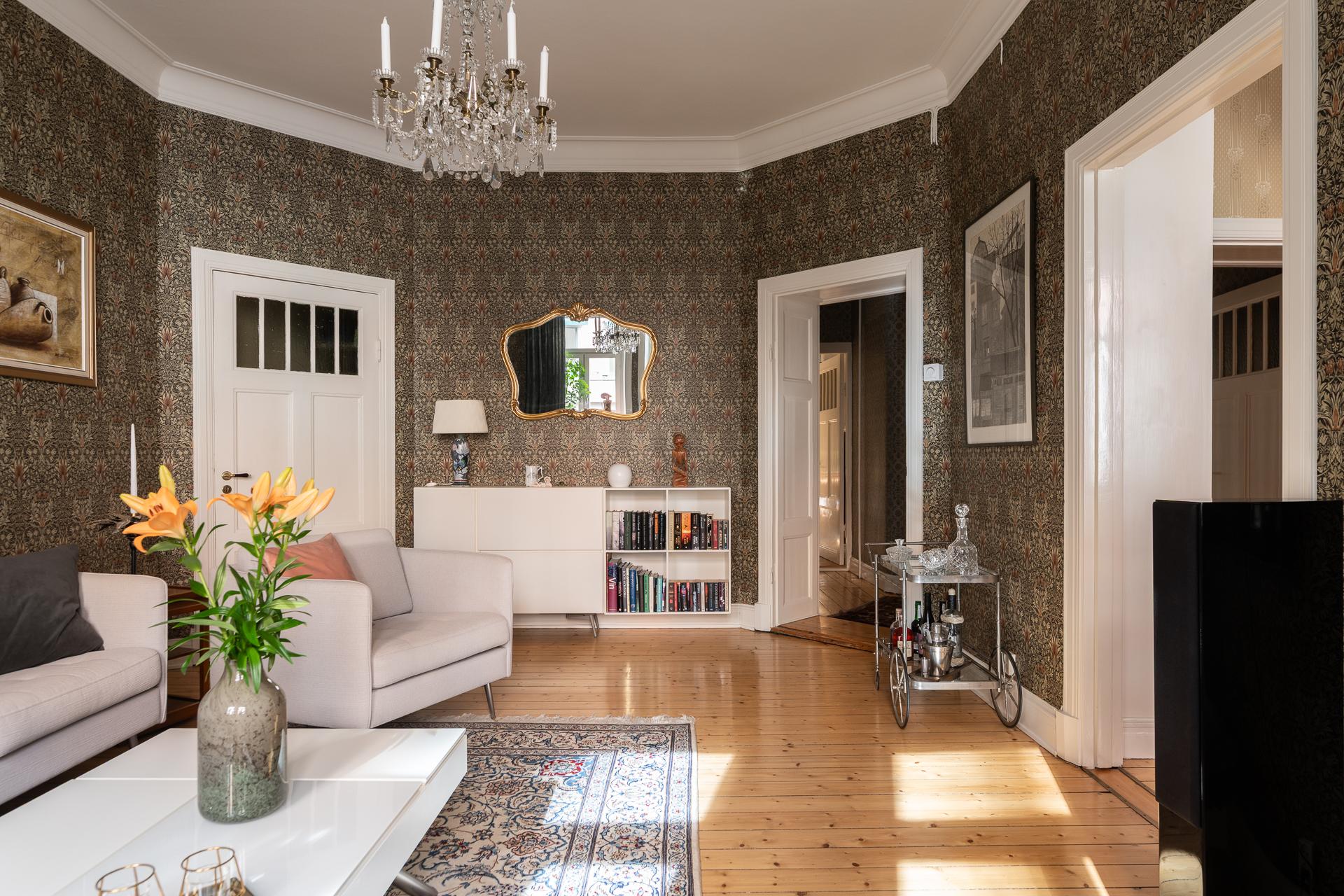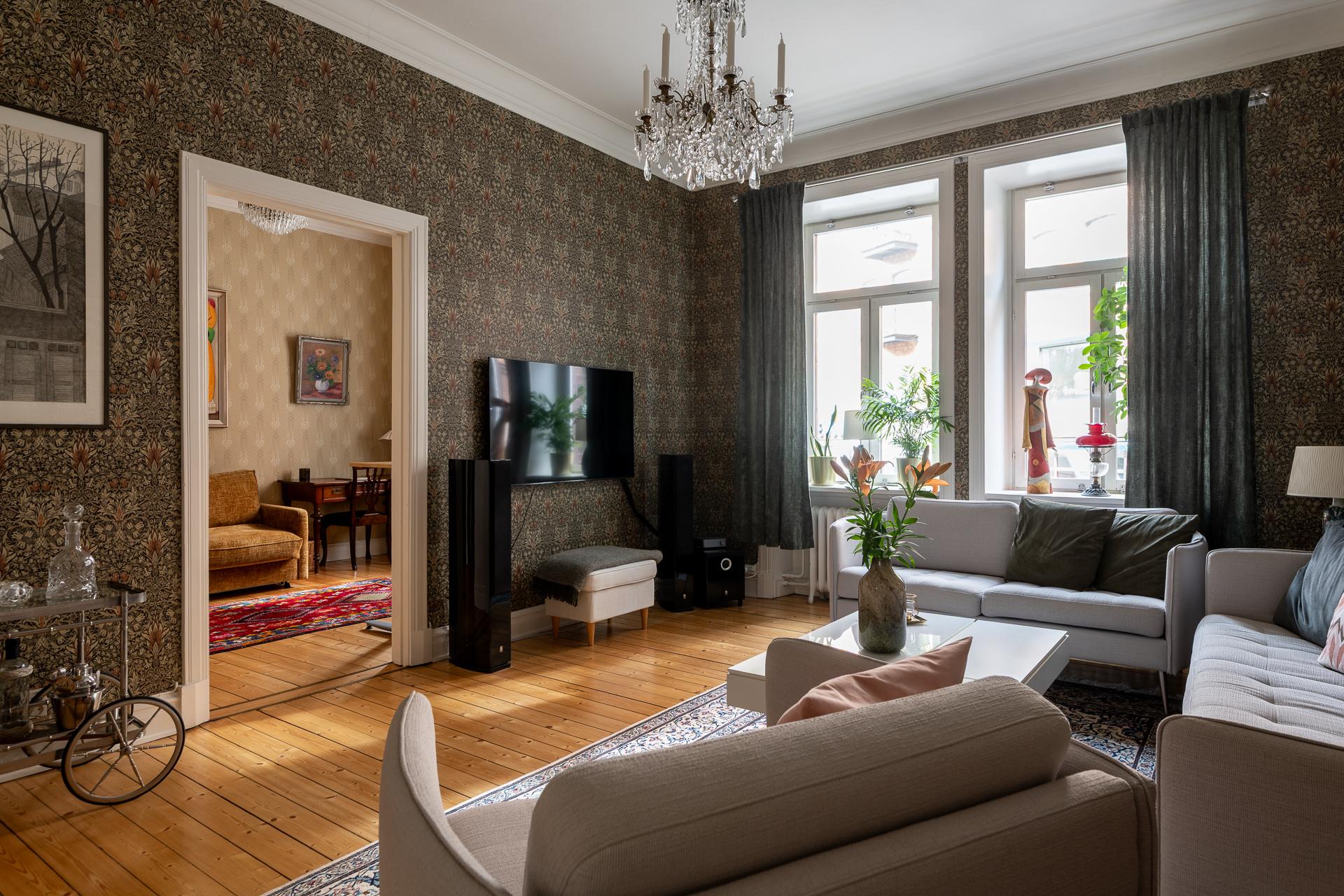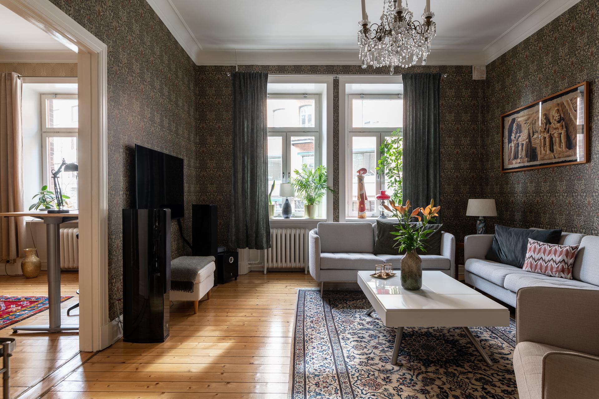 Från hallen når ni vardagsrummet som imponerar med sin rymd och elegans. Takhöjden mäter stolta 315 centimeter och två stora fönsterpartier med överljus släpper in dagsljuset. Det finns mycket att gilla här och det är inte helt enkelt att avgöra vad man tycker om allra mest. Gjutjärnsradiatorerna som skänker både estetik och värme, de nätta stuckaturerna och takrosetten, brädgolven i original eller alla detaljerade och välbevarade snickerier. Allt bidrar till den goa känslan man eftersträvar i en pampig fastighet från 1909. Här rymmer ni enkelt en större soffgrupp, fåtöljer och en tv-möbel. I rummet finns också en inbyggd klädkammare där man nyligen förberett för att kunna ha en tvättmaskin. 2024 målades tak och fönsternischer samtidigt som väggarna tapetserades.