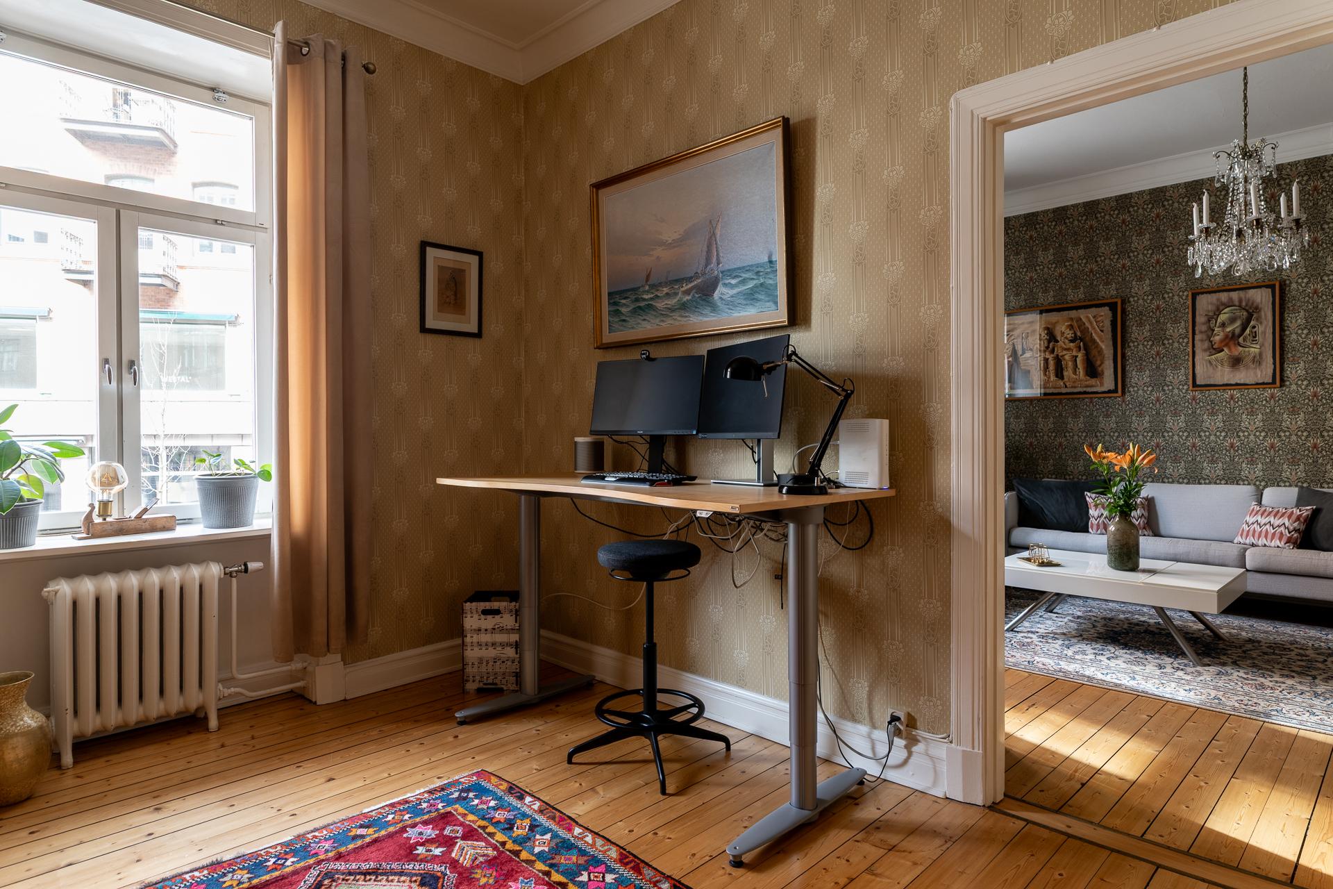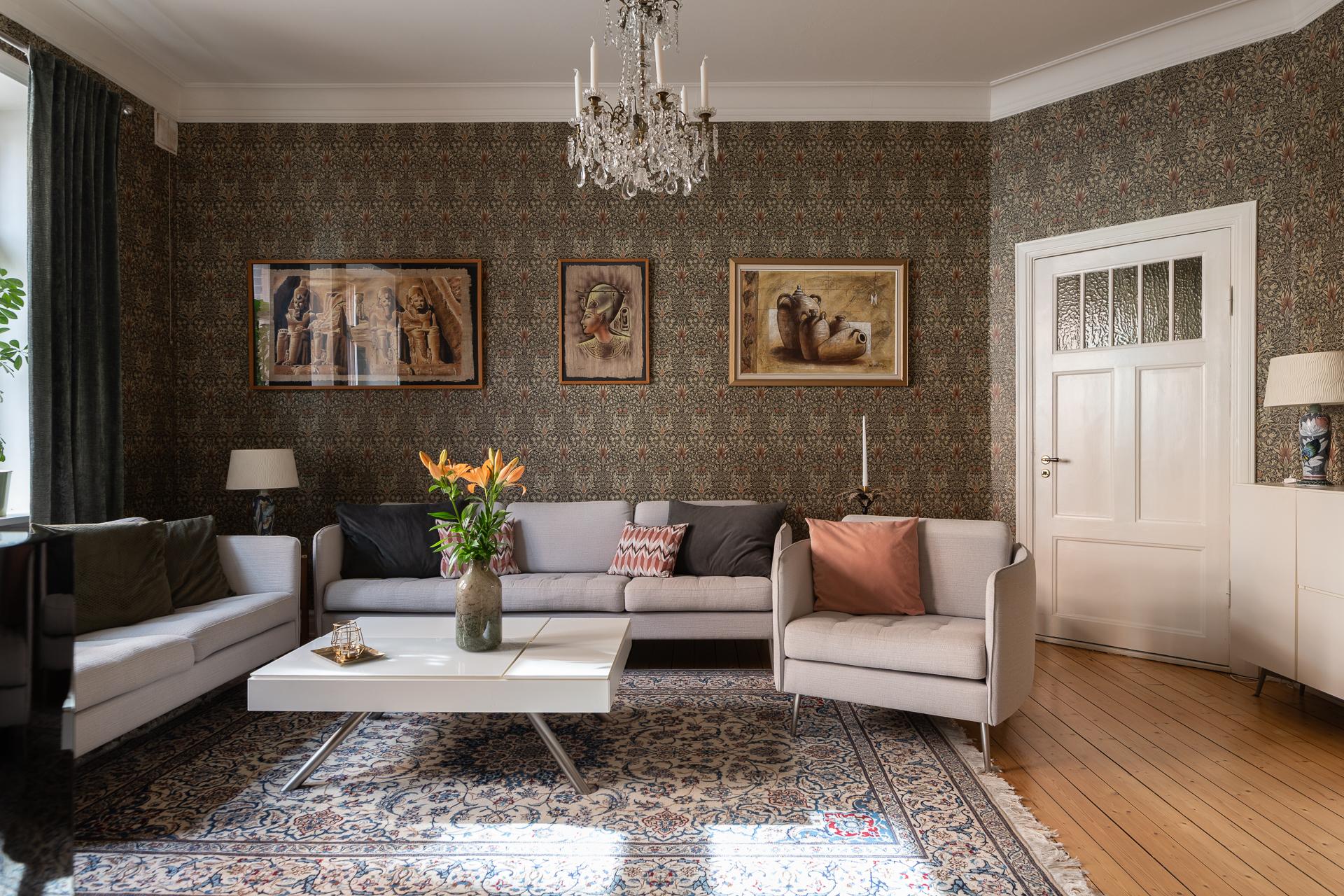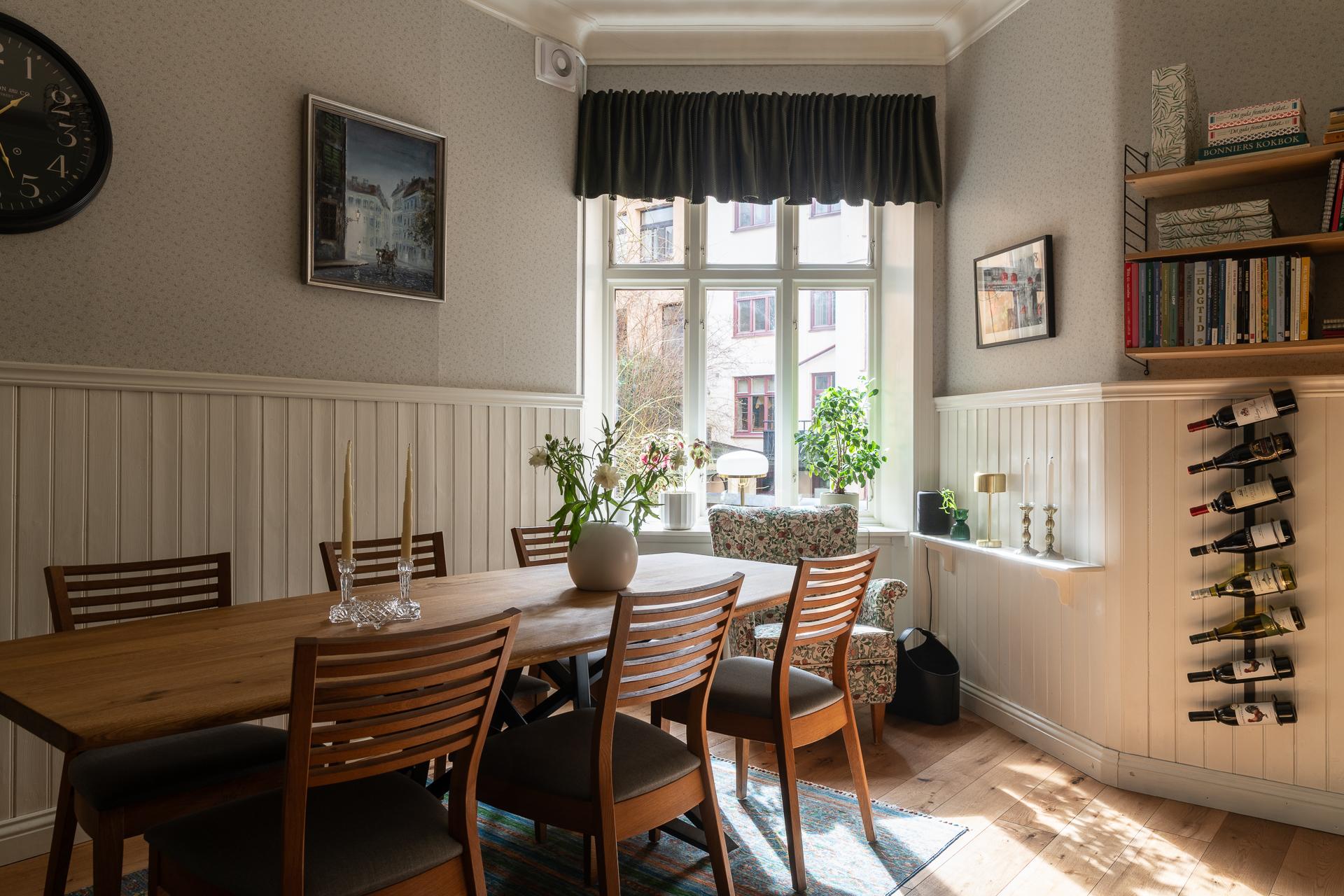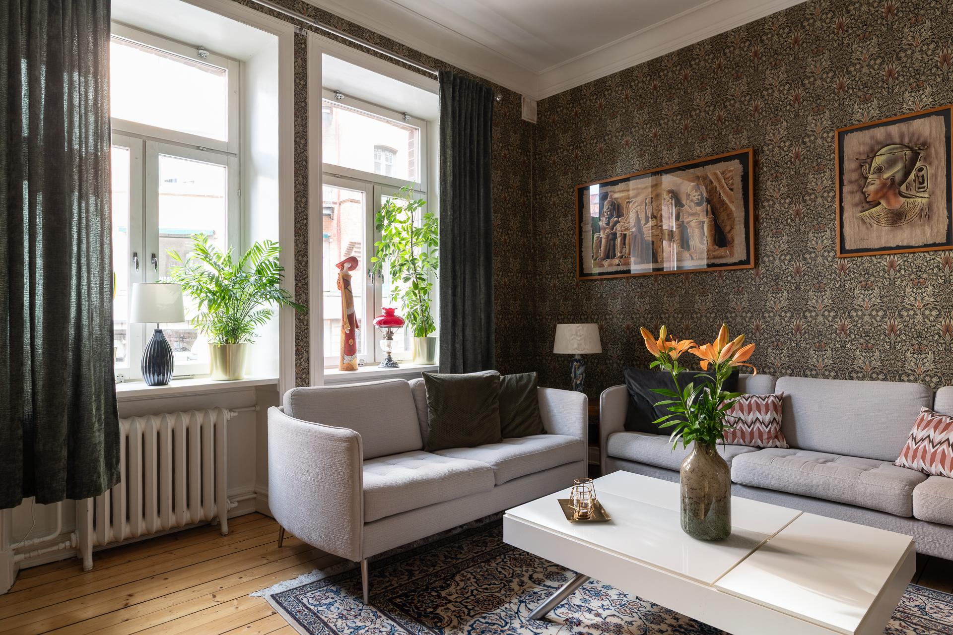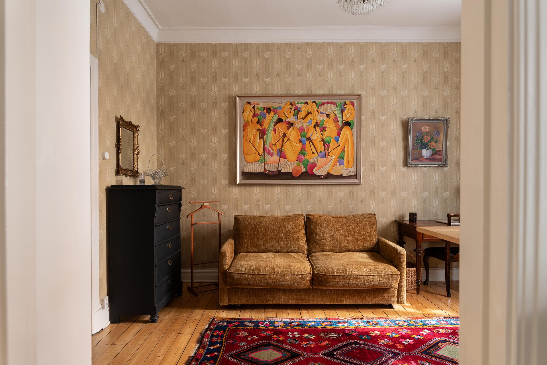 Från hallen når ni vardagsrummet som imponerar med sin rymd och elegans. Takhöjden mäter stolta 315 centimeter och två stora fönsterpartier med överljus släpper in dagsljuset. Det finns mycket att gilla här och det är inte helt enkelt att avgöra vad man tycker om allra mest. Gjutjärnsradiatorerna som skänker både estetik och värme, de nätta stuckaturerna och takrosetten, brädgolven i original eller alla detaljerade och välbevarade snickerier. Allt bidrar till den goa känslan man eftersträvar i en pampig fastighet från 1909. Här rymmer ni enkelt en större soffgrupp, fåtöljer och en tv-möbel. I rummet finns också en inbyggd klädkammare där man nyligen förberett för att kunna ha en tvättmaskin. 2024 målades tak och fönsternischer samtidigt som väggarna tapetserades.
