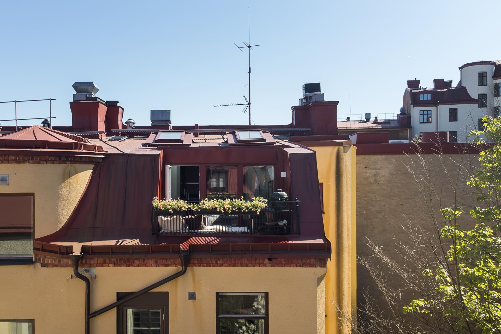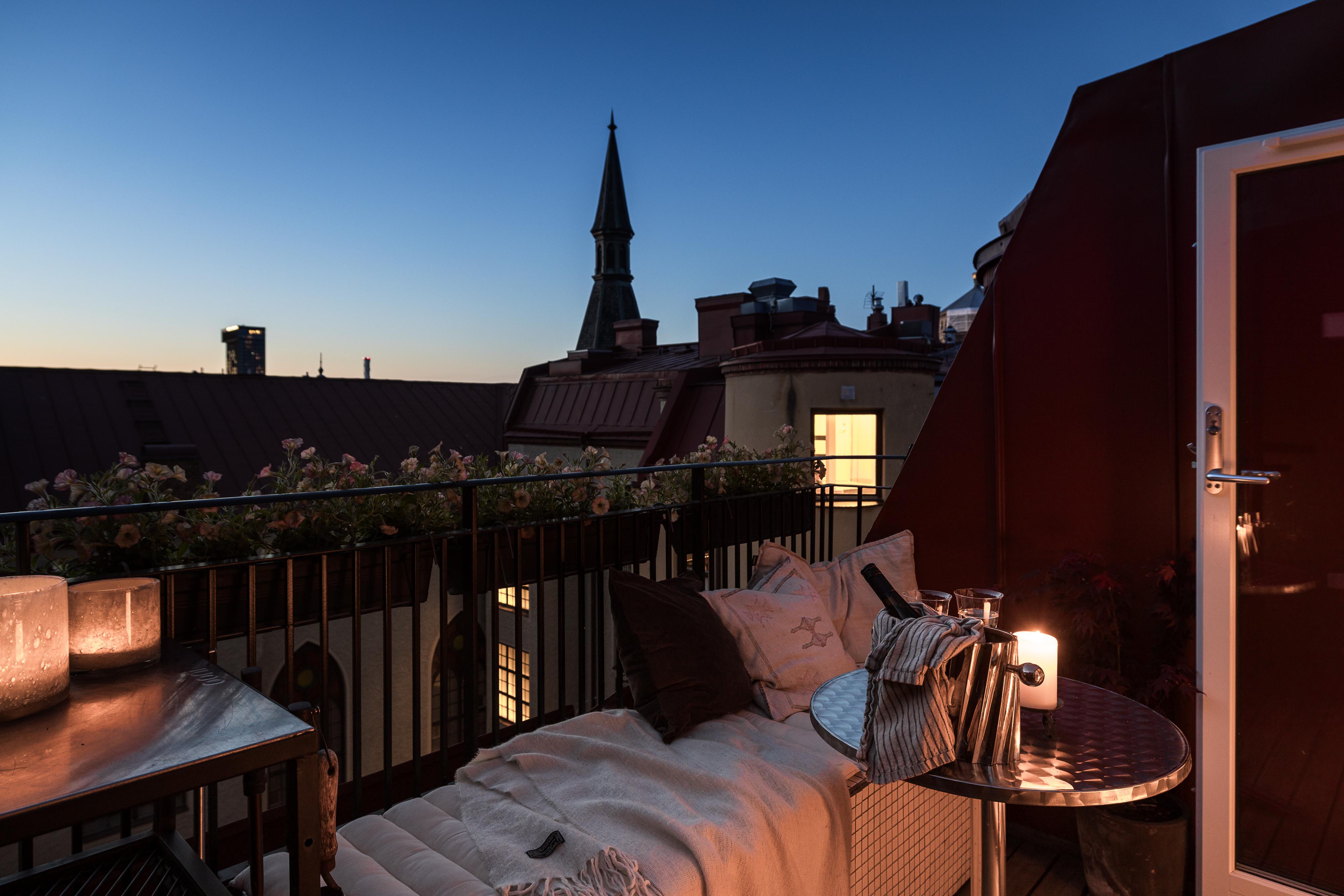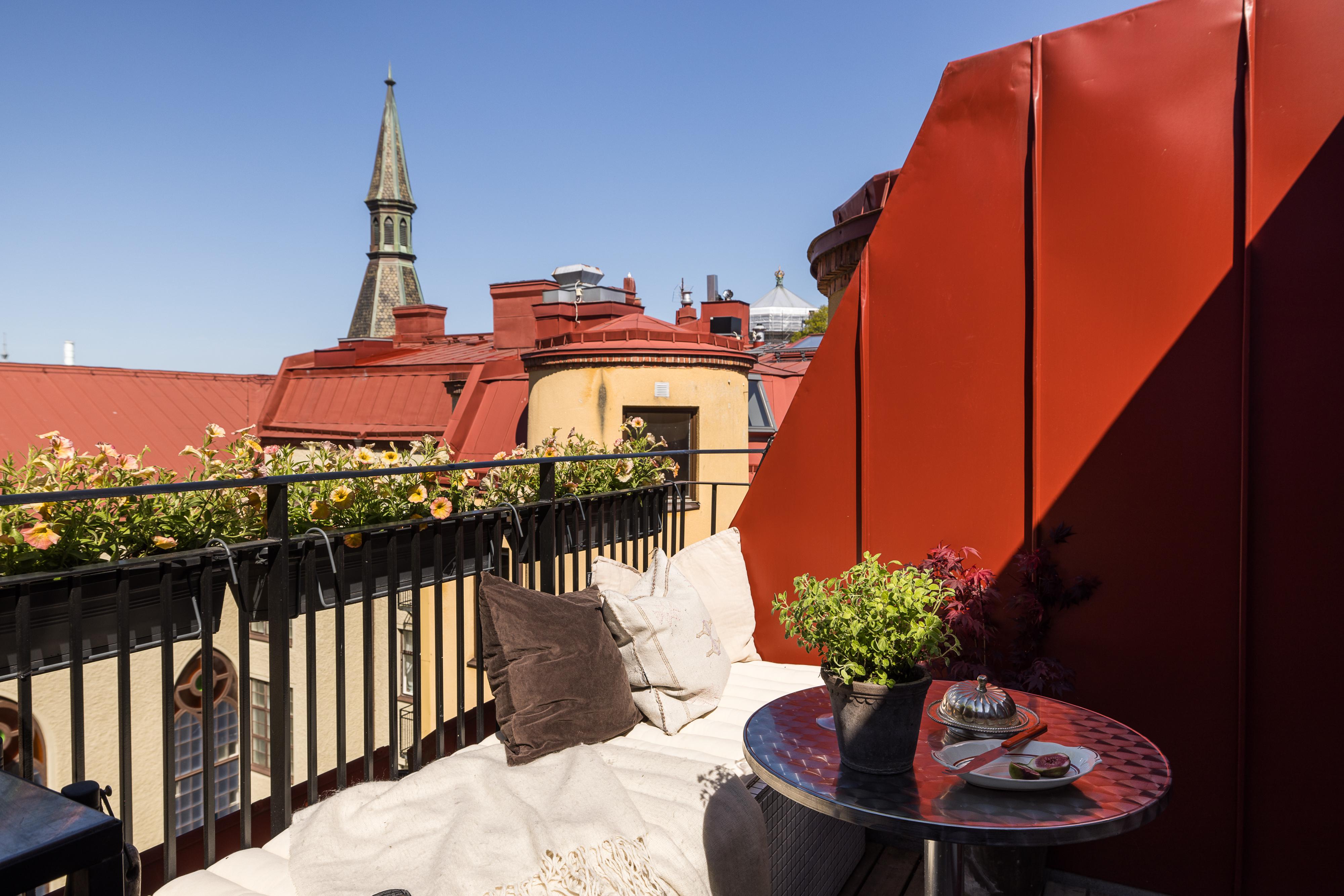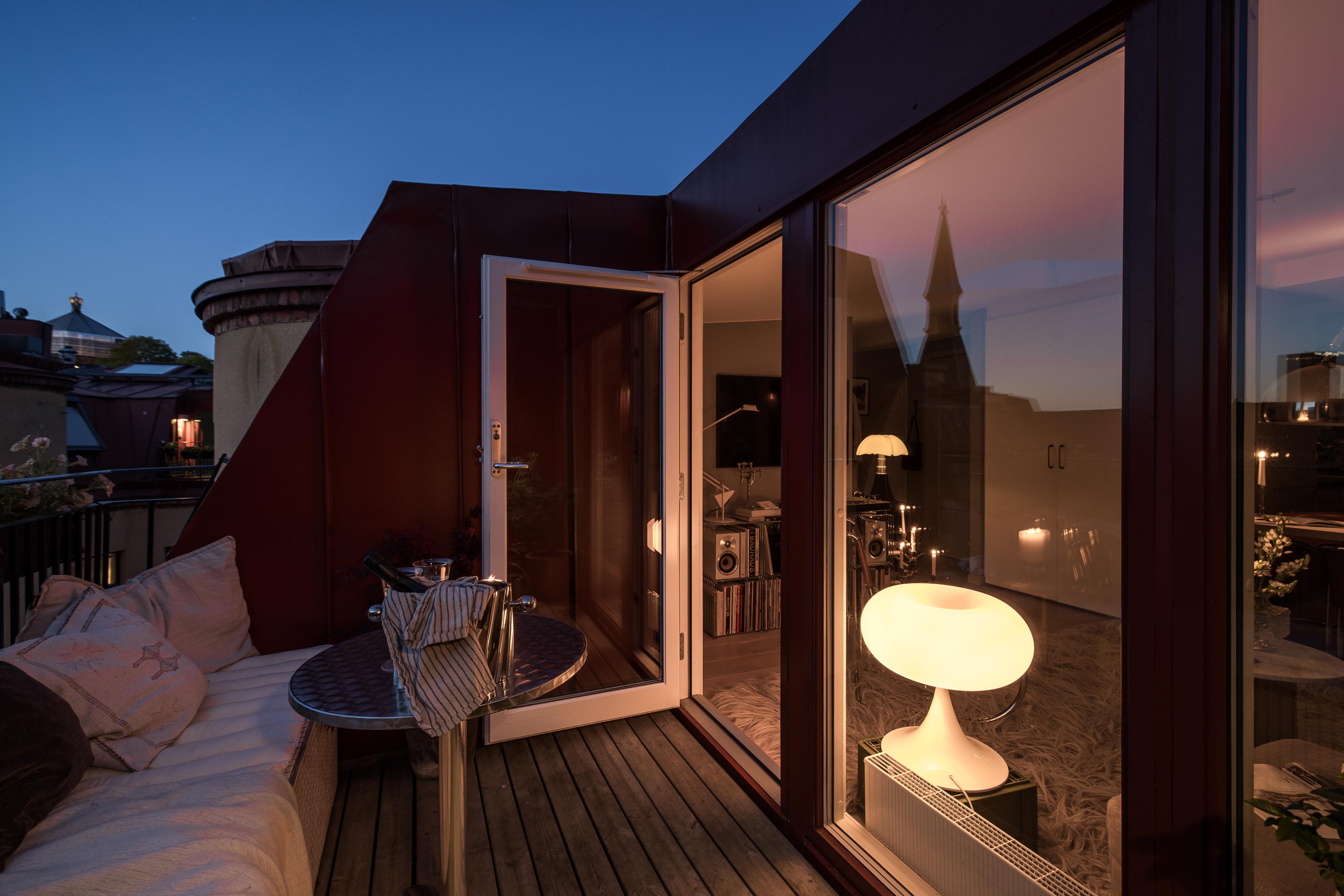 - Balkong/Uteplats: Ja. Stor terrass med vidunderlig utsikt över Linnés takåsar.